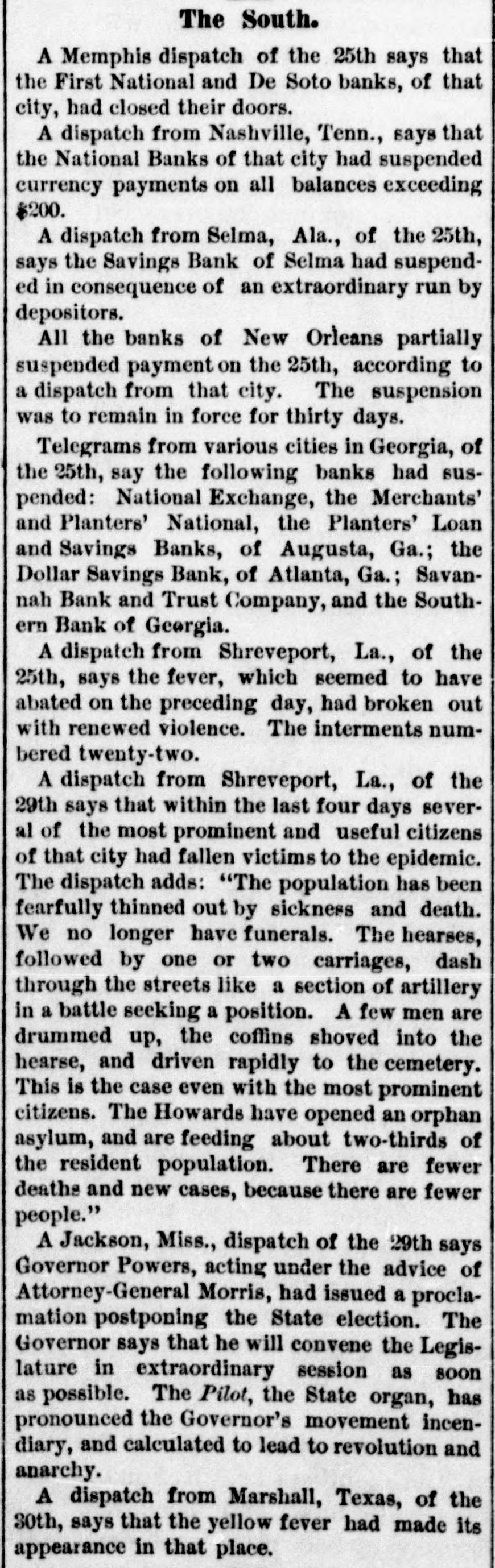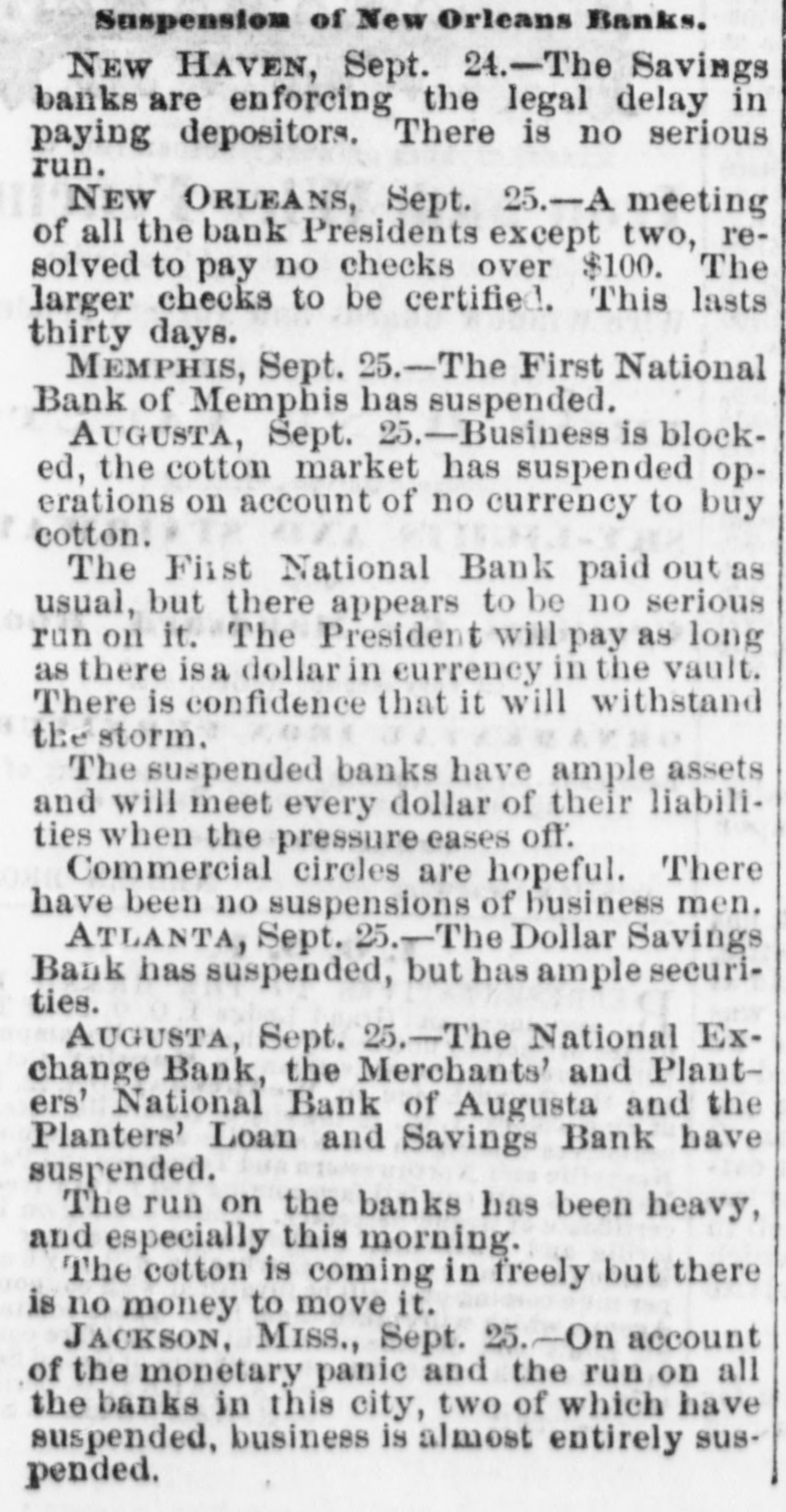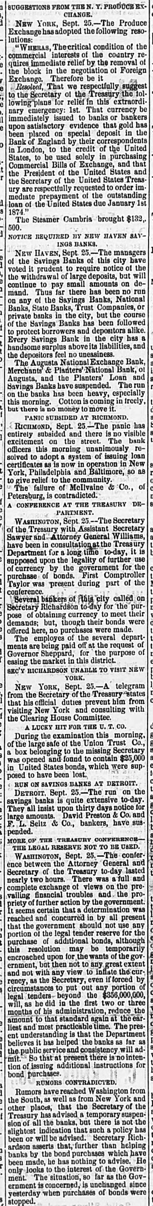 MEMPHIS, TENN FRIDAY, SEPTEMBER 26, 187 "Erle" in Lone IS SHREVEPORT. very much as usual. A meeting of several has helped the banks as far as public serLONDON, September 25. vice and consistency will admit. So dry-goods men was held at Claflin's called by President Wats that at present there is no intention of last week, at which they resolved to of the affairs of the Erie stand by each other. It was agreed to issuing additional Instructions for bondThe Fever Spreading in Town and purchasers. Rumors at Washington deposit as usual with their bankers, an place to-day, and was att Country-The I eaths Yesterday 4. from the south, as well as from New arrangement having been affected sands of persons, many -List of Deceased. e ing present. The meeti York and other places, say the secrewhereby they can draw what money n as stormy. A resolution tary of the treasury has advised the they require for business purposes, as Watson was adopted, an temporary suspension of all banks, but heretofore. The arrangement has been The Physicians to Report on the Origin there is not the slightest indication that Bischoffshar and Henry found to work satisfactorily for all of the Fever - Destitution as such policy has been or will be advised. parties concerned. 5, with a storm of mingle Terrible as the Disease. Secretary Richardson asserts that furcheers. Watson, in exp THE PRODUCE MARKET. e. ther than helping the banks by bond affairs of the company, A general conversation with dealers was some apparent dubi purchases, which have been made, he At the produce exchange to-day, shows THE TOWN A HOSPITAL. the accounts, but he belief has nothing to advise, and only looks to n that the market for flour, breadstuffs, the interests of the government. The correct. They wanted LITTLE Rock, September -Parties e petroleum and naval stores remains in situation, so far as the government is immediately to finish the from Shreveport, who left yesterday, reh a nominal state. Dealers cannot act inconcerned, is unchanged since the close already commenced, and port the fever abating very little if any. telligently or make future contracts rail. of business yesterday, when purchases It is now extending out in the country. e while the present uncertainty continue, of bonds were stopped. The arrival of Those who are left in the afflicted city d consequently transaction are limg the President to-night may possibly reare almost completely broken down. MARRIED ced. The grain trade is extremely sult in additional instruction, but this The town is a hospital, no business is quiet, and the absence of a market at present is merely problematical. The attempted to be done, and nurses are for commercial exchange is checkFOWLER-MILLER-At 1 cabinet meeting to-morrow will have badly needed. ing business to a great extent. Samuel Miller, No. 173 Alal the weight of financial matters for geneINTERMENTS YESTERDAY. On this account dealers are unRev. Father Walsh, on Th n ral consideration and the action by the able to dispose of their merchandise to SHREVEPORT, September 25.-InterSeptember 25th, Mr. JOSE H (heads of the government department. shippers, and the current has set back to Miss EFFIE MILLER, all of th ments to-day: Chris. Reamerty, 35; y Intense interest is felt in the result, and the west. Dow Looney, 50; C. M. Brown; Mrs. d no officials here have any idea that there Mary Calhoun, 35; Garror, 45; M. J. will be a called session of congress with DIED. [BY MAIL.] Austin, 6; F. J. Curtis, 5; John a view to relieve financial difficulties. REMOTE CAUSES OF THE PANIC. Stewart, colored; Mrs. Swanson, 65; THE LEGALITY OF FURTHER USE OF MADDEN-Thursday, Sep Colonel E. L. Terrey; T. Heffner, 38; From the New York Tribune.] CURRENCY. CATHARINE, only daughter ic McSweeney, age 35; Joe Delacroix, age Eliza Madden, aged eleven Before we apply desperate remedies in WASHINGTON, September 25.-The months. 35; Albert TurLer, colored, age 35; Vicwe should understand the nature of the e secretary of the treasury with Assistanttoria Holmer, colored, age 14; infant, Friends and acquaintance disease. We have maintained and still y are invited to attend the I Secretary Sawyer and Attorney-General colored, age 4; Paul Myers, colered, age insist that an inflation of the legal-teng Williams, have been in consultation at Ju. Williams, colored, age 28; Mrs. o'clock this (FRIDAY) after der circulation is no cure for the malady n the treasury department for a long time residence, 128 Front street. M. Preseott, age 52. There were two which afflicts us. This will appear if 2, to-day; it is supposed upon the legality interments outside of the city limits, but HOULIGHAN-At his re we go back and examineinto the remote 7. of further use of currency by the governthe Sisters of Charity were unable to asJackson street, Thursday aft causes-not so very remote, after aller25th, at half-past three o'e , ment for the purchase of bonds. Firstcertain their names; also an unknown which have produced the present state LIGHAN, aged forty-seven yea Swede. Comptroller Taylor was present during of things. We are bound to suffer for Funeral will take place fro INCREASING. a part of the conference. Several bankour follies. Inflation may postpone for 1 this (FRIDAY) morning at ets of this city called on Secretary The fever, which seemed to have a short time the day of reckoning, but friends and acquaintances d Richardson to-day for the purpose of oba abated yesterday, broke out with inthat day will surely come. The trouble invited to attend. taining currency to meet their demands, e with us is our immense mass of increased energy last night, and this PRINCE-The funeral of I but though bonds were offered here, no y morning many new cases occurred in debtedness, both foreign and domestwill take place at Alabama purchases were made. d ic. It must never be forgetten that the city and suburbs. Among the corner of Jones avenue, this ( 1. THE AUGUSTA, GA., BANKS. by far the larger part of that inpromineu