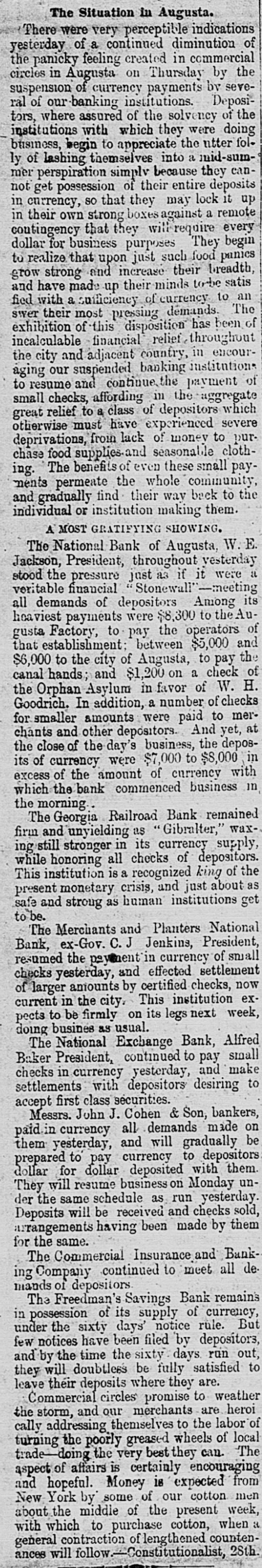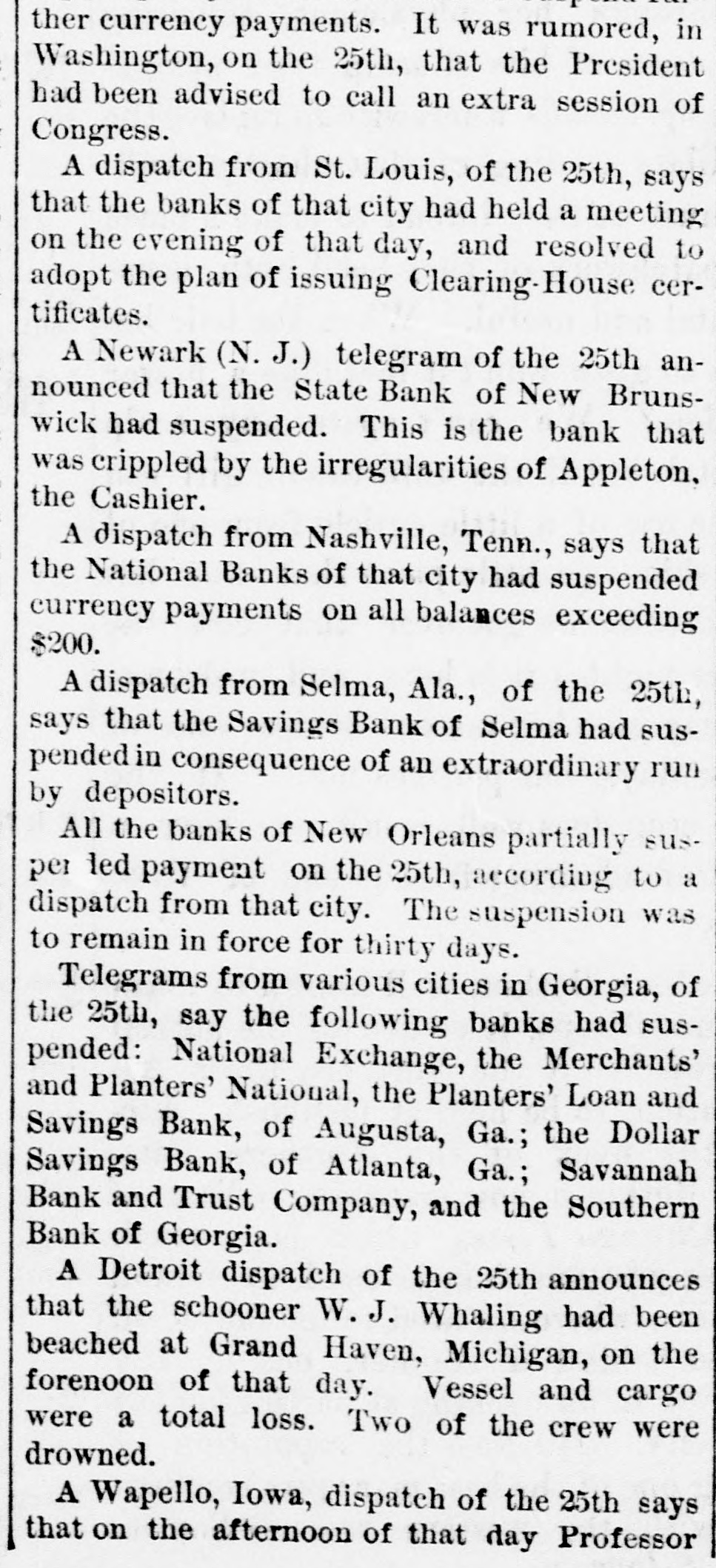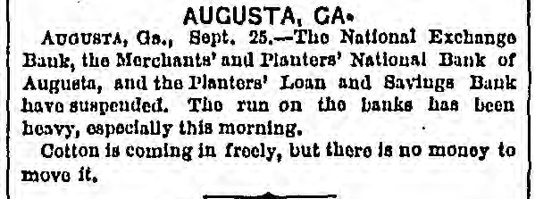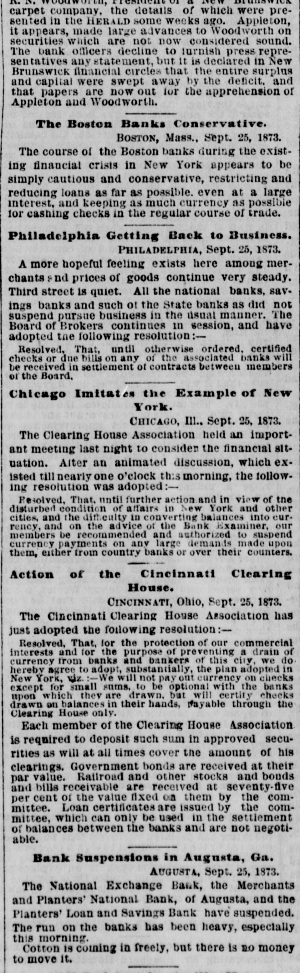 MEMPHIS, TENN FRIDAY, SEPTEMBER 26, 187 "Erle" in Lone IS SHREVEPORT. very much as usual. A meeting of several has helped the banks as far as public serLONDON, September 25. vice and consistency will admit. So dry-goods men was held at Claflin's called by President Wats that at present there is no intention of last week, at which they resolved to of the affairs of the Erie stand by each other. It was agreed to issuing additional Instructions for bondThe Fever Spreading in Town and purchasers. Rumors at Washington deposit as usual with their bankers, an place to-day, and was att Country-The I eaths Yesterday 4. from the south, as well as from New arrangement having been affected sands of persons, many -List of Deceased. e ing present. The meeti York and other places, say the secrewhereby they can draw what money n as stormy. A resolution tary of the treasury has advised the they require for business purposes, as Watson was adopted, an temporary suspension of all banks, but heretofore. The arrangement has been The Physicians to Report on the Origin there is not the slightest indication that Bischoffshar and Henry found to work satisfactorily for all of the Fever - Destitution as such policy has been or will be advised. parties concerned. 5, with a storm of mingle Terrible as the Disease. Secretary Richardson asserts that furcheers. Watson, in exp THE PRODUCE MARKET. e. ther than helping the banks by bond affairs of the company, A general conversation with dealers was some apparent dubi purchases, which have been made, he At the produce exchange to-day, shows THE TOWN A HOSPITAL. the accounts, but he belief has nothing to advise, and only looks to n that the market for flour, breadstuffs, the interests of the government. The correct. They wanted LITTLE Rock, September -Parties e petroleum and naval stores remains in situation, so far as the government is immediately to finish the from Shreveport, who left yesterday, reh a nominal state. Dealers cannot act inconcerned, is unchanged since the close already commenced, and port the fever abating very little if any. telligently or make future contracts rail. of business yesterday, when purchases It is now extending out in the country. e while the present uncertainty continue, of bonds were stopped. The arrival of Those who are left in the afflicted city d consequently transaction are limg the President to-night may possibly reare almost completely broken down. MARRIED ced. The grain trade is extremely sult in additional instruction, but this The town is a hospital, no business is quiet, and the absence of a market at present is merely problematical. The attempted to be done, and nurses are for commercial exchange is checkFOWLER-MILLER-At 1 cabinet meeting to-morrow will have badly needed. ing business to a great extent. Samuel Miller, No. 173 Alal the weight of financial matters for geneINTERMENTS YESTERDAY. On this account dealers are unRev. Father Walsh, on Th n ral consideration and the action by the able to dispose of their merchandise to SHREVEPORT, September 25.-InterSeptember 25th, Mr. JOSE H (heads of the government department. shippers, and the current has set back to Miss EFFIE MILLER, all of th ments to-day: Chris. Reamerty, 35; y Intense interest is felt in the result, and the west. Dow Looney, 50; C. M. Brown; Mrs. d no officials here have any idea that there Mary Calhoun, 35; Garror, 45; M. J. will be a called session of congress with DIED. [BY MAIL.] Austin, 6; F. J. Curtis, 5; John a view to relieve financial difficulties. REMOTE CAUSES OF THE PANIC. Stewart, colored; Mrs. Swanson, 65; THE LEGALITY OF FURTHER USE OF MADDEN-Thursday, Sep Colonel E. L. Terrey; T. Heffner, 38; From the New York Tribune.] CURRENCY. CATHARINE, only daughter ic McSweeney, age 35; Joe Delacroix, age Eliza Madden, aged eleven Before we apply desperate remedies in WASHINGTON, September 25.-The months. 35; Albert TurLer, colored, age 35; Vicwe should understand the nature of the e secretary of the treasury with Assistanttoria Holmer, colored, age 14; infant, Friends and acquaintance disease. We have maintained and still y are invited to attend the I Secretary Sawyer and Attorney-General colored, age 4; Paul Myers, colered, age insist that an inflation of the legal-teng Williams, have been in consultation at Ju. Williams, colored, age 28; Mrs. o'clock this (FRIDAY) after der circulation is no cure for the malady n the treasury department for a long time residence, 128 Front street. M. Preseott, age 52. There were two which afflicts us. This will appear if 2, to-day; it is supposed upon the legality interments outside of the city limits, but HOULIGHAN-At his re we go back and examineinto the remote 7. of further use of currency by the governthe Sisters of Charity were unable to asJackson street, Thursday aft causes-not so very remote, after aller25th, at half-past three o'e , ment for the purchase of bonds. Firstcertain their names; also an unknown which have produced the present state LIGHAN, aged forty-seven yea Swede. Comptroller Taylor was present during of things. We are bound to suffer for Funeral will take place fro INCREASING. a part of the conference. Several bankour follies. Inflation may postpone for 1 this (FRIDAY) morning at ets of this city called on Secretary The fever, which seemed to have a short time the day of reckoning, but friends and acquaintances d Richardson to-day for the purpose of oba abated yesterday, broke out with inthat day will surely come. The trouble invited to attend. taining currency to meet their demands, e with us is our immense mass of increased energy last night, and this PRINCE-The funeral of I but though bonds were offered here, no y morning many new cases occurred in debtedness, both foreign and domestwill take place at Alabama purchases were made. d ic. It must never be forgetten that the city and suburbs. Among the corner of Jones avenue, this ( 1. THE AUGUSTA, GA., BANKS. by far the larger part of that inpromineu
