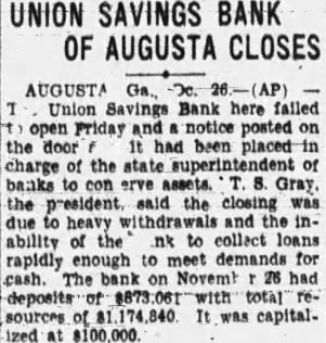 UNION SAVINGS BANK OF AUGUSTA CLOSES AUGUSTA Ga. Union Savings Bank here failed Friday on the had been placed in charge the state of banks con the said the closing was due to heavy and the ability the nk collect loans rapidly enough to demands for The Novemb had total It was capital. ized $100,000.