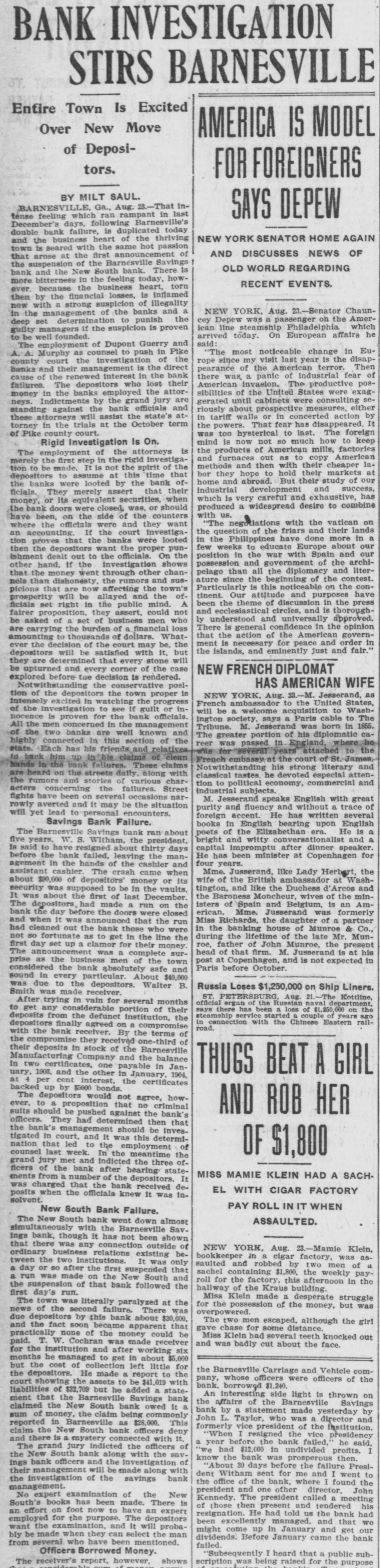 BANK INVESTIGATION STIRS BARNESVILLE Entire Town Is Excited Over New Move AMERICA IS MODEL of Depositors. FOR FOREIGNERS BY MILT SAUL. BARNESVILLE, Ga., Aug. 23.-That inSAYS DEPEW tense feeling which ran rampant in last December's days, following Barnesville's double bank failure, is duplicated today NEW YORK SENATOR HOME AGAIN and the business heart of the thriving town is seared with the same hot passion AND DISCUSSES NEWS OF that arose at the first announcement of the suspension of the Barnesville Savings OLD WORLD REGARDING bank and the New South bank. There is more bitterness in the feeling today, howRECENT EVENTS. ever. because the business heart, torn then by the financial losses, is inflamed now with a strong suspicion of illegality NEW YORK, Aug. 23.-Senator Chaunin the management of the banks and a cey Depew was a passenger on the Amerdeep set determination to punish the ican line steamship Philadelphia which guilty managers if the suspicion is proven arrived today. On European affairs he be well to founded. said: The employment of Dupont Guerry and "The most noticeable change in EuA.A. Murphy as counsel to push in Pike rope since my visit last year is the disapcounty court the investigation of the banks and their management is the direct pearance of the American terror. Then there was, a panic of industrial fear of cause of the renewed interest in the bank American invasion. The productive posfailures. The depositors who lost their sibilities of the United States were exagmoney in the banks employed the attorneys. Indictments by the grand jury are gerated until cabinets were consulting seriously about prospective measures, either standing against the bank officials and in tariff walls or in concerted action by these attorneys will assist the state's atthe powers. That fear has disappeared. It torney in the trials at the October term of Pike county court. was too hysterical to last. The foreign mind is now not so much how to keep Rigid Investigation Is On. the products of American mills, factories The employment of the attorneys is and furnaces out as to copy American merely the first step in the rigid investigamethods and then with their cheaper lation to be made. It is not the spirit of the bor they hope to hold their markets at depositors to assume at this time that home and abroad. But their study of our the banks were looted by the bank ofindustrial development and success, ficials. They merely assert that their which is very careful and exhaustive, has money, or its equivalent securities, when produced a widespread desire to combine the bank doors were closed, was, or should with us. have been, on the side of the counters "The tiations with the vatican on where the officials were and they want the question of the friars and their lands an accounting. If the court investigain the Philippines have done more in a tion proves that the banks were looted few weeks to educate Europe about our then the depositors want the proper punposition in the war with Spain and our Ishment dealt out to the officials. On the possession and government of the archiother hand. if the investigation shows pelago than all the diplomacy and literthat the money went through other chanature since the beginning of the contest. nels than dishonesty, the rumors and susParticularly is this noticeable on the conpicions that are now affecting the town's tinent. Our attitude and purposes have prosperity will be allayed and the ofbeen the theme of discussion in the press ficials set right in the public mind. A and ecclesiastical circles, and is thoroughfairer proposition, they assert, could not ly understood and universally approved. be asked of a set of business men who There is general confidence in the opinion are carrying the burden of a financial loss that the action of the American governamounting to thousands of dollars. Whatment is necessary for peace and order in ever the decision of the court may be, the the Islands, and eminently just and fair. depositors will be satisfied with it, but they are determined that every stone will be upturned and every corner of the case NEW FRENCH DIPLOMAT explored before tue decision is rendered. HAS AMERICAN WIFE Notwithstanding the conservative position of the depositors the town proper is NEW YORK, Aug. 23.-M. Jesserand, as intensely excited in watching the progress French ambassador to the United States, of the investigation to see If guilt or inwill be a welcome acquisition to Washnocence is proven for the bank officials. ington society, says a Paris cable to The All the men concerned in the management Tribune. M. Jesserand was born in 1855. of the two banks are well known and The greater portion of his diplomatic cahighly connected in this section of the reer was passed in England, where he state. Each has his friends and relatives. was for several years attached to the to back him claims of clean French embassy at the court of St. James. hands in the bank failures. These claims his strong literary and are heard on the streets daily, along with classical tastes. he devoted especial attenthe rumors and stories of various chartion to political economy, commercial and acters concerning the failures. Street Industrial subjects. fights have been on several occasions narM. Jesserand speaks English with great rowly averted and It may be the situation purity and fluency and without a trace of will yet lead to personal encounters. foreign accent. He has written several Savings Bank Failure. books in English bearing upon English The Barnesville Savings bank ran about poets of the Elizabethan era. He is a bright and witty conversationalist and a five years. W. S. Witham. the president, capital impromptu after dinner speaker. is said to have resigned about thirty days He has been minister at Copenhagen for before the bank failed, leaving the manfour years. agement in the hands of the cashier and Mme. Jusserand, like Lady Herbert, the assistant cashier. The crash came when 