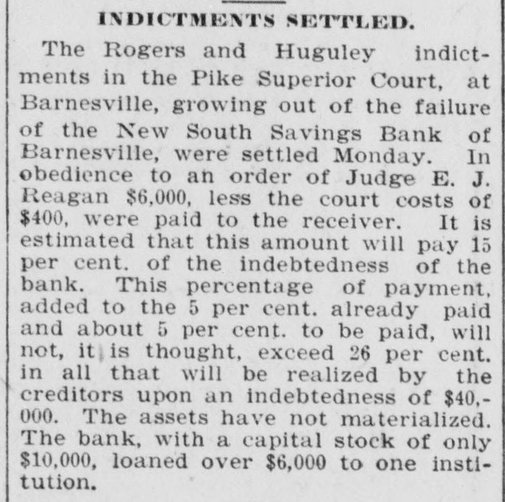 INDICTMENTS SETTLED. The Rogers and Huguley indictments in the Pike Superior Court, at Barnesville, growing out of the failure of the New South Savings Bank of Barnesville, were settled Monday. In obedience to an order of Judge E. J. Reagan $6,000, less the court costs of $400, were paid to the receiver. It is estimated that this amount will pay 15 per cent. of the indebtedness of the bank. This percentage of payment, added to the 5 per cent. already paid and about 5 per cent. to be paid, will not, it is thought, exceed 26 per cent. in all that will be realized by the creditors upon an indebtedness of $40,000. The assets have not materialized. The bank, with a capital stock of only $10,000, loaned over $6,000 to one institution.
