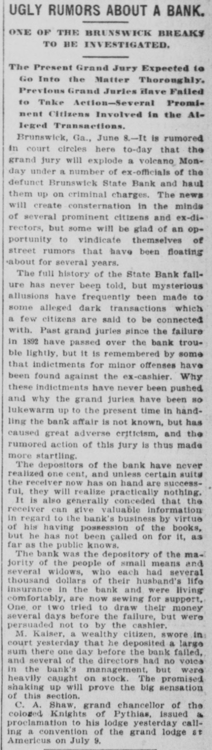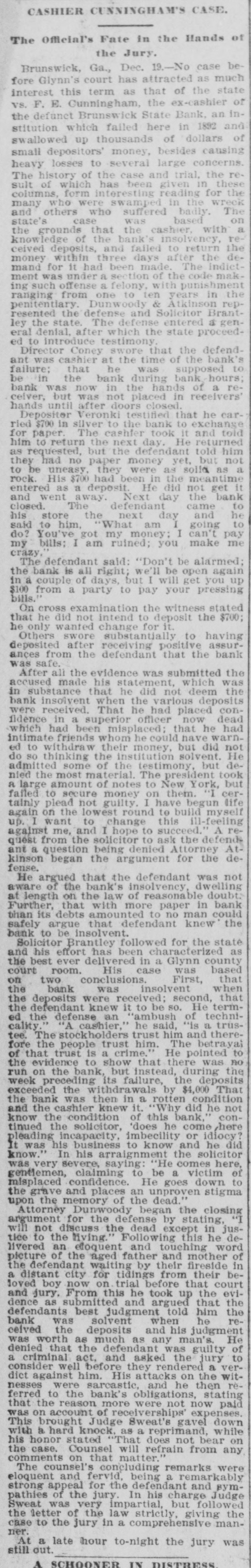 CASHIER CUNNINGHAM'S CASE. The Official's Fate in the Hands of the Jury. Brunswick, Ga., Dec. 19.-No case before Glynn's court has attracted as much interest this term as that of the state vs. F. E. Cunningham, the ex-cashier of the defunct Brunswick State Bank, an institution which failed here in 1892 and swallowed up thousands of dollars of small depositors' money, besides causing heavy losses to several large concerns. The history of the case and trial, the result of which has been given in these columns, form interesting reading for the many who were swamped in the wreck and others who suffered badly. The on state's case was based the grounds that the cashier with a knowledge of the bank's insolvency, received deposits, and failed to return the money within three days after the demand for it had been made. The indictment was under a section of the code making such offense a felony, with punishment ranging from one to ten years in the penitentiary. Dunwoody & Atkinson represented the defense and Solicitor Brantley the state. The defense entered a general denial, after which the state proceeded to introduce testimony. Director Coney swore that the defendant was cashier at the time of the bank's failure: that he was supposed to be in the bank during bank hours; bank was now in the hands of a receiver, but was not placed in receivers' hands until after doors closed. Depositor Veronki testified that he carried $700 in silver to the bank to exchange for paper. The cashfer took it and told him to return the next day. He returned as requested, but the defendant told him they had no paper money yet, but not to be uneasy, they were as solid as a rock. His $700 had been in the meantime entered as a deposit. He did not get it and went away. Next day the bank closed. The defendant came to his store the next day and he said to him. What am I going to do? You've got my money; I can't pay my bills: I am ruined; you make me crazy. The defendant said: "Don't be alarmed; the bank is all right; we'll be open again in a couple of days, but I will get you up $100 from a party to pay your pressing bills." On cross examination the witness stated that he did not intend to deposit the $700; he only wanted change for it. Others swore substantially to having deposited after receiving positive assurances from the defendant that the bank was safe. After all the evidence was submitted the accused made his statement, which was in substance that he did not deem the bank insolvent when the various deposits were received. That he had placed confidence in a superior officer now dead which had been misplaced; that he had intimate friends whom he could have warned to withdraw their money, but did not do SO thinking the institution solvent. He admitted some of the testimony, but denied the most material. The president took a large amount of notes to New York, but failed to secure money on them. "I certainly plead not guilty. I have begun life again on the lowest round to build myself up. I want to change this ill-feeling against me, and I hope to succeed.' A request from the solicitor to ask the defends ant a question being denied Attorney Atkinson began the argument for the defense. He argued that the defendant was not aware of the bank's insolvency, dwelling at length on the law of reasonable doubt: Further, that with more paper in bank than its debts amounted to no man could safely argue that defendant knew the bank to be insolvent. Solicitor Brantley followed for the state and his effort has been characterized as the best ever delivered in a Glynn county court room. His case was based on two conclusions. First, that the bank was insolvent when the deposits were received; second, that the defendant knew it to be so. He termed the defense an 'ambush of technicality "A cashier,' he said, "is a trustee. The stockholders trust him and therefore the people trust him. The betrayai of that trust is a crime. He pointed to the evidence to show that there was no run on the bank, but instead, during the week preceding its failure, the deposits exceeded the withdrawals by $4,000 That the bank was then in a rotten condition and the cashier knew it. "Why did he not know the condition of this bank, continued the solicitor, 'does he come here pleading incapacity, imbecility or idiocy It was his business to know and he did know In his arraignment the solicitor was very severe. saying: He comes here, gentlemen, claiming to be a victim of misplaced confidence. He goes down to the grave and places an unproven stigma upon the memory of the dead Attorney Dunwoody began the closing argument for the defense by stating, "I will not discuss the dead except in justice to the living.' Following this he delivered an efoquent and touching word picture of the aged father and mother of the defendant waiting by their fireside in a distant city for tidings from their beloved boy now on trial before that court and jury, From this he took up the evidence as submitted and argued that the defendants best judgment told him the bank was solvent when he recelved the deposits and his judgment was worth as much as any man's. He denied that the defendant was guilty of a criminal act. and asked the jury to consider well before they rendered a verdict against him. His attacks on the witnesses were sarcastic, and he then referred to the bank's obligations, stating that the reason more were not now paid was on account of receiverships' expenses. This brought Judge Sweat's gavel down with a hard knock, as a reprimand, while his honor stated "That does not bear on the case. Counsel will refrain from any comments on that matter. The counsel's concluding remarks were eloquent and fervid. being a remarkably strong appeal for the defendant and sympathies of the jury In his charge Judge Sweat was very impartial, but followed the letter of the law strictly, giving the case to the jury in a comprehensive manner. At a late hour to-night the jury was still out