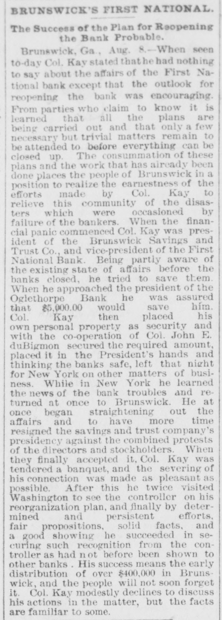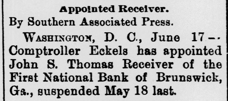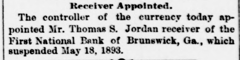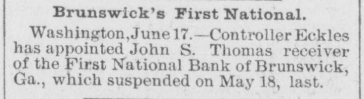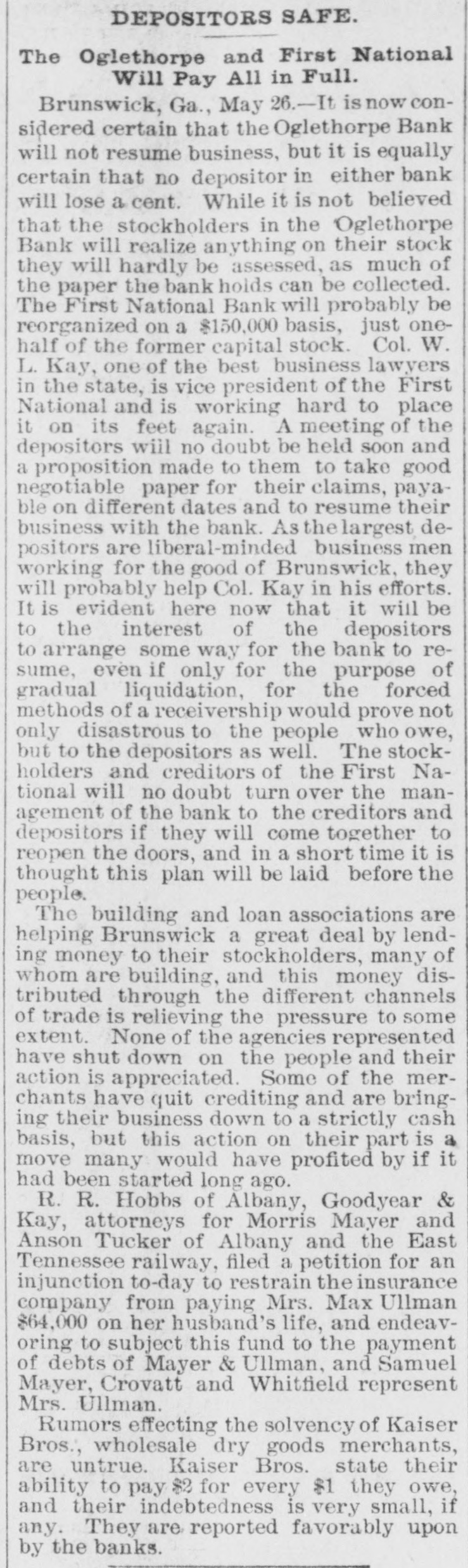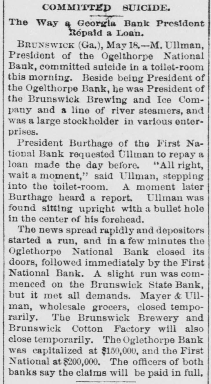 PREFERRED DEATH TO POVERTY. Bank President Ullman Suicides-Several Suspensions Result. BRUNSWICK, GA., May 18.-M. UIIman, president of the Oglethorpe National Bank, committed suicide in the toiletroom of the bank this morning. Up to this time he was considered one of the wealthiest men in this section. Besides being president of the Oglethrope Bank he was president of the Brunswick Brewing and Ice Company, and a line of river steamers, and was a larger stockholder in various enterprises. President /Burbage, of the First National Bank, called at the Oglethorpe Bank shortly after opening and requested Ullman to repay a loan made the day before. "All right, wait a moment," said Ullman, stepping into the toilet-room. A moment later Burbage heard a report. Ullman was found sitting upright with a bullet hole in the centre of his forehead. In his pockets were found an ounce bottle of laudanum, and an unsigned bond drawn to protect a large depositor who had demanded his money the day before. The supposition is that Ullman had been crazed by financial troubles, and that his inability to protect his friends drove him to suicide. The news spread rapidly, and depositors started a run. In a few minutes the Oglethorpe National closed its doors, followed almost immediately by the First National. A slight run commenced on the Brunswick State Bank, but it met all demands. Mayor & Ullman, wholesale grocers, have closed temporarily. The firm is composed of Sam Mayer and M. Ullman. The Brunswick Brewery and the Brunswick Cotton Factory will also close temporarily. Rumors affecting the two banks had been in circulation for several days. These became public after the tragedy, causing the runs. The Oglethorpe was capitalized at $150,000, and the First National Bank at $200,000. The officers of both banks say that claims will be paid in full. Bank examiners have been wired for, and pending their arrival nothing definite will be known. Business will not suffer to any great extent. WASHINGTON, D. C., May 18.-Comptroller Eckels this afternoon ordered Bank Examiner John Carskedan, of West Virginia, to Brunswick to take charge of the First National Bank and the Oglethorpe National Bank of Brunswick, both of which closed their doors this morning. The First National Bank had capital of $200,000 and the Oglethorpe Bank of $150,000. The resources of the banks on May 4th, as reported, were for the former $492,000, and for the latter $682,000. Illinois Bank Failure, EVANSTON, ILL., May 18.-The Evanston National Bank, of this city, closed its doors this morning, at the suggestion of National Bank Examiner George B. Caldwell. The bank formerly did business with the Chemical National Bank, of Chicago, but after the failure of that institution transferred its accounts to the Metropolitan National Bank, of Chicago. Nebraska Bank In Trouble. LINCOLN, NEB., May 18.-The Nebraska Savings Bank is in trouble: For several days there has been a quiet run on the institution, which to-day assumed extensive proportions. The clearing house, was called on for assistance and responded promptly, and the bank is confident it will weather the storm. The bank has a capital of $250,000 and the deposits amount to $150,000.