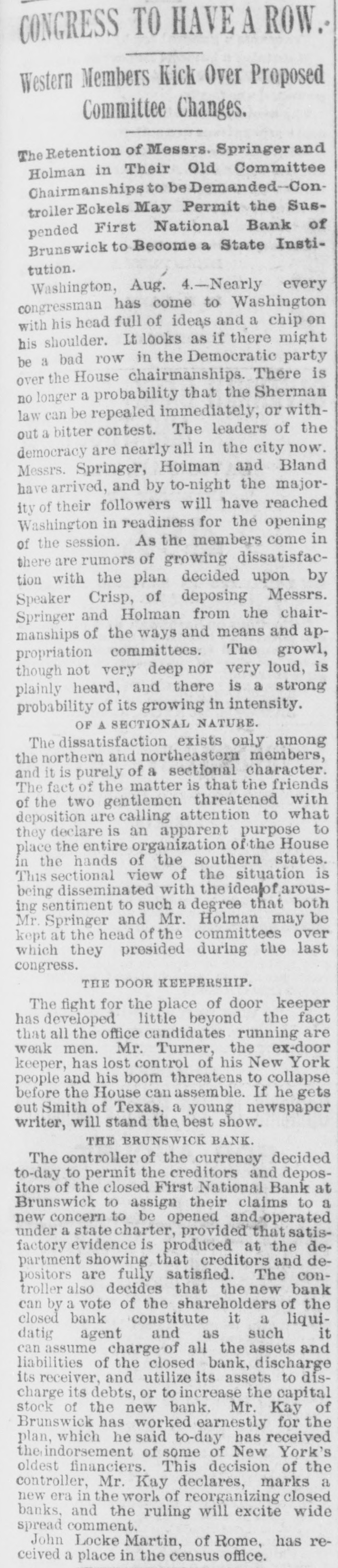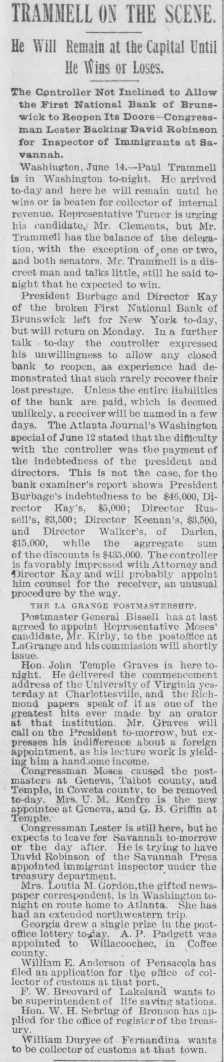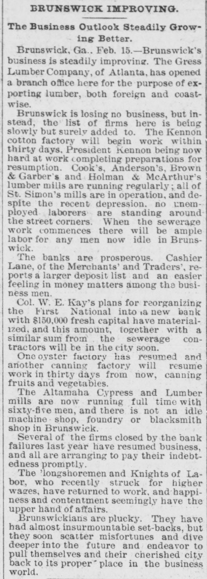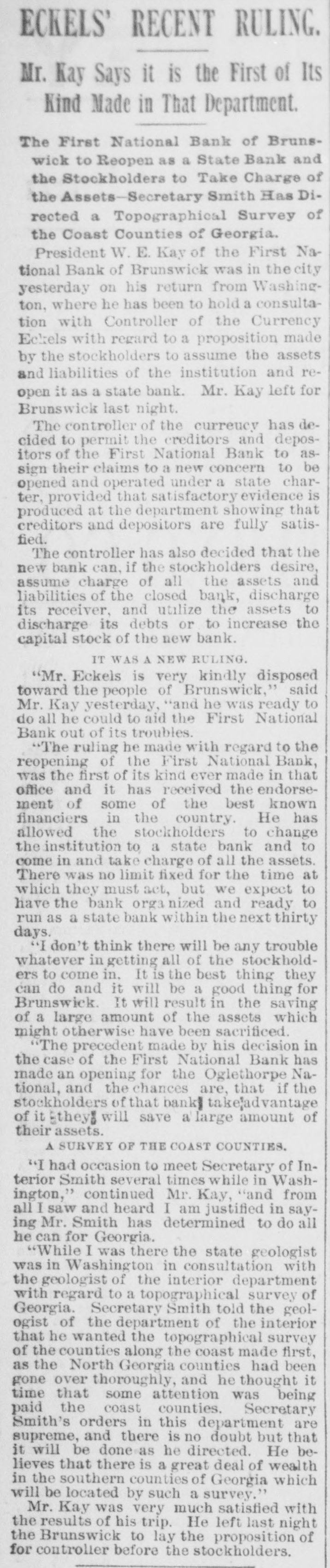 PREFERRED DEATH TO POVERTY. Bank President Ullman Suicides-Several Suspensions Result. BRUNSWICK, GA., May 18.-M. UIIman, president of the Oglethorpe National Bank, committed suicide in the toiletroom of the bank this morning. Up to this time he was considered one of the wealthiest men in this section. Besides being president of the Oglethrope Bank he was president of the Brunswick Brewing and Ice Company, and a line of river steamers, and was a larger stockholder in various enterprises. President /Burbage, of the First National Bank, called at the Oglethorpe Bank shortly after opening and requested Ullman to repay a loan made the day before. "All right, wait a moment," said Ullman, stepping into the toilet-room. A moment later Burbage heard a report. Ullman was found sitting upright with a bullet hole in the centre of his forehead. In his pockets were found an ounce bottle of laudanum, and an unsigned bond drawn to protect a large depositor who had demanded his money the day before. The supposition is that Ullman had been crazed by financial troubles, and that his inability to protect his friends drove him to suicide. The news spread rapidly, and depositors started a run. In a few minutes the Oglethorpe National closed its doors, followed almost immediately by the First National. A slight run commenced on the Brunswick State Bank, but it met all demands. Mayor & Ullman, wholesale grocers, have closed temporarily. The firm is composed of Sam Mayer and M. Ullman. The Brunswick Brewery and the Brunswick Cotton Factory will also close temporarily. Rumors affecting the two banks had been in circulation for several days. These became public after the tragedy, causing the runs. The Oglethorpe was capitalized at $150,000, and the First National Bank at $200,000. The officers of both banks say that claims will be paid in full. Bank examiners have been wired for, and pending their arrival nothing definite will be known. Business will not suffer to any great extent. WASHINGTON, D. C., May 18.-Comptroller Eckels this afternoon ordered Bank Examiner John Carskedan, of West Virginia, to Brunswick to take charge of the First National Bank and the Oglethorpe National Bank of Brunswick, both of which closed their doors this morning. The First National Bank had capital of $200,000 and the Oglethorpe Bank of $150,000. The resources of the banks on May 4th, as reported, were for the former $492,000, and for the latter $682,000. Illinois Bank Failure, EVANSTON, ILL., May 18.-The Evanston National Bank, of this city, closed its doors this morning, at the suggestion of National Bank Examiner George B. Caldwell. The bank formerly did business with the Chemical National Bank, of Chicago, but after the failure of that institution transferred its accounts to the Metropolitan National Bank, of Chicago. Nebraska Bank In Trouble. LINCOLN, NEB., May 18.-The Nebraska Savings Bank is in trouble: For several days there has been a quiet run on the institution, which to-day assumed extensive proportions. The clearing house, was called on for assistance and responded promptly, and the bank is confident it will weather the storm. The bank has a capital of $250,000 and the deposits amount to $150,000.