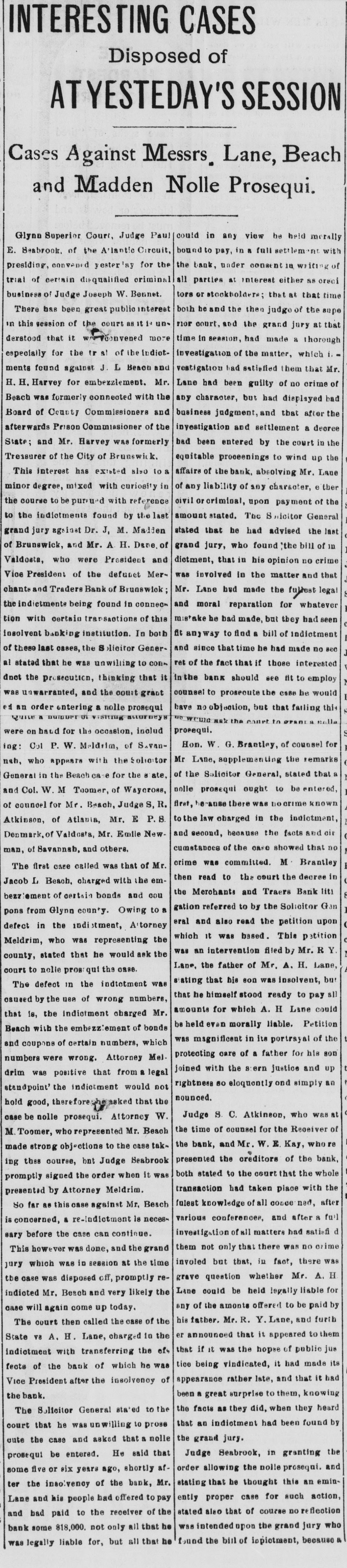 INTERESTING CASES Disposed of AT YESTEDAY'S SESSION Cases Against Messrs Lane, Beach and Madden Nolle Prosequi. Glyno Superior Court, Judge Paul could in any view be held morally E. Seabrook. of the A'lantic Circuit, bound to pay, in R full settlement with presiding, convened yester's for the the bank, under consent in writing of all parties at interest either as oreci trial of certain disqualified criminal tors or stockholders that at that time business of Judge Joseph W. Bennet. There has been great public interest both be and the then judge of the supe in this session of the court as it 1s unFIOR court, and the grand jury at that derstood that it www.convened more time in session, had made a thorough especially for the IF al of the Indiotinvestigation of the matter, which i. ments found against J L Beach and vestigation had satieffed them that Mr. H. H. Harvey for embezzlement. Mr. Lane had been guilty of no crime of Beach was formerly connected with the any character, but had displayed bad Board of County Commissioners and business judgment, and that after the afterwards Prison Commissioner of the inyestigation and settlement a deoree State; and Mr. Harvey was formerly had been entered by the court in the Treasurer of the City of Brunswick, equitable proceenings to wind up the This interest has existed also to a affairs of the bank, absolving Mr. Lane minor degree, mixed with curiosity in of any liability of any character, e ther oivil or criminal, upon pay ment of the the course to be purjued with reference to the indictments found by the last amount stated. The S micitor General stated that he had advised the last grand jury against Dr. J, M. Madden of Brunswick, and Mr. A H. Dane, of grand jury, who found :the bill of in Valdosta, who were President and dictment, that in his opinion no crime Vice President of the defunct Merwas involved in the matter and that chants and Traders Bank of Brunswick Mr. Lane bud made the fullust legal the indictments being found in connec and moral reparation for whatever tion with certain transactions of this mistake he bad made, but they had seen insolvent banking institution. In both fit anyway to find a bill of indictment and since that time he had made no see of these last cases, the S elieitor Generret of the fact that if those interested al stated that he was unwilling to condnot the prosecution, thinking that it in the bank should see fit to employ counsel to proseoute the C588 be would was unwarranted, and the court grant ed an order entering a nolle prosequi have no objection, but that failing this we quite a DUTDUPT in VISITIUM attorneys wene not the canet tn grant 14 malla proeequi. were on hand for the occasion, includ Hon. W. G. Brantley, of counsel for ing: Col P. W. Maldrim, of S.vanMr Lane, supplementing the remarks neh, who appears with the Solicitor of the Solicitor General, stated that General in the Beach case for the a ate, nolle prosequi ought to be entered, and Col. W. M Toomer, of Waycross, first, he ranse there was no crime known of councel for Mr. Beach, Judge S, R. to the law obarged in the indictment, Atkinson, of Atlania, Mr. E P. 8 and second, because the facts and oir Denmark, of Valdesta, Mr. Emile New cumstances of the case showed that no man, of Savannab, and others. crime was committed. M Brantley The first care called was that of Mr then read to the court the decree in Jacob L Beach, charged with the emthe Merchants and Traers Bank liti bezzlement of certain bonds and cou gation referred to by the Solicitor Gan pons from Glynn county. Owing to eral and also read the petition upon defect in the indi listment, A'torney which it was based. This petition Meldrim, who was representing the was an intervention filed b/ Mr. R Y county, stated that he would ask the Lane, the father of Mr. A. H. Lane, court to nolle pros: qui the case. stating that his son was insolvent, but The defect in the indtetment was that he himself stood ready to pay all osured by the use of wrong numbers, amounts for which A. H Lane could that is, the Indictment charged Mr. be held even morally liable. Petition Beach with the embezziement of bonde was magnificent in its portray of the and coupons of certain numbers, which protecting care of a father for his son numbers were wrong. Attorney Mel. joined with the s:ern justice and up drim was positive that from a legal rightness so eloquently ond simply an standpoint' the indictment would not nounced. hold good, therefore asked that the Judge S. C. Atkineon, who was at case be nolle prosequi. Attorney W. the time of counsel for the Receiver of M. Toomer, who represented Mr. Beach the bank, and Mr. W. E. Kay, who made strong objections to the case takpresented the creditors of the bank, ing thes course, but Judge Seabrook both stated to the court that the whole promptly signed the order when it was transaction had taken piace with the presented by Attorney Meldrim. fulest knowledge of all conce ned, after So far as this case against Mr. Beach various conferences, and after a full is concerned, & re-indictment 18 necesinvestigation of all matters had satiefi d sary before the case can continue. them not only that there was no crime This however was done, and the grand involed but that, in fact, there was jury which was in session at the time grave question whether Mr. A. H tbe case was disposed off, promptly reLane could be held legally liable for indicted Mr. Besch and very likely the any of the amonts offered to be paid by case will again come up today. his father. Mr. R. Y. Lane, and furth The court then called the case of the er announced that it appeared to them State V8 A, H. Lane, charged in the that if it was the hopse of public jus indictment with transferring the of tice being vindicated, it had made its fects of the bank of which he was appearance rather late, and that it had Vice President after the insolvency of been a great surprise to them, knowing the bank. the facts as they did, when the