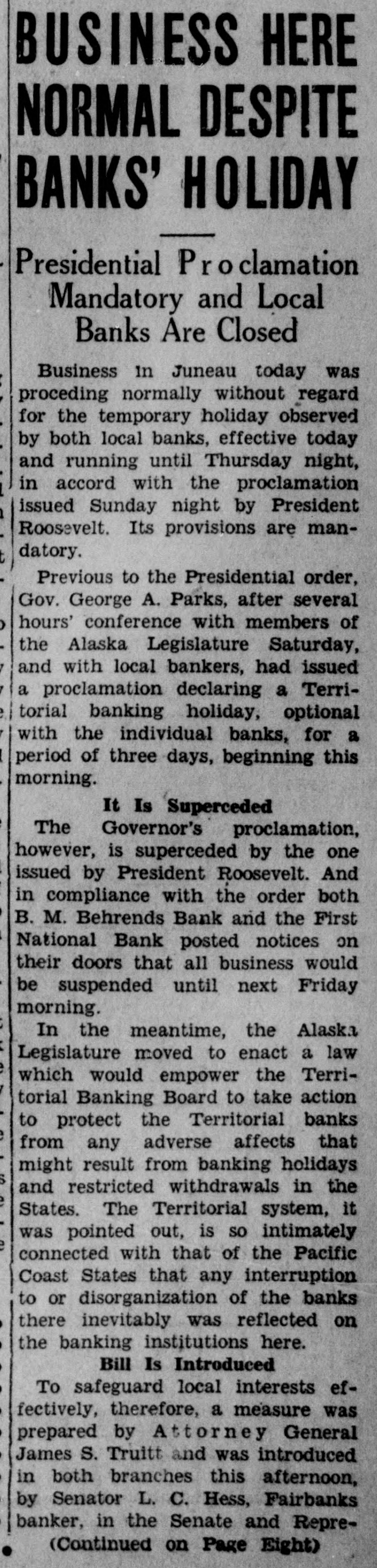 BUSINESS HERE NORMAL DESPITE BANKS' HOLIDAY Presidential Proclamation Mandatory and Local Banks Are Closed Business in Juneau today was proceding normally without regard for the temporary holiday observed by both local banks, effective today and running until Thursday night, in accord with the proclamation issued Sunday night by President Roosevelt. Its provisions are mandatory. Previous to the Presidential order, Gov. George A. Parks, after several hours' conference with members of the Alaska Legislature Saturday, and with local bankers, had issued a proclamation declaring a Territorial banking holiday, optional with the individual banks, for a period of three days, beginning this morning. It Is Superceded The Governor's proclamation, however, is superceded by the one issued by President Roosevelt. And in compliance with the order both B. M. Behrends Bank and the First National Bank posted notices on their doors that all business would be suspended until next Friday morning. In the meantime, the Alaska Legislature moved to enact a law which would empower the Territorial Banking Board to take action to protect the Territorial banks from any adverse affects that might result from banking holidays and restricted withdrawals in the States. The Territorial system, it was pointed out, is so intimately connected with that of the Pacific Coast States that any interruption to or disorganization of the banks there inevitably was reflected on the banking institutions here. Bill Is Introduced To safeguard local interests effectively, therefore, a measure was prepared by Attorney General James S. Truitt and was introduced in both branches this afternoon, by Senator L. C. Hess, Fairbanks banker, in the Senate and Repre(Continued on Page Eight)