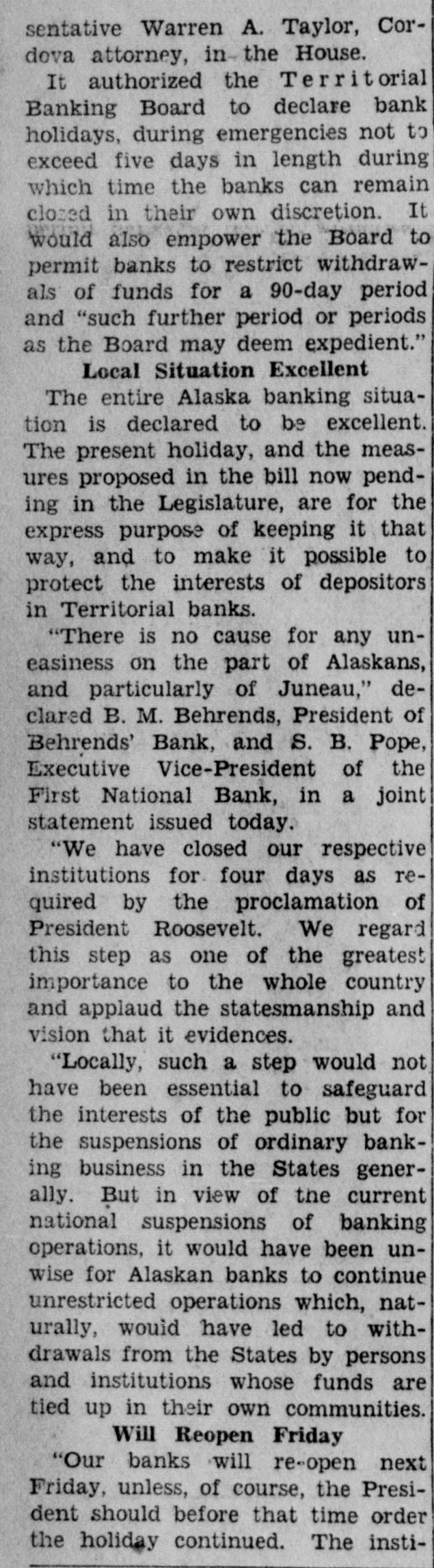 sentative Warren A. Taylor, Cordova attorney, in the House. It authorized the Territorial Banking Board to declare bank holidays, during emergencies not to exceed five days in length during which time the banks can remain closed in their own discretion. It would also empower the Board to permit banks to restrict withdrawals of funds for a 90-day period and "such further period or periods as the Board may deem expedient." Local Situation Excellent The entire Alaska banking situation is declared to be excellent. The present holiday, and the measures proposed in the bill now pending in the Legislature, are for the express purpose of keeping it that way, and to make it possible to protect the interests of depositors in Territorial banks. "There is no cause for any uneasiness on the part of Alaskans, and particularly of Juneau," declared B. M. Behrends, President of Behrends' Bank, and S. B. Pope, Executive Vice-President of the First National Bank, in a joint statement issued today. "We have closed our respective institutions for four days as required by the proclamation of President Roosevelt. We regard this step as one of the greatest importance to the whole country and applaud the statesmanship and vision that it evidences. "Locally, such a step would not have been essential to safeguard the interests of the public but for the suspensions of ordinary banking business in the States generally. But in view of the current national suspensions of banking operations, it would have been unwise for Alaskan banks to continue unrestricted operations which, naturally, would have led to withdrawals from the States by persons and institutions whose funds are tied up in their own communities. Will Reopen Friday "Our banks will re-open next Friday, unless, of course, the President should before that time order the holiday continued. The insti-