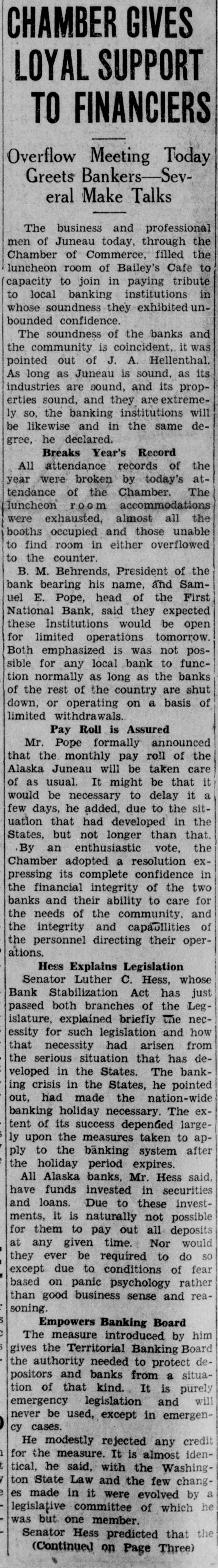 CHAMBER GIVES LOYAL SUPPORT TO FINANCIERS Overflow Meeting Today Greets Bankers-Several Make Talks The business and professional men of Juneau today, through the Chamber of Commerce, filled the luncheon room of Bailey's Cafe to capacity to join in paying tribute in to local banking institutions whose soundness they exhibited unbounded confidence. The soundness of the banks and the community is coincident, it was pointed out of J. A. Hellenthal. As long as Juneau is sound, as its industries are sound, and its properties sound, and they are extremely so, the banking institutions will be likewise and in the same degree, he declared. Breaks Year's Record All attendance records of the year were broken by today's attendance of the Chamber. The luncheon room accommodations were exhausted, almost all the booths occupied and those unable to find room in either overflowed to the counter. B. M. Behrends, President of the bank bearing his name, and Samuel E. Pope, head of the First National Bank, said they expected these institutions would be open for limited operations tomorrow. Both emphasized is was not possible for any local bank to function normally as long as the banks of the rest of the country are shut down, or operating on a basis of limited withdrawals. Pay Roll is Assured Mr. Pope formally announced that the monthly pay roll of the Alaska Juneau will be taken care of as usual. It might be that it would be necessary to delay it a he added, due to few days, the in sit- the uation that had developed States, but not longer than that By an enthusiastic vote, the Chamber adopted a resolution expressing its complete confidence in the financial integrity of the two banks and their ability to care for the needs of the community. and of the integrity and capabilities the personnel directing their operations. Hess Explains Legislation Senator Luther C. Hess, whose Bank Stabilization Act has just passed both branches of the Legislature, explained briefly the necessity for such legislation and how that necessity had arisen from the serious situation that has developed in the States. The banking crisis in the States, he pointed out, had made the nation-wide banking holiday necessary. The extent of its success depended largely upon the measures taken to apply to the banking system after the holiday period expires. All Alaska banks, Mr. Hess said, have funds invested in securities and loans. Due to these investments, it is naturally not possible for them to pay out all deposits at any given time. Nor would they ever be required to do SO except due to conditions of fear based on panic psychology rather than good business sense and reasoning. Empowers Banking Board The measure introduced by him gives the Territorial Banking Board dethe authority needed to protect positors and banks from a situation of that kind. It is purely will emergency legislation and never be used, except in emergency cases. He modestly rejected any credit for the measure. It is almost identical, he said, with the Washington State Law and the few changes made in it were evolved by he a legislative committee of which was but one member. Senator Hess predicted that the (Continued on Page Three)