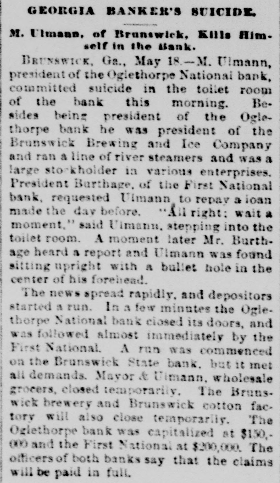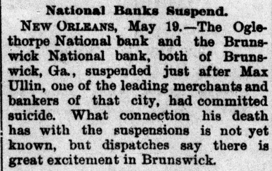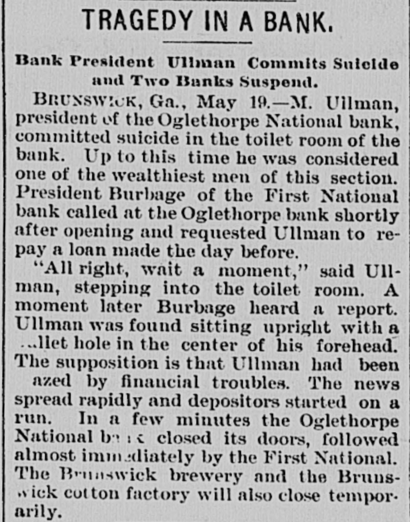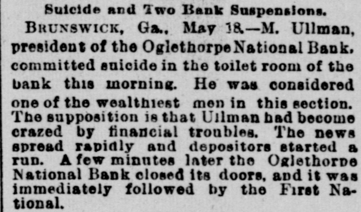 Suicide and Two Bank Suspensions. BRUNSWICK, Ga.. May 18-M. Ullman, president of the Oglethorpe National Bank, committed suicide in the toilet room of the bank this morning. He was considered one of the wealthiest men in this section. The supposition is that Uilman had become crazed by financial troubles. The news spread rapidly and depositors started a run. A few minutes later the Oglethorne National Bank closed its doors, and it was immediately followed by the First National.