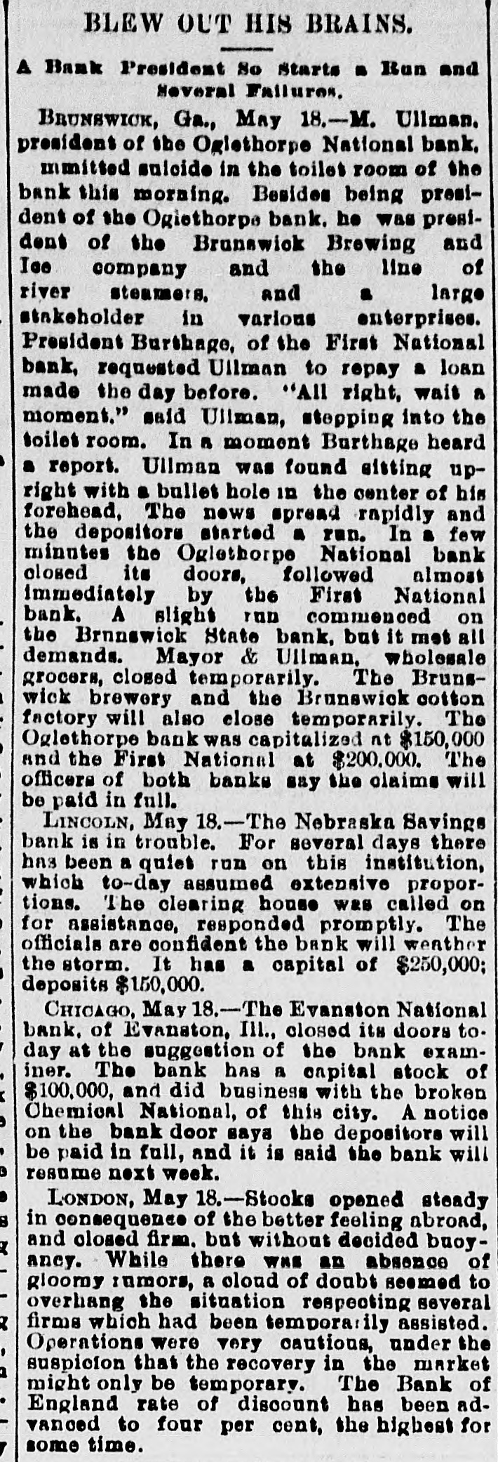 BLEW OUT HIS BRAINS. A Bank President So Starts n Run and Neveral Failures. BRUNSWICK, Ga., May 18.-M. Ullman. president of the Oglethorpe National bank. mmitted suicide in the toilet room of the bank this morning. Besides being president of the Ogiethorpe bank. he was president of the Brunswick Brewing and Ice company and the line of river steamers. and a large stakeholder in various enterprises. President Burthage, of the First National bank, requested Ullman to repay a loan made the day before. "All right, wait a moment." said Ullman, stepping into the toilet room. In a moment Burthage heard a report. Ullman was found sitting upright with a bullet hole in the center of his forehead, The nows spread rapidly and the depositors started a run. In a few minutes the Oglethorpe National bank closed its doors, followed almost immediately by the First National bank. A slight run commenced on the Brnnswick State bank, but it met all demands. Mayor & Ullman, wholesale grocers, closed temporarily. The Brunswick brewery and the Brunewick cotton factory will also close temporarily. The Oglethorpe bank was capitalized nt $150,000 and the First National at $200,000. The officers of both banks say the claims will be paid in full. LINCOLN, May 18.-The Nebraska Savings bank is in trouble. For several days there has been a quiet run on this institution, which to-day assumed extensive proportions. The clearing house was called on for assistance, responded promptly. The officials are confident the bank will weather the storm. It has a capital of $250,000; deposits $150,000. CHICAGO, May 18.-The Evanston National bank. of Evanston, III., closed its doors to. day at the suggestion of the bank examiner. The bank has a capital stock of $100,000, and did business with the broken Chemical National, of this city. A notice on the bank door saya the depositors will be paid in full, and it is said the bank will resume next week. LONDON, May 18.-Stocks opened steady in consequence of the better feeling abroad, and closed firm. but without decided buoyancy. While there WHE an absence of gloomy rumors, a cloud of doubt seemed to overhang the situation respecting several firms which had been temporarily assisted. Operations were very cautions, under the suspicion that the recovery in the market of might only be temporary. The Bank England rate of discount has been advanced to four per cent, the highest for some time.