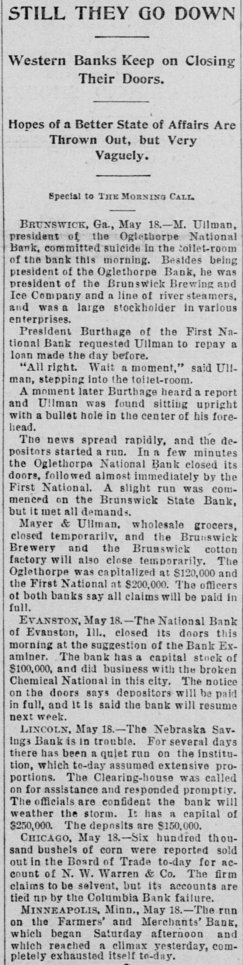 STILL THEY GO DOWN Western Banks Keep on Closing Their Doors. Hopes of a Better State of Affairs Are Thrown Out, but Very Vaguely. Special to THE MORNING CALL BRUNSWICK, Ga., May 18.-M. Ullman, president of the Oglethorpe National Bank, committed suicide in the coilet-room of the bank this morning. Besides being president of the Oglethorpe Bank, he was president of the Brunswick Brewing and Ice Company and a line of river steamers, and was a large stockholder in various enterprises. President Burthage of the First National Bank requested Ullman to repay a loan made the day before. "All right. Wait a moment," said Ullman, stepping into the toilet-room. A moment later Burthage heard a report and U!Iman was found sitting upright with a bullet hole in the center of his forehead. The news spread rapidly, and the depositors started a run. In a few minutes the Oglethorpe National Bank closed its doors, followed almost immediately by the First National. A slight run was commenced on the Brunswick State Bank, but it met all demands. Mayer & Ullman. wholesale grocers, closed temporarily, and the Brunswick Brewery and the Brunswick cotton factory will also close temporarily. The Oglethorpe was capitalized at $120,000 and the First National at $200,000. The officers of both banks say all claims will be paid in full. EVANSTON, May 18.-The National Bank of Evanston, III., closed its doors this morning at the suggestion of the Bank Examiner. The bank has a capital stock of $100,000, and did business with the broken Chemical National in this city, The notice on the doors says depositors will be paid in full, and it is said the bank will resume next week. LINCOLN, May 18.-The Nebraska Savings Bank is in trouble. For several days there has been a quiet run on the institution, which to-day assumed extensive proportions. The Clearing-house was called on for assistance and responded promptly. The officials are confident the bank will weather the storm. It has a capital of $250,000. The deposits are $150,000. CHICAGO, May 18.-Six hundred thousand bushels of corn were reported sold out in the Board of Trade to-day for account of N. W. Warren & Co. The firm claims to be selvent, but its accounts are tied up by the Columbia Bank failure. MINNEAPOLIS, Minn., May 18.-The run on the Farmers' and Merchants' Bank, which began Saturday afternoon and which reached a climax yesterday, completely exhausted itself to-day.