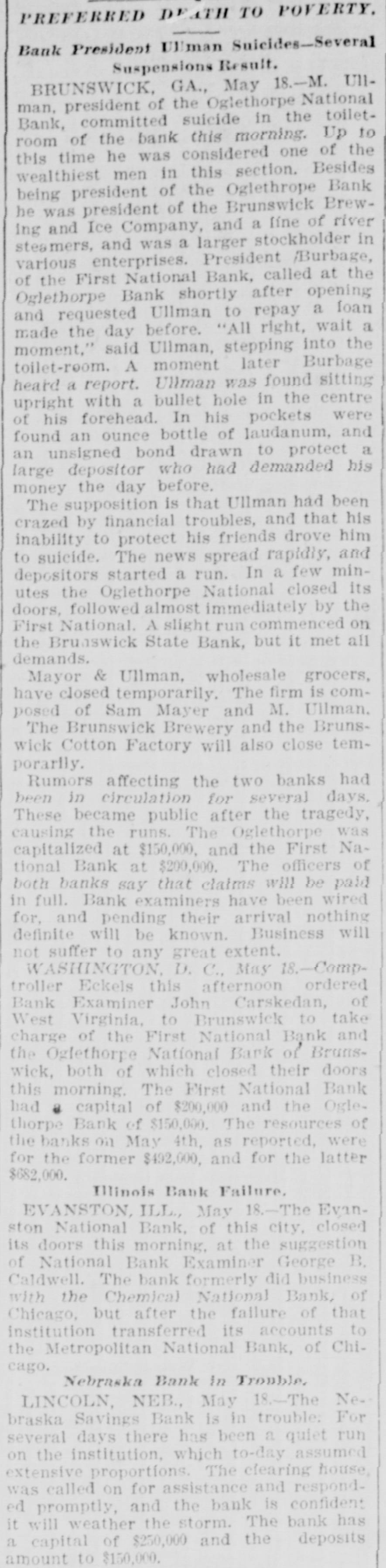 PREFERRED DEATH TO POVERTY. Bank President Ullman Suicides-Several Suspensions Result. BRUNSWICK, GA., May 18.-M. UIIman, president of the Oglethorpe National Bank, committed suicide in the toiletroom of the bank this morning. Up to this time he was considered one of the wealthiest men in this section. Besides being president of the Oglethrope Bank he was president of the Brunswick Brewing and Ice Company, and a line of river steamers, and was a larger stockholder in various enterprises. President /Burbage, of the First National Bank, called at the Oglethorpe Bank shortly after opening and requested Ullman to repay a loan made the day before. "All right, wait a moment," said Ullman, stepping into the toilet-room. A moment later Burbage heard a report. Ullman was found sitting upright with a bullet hole in the centre of his forehead. In his pockets were found an ounce bottle of laudanum, and an unsigned bond drawn to protect a large depositor who had demanded his money the day before. The supposition is that Ullman had been crazed by financial troubles, and that his inability to protect his friends drove him to suicide. The news spread rapidly, and depositors started a run. In a few minutes the Oglethorpe National closed its doors, followed almost immediately by the First National. A slight run commenced on the Brunswick State Bank, but it met all demands. Mayor & Ullman, wholesale grocers, have closed temporarily. The firm is composed of Sam Mayer and M. Ullman. The Brunswick Brewery and the Brunswick Cotton Factory will also close temporarily. Rumors affecting the two banks had been in circulation for several days. These became public after the tragedy, causing the runs. The Oglethorpe was capitalized at $150,000, and the First National Bank at $200,000. The officers of both banks say that claims will be paid in full. Bank examiners have been wired for, and pending their arrival nothing definite will be known. Business will not suffer to any great extent. WASHINGTON, D. C., May 18.-Comptroller Eckels this afternoon ordered Bank Examiner John Carskedan, of West Virginia, to Brunswick to take charge of the First National Bank and the Oglethorpe National Bank of Brunswick, both of which closed their doors this morning. The First National Bank had capital of $200,000 and the Oglethorpe Bank of $150,000. The resources of the banks on May 4th, as reported, were for the former $492,000, and for the latter $682,000. Illinois Bank Failure, EVANSTON, ILL., May 18.-The Evanston National Bank, of this city, closed its doors this morning, at the suggestion of National Bank Examiner George B. Caldwell. The bank formerly did business with the Chemical National Bank, of Chicago, but after the failure of that institution transferred its accounts to the Metropolitan National Bank, of Chicago. Nebraska Bank In Trouble. LINCOLN, NEB., May 18.-The Nebraska Savings Bank is in trouble: For several days there has been a quiet run on the institution, which to-day assumed extensive proportions. The clearing house, was called on for assistance and responded promptly, and the bank is confident it will weather the storm. The bank has a capital of $250,000 and the deposits amount to $150,000.
