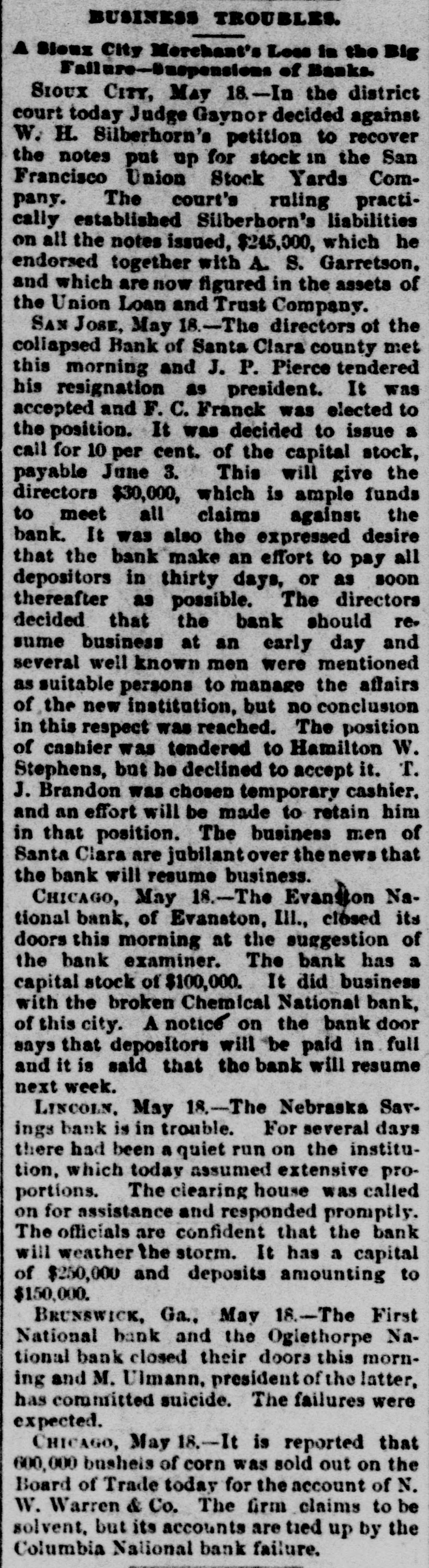 BUSINESS TROUBLES. A Sloux City Merchant's Loss is the Big Fallure-Duspensions of Banks SIOUX CITY, May 18.-In the district court today Judge Gaynor decided against W. H. Silberhorn's petition to recover the notes put up for stock in the San Francisco Union Stock Yards Company. The court's ruling practically established Silberborn's liabilities on all the notes issued, $245,000, which he endorsed together with s S. Garretson. and which are now figured in the assets of the Union Loan and Trust Company. SAN JOSE, May 18.-The directors ot the coliapsed Bank of Santa Clara county met this morning and J. P. Pierce tendered his resignation as president. It was accepted and F. C. Franck was elected to the position. It was decided to issue a call for 10 per cent. of the capital stock, payable June 3. This will give the directors $30,000, which is ample funds to meet all claims against the bank. It was also the expressed desire that the bank make an effort to pay all depositors in thirty days, or as soon thereafter as possible. The directors decided that the bank should resame business at an early day and several well known men were mentioned as suitable persons to manage the affairs of the new institution, but no conclusion in this respect was reached. The position of cashier was tendered to Hamilton W. Stephens, but he declined to accept it. T. J. Brandon was chosen temporary cashier. and an effort will be made to retain him in that position. The business men of Santa Clara are jubilantover the news that the bank will resume business. CHICAGO, May 18.-The Evanston National bank, of Evanston, III., closed its doors this morning at the suggestion of the bank examiner. The bank has a capital stock of $100,000. It did business with the broken Chemical National bank, of this city. A notice on the bank door says that depositors will be paid in full and it is said that the bank will resume next week. LINCOLN. May 18.-The Nebraska Savings bank is in trouble. For several days there had been a quiet run on the institution, which today assumed extensive proportions. The clearing house was called on for assistance and responded promptly. The officials are confident that the bank will weather the storm. It has a capital of $250,000 and deposits amounting to $150,000. BRUNSWICK, Ga. May 18.-The First National bank and the Oglethorpe National bank closed their doors this morning and M. Ulmann, president of the latter, has committed suicide. The failures were expected. CHICAGO, May 18.-It is reported that 600,000 busheis of corn was sold out on the Board of Trade today for the account of N. W. Warren & Co. The firm claims to be solvent, but its accounts are tied up by the Columbia National bank failure.