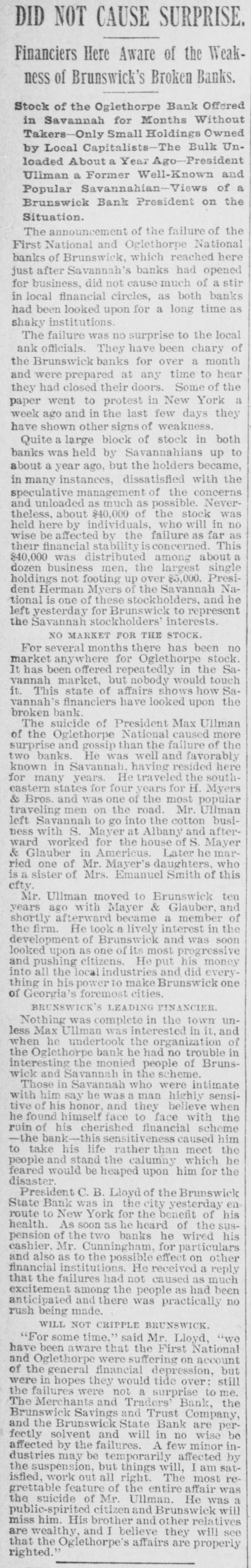DID NOT CAUSE SURPRISE. Financiers Here Aware of the Weakness of Brunswick's Broken Banks. Stock of the Oglethorpe Bank Offered in Savannah for Months Without Takers-Only Small Holdings Owned by Local Capitalists-The Bulk Unloaded About a Year Ago-President Uliman a Former Well-Known and Popular Savannahian-Views of a Brunswick Bank President on the Situation. The announcement of the failure of the First National and Oglethorpe National banks of Brunswick, which reached here just after Savannah's banks had opened for business, did not cause much of a stir in local financial circles, as both banks had been looked upon for a long time as shaky institutions. The failure was no surprise to the local ank officials. They have been chary of the Brunswick banks for over a month and were prepared at any time to hear they had closed their doors. Some of the a paper went to protest in New York week ago and in the last few days they have shown other signs of weakness. Quite a large block of stock in both banks was held by Savannahians up to about a year ago, but the holders became, in many instances, dissatisfied with the speculative management of the concerns and unloaded as much as possible. Nevertheless, about $40,000 of the stock was held here by individuals, who will in no wise be affected by the failure as far as their financial stability is concerned. This $40,000 was distributed among about dozen business men. the largest single holdings not footing up over $5,000. President Herman Myers of the Savannah National is one of these stockholders, and he left yesterday for Brunswick to represent the Savannah stockholders' interests. NO MARKET FOR THE STOCK. For several months there has been no market anywhere for Oglethorpe stock. It has been offered repeatedly in the Savannah market, but nobody would touch it. This state of affairs shows how Savannah's financiers have looked upon the broken bank. The suicide of President Max Ullman of the Oglethorpe National caused more surprise and gossip than the failure of the two banks. He was well and favorably known in Savannah, having resided here for many years. He traveled the southeastern states for four years for H. Myers & Bros. and was one of the most popular traveling men on the road. Mr. Ullman left Savannah to go into the cotton business with S. Mayer at Albany and afterward worked for the house of S. Mayer & Glauber in Americus. Later he married one of Mr. Mayer's daughters, who is sister of Mrs. Emanuel Smith of this cfty. Mr. Ullman moved to Erunswick ten years ago with Mayer & Glauber, and shortly afterward became a member of the firm. He took a lively interest in the development of Brunswick and was soon looked upon as one of its most progressive and pushing citizens. He put his money into all the local industries and did every thing in his power to make Brunswick one of Georgia's foremost cities. BRUNSWICK'S LEADING FINANCIER. Nothing was complete in the town unless Max Ullman was interested in it. and when he undertook the organization of the Oglethorpe bank he had no trouble in interesting the monied people of Brunswick and Savannah in the scheme. Those in Savannah who were intimate with him say he was a man highly sensitive of his honor, and they believe when he found himself face to face with the ruin of his cherished financial scheme -the bank-this sensitiveness caused him to take his life rather than meet the people and stand the calumny which he feared would be heaped upon him for the disaster. President C. B. Lloyd of the Brunswick State Bank was in the city yesterday en route to New York for the benefit of his health. As soon as he heard of the suspension of the two banks he wired his cashier. Mr. Cunningham, for particulars and also as to the possible effect on other financial institutions. He received a reply that the failures had not caused as much excitement among the people as had been anticipated and there was practically no rush being made. WILL NOT CRIPPLE BRUNSWICK. For some time." said Mr. Lloyd, "we have been aware that the First National and Oglethorpe were suffering on account of the general financial depression, but were in hopes they would tide over: still the failures were not a surprise to me. The Merchants and Traders Bank the Brunswick Savings and Trust Company, and the Brunswick State Bank are perfectly solvent and will in no wise be affected by the failures. A few minor industries may be temporarily affected by the suspension, but things will, I am satisfied, work out all right. The most regrettable feature of the entire affair was the suicide of Mr. Ullman. He was a public-spirited citizen and Brunswick will miss him. His brother and other relatives are wealthy, and I believe they will see that the Oglethorpe's affairs are properly righted.