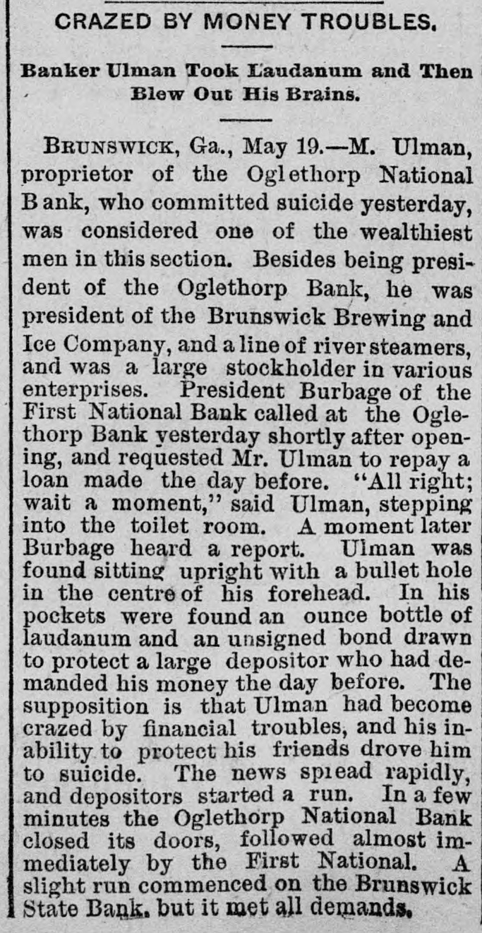 CRAZED BY MONEY TROUBLES, Banker Ulman Took Laudanum and Then Blew Out His Brains. BRUNSWICK, Ga., May 19.-M. Ulman, proprietor of the Oglethorp National Bank, who committed suicide yesterday, was considered one of the wealthiest men in this section. Besides being president of the Oglethorp Bank, he was president of the Brunswick Brewing and Ice Company, and a line of river steamers, and was a large stockholder in various enterprises. President Burbage of the First National Bank called at the Oglethorp Bank yesterday shortly after opening, and requested Mr. Ulman to repay a loan made the day before. "All right; wait a moment," said Ulman, stepping into the toilet room. A moment later Burbage heard a report. Ulman was found sitting upright with a bullet hole in the centre of his forehead. In his pockets were found an ounce bottle of laudanum and an unsigned bond drawn to protect a large depositor who had demanded his money the day before. The supposition is that Ulman had become crazed by financial troubles, and his inability to protect his friends drove him to suicide. The news spread rapidly, and depositors started a run. In a few minutes the Oglethorp National Bank closed its doors, followed almost immediately by the First National. A slight run commenced on the Brunswick State Bank. but it met all demands.