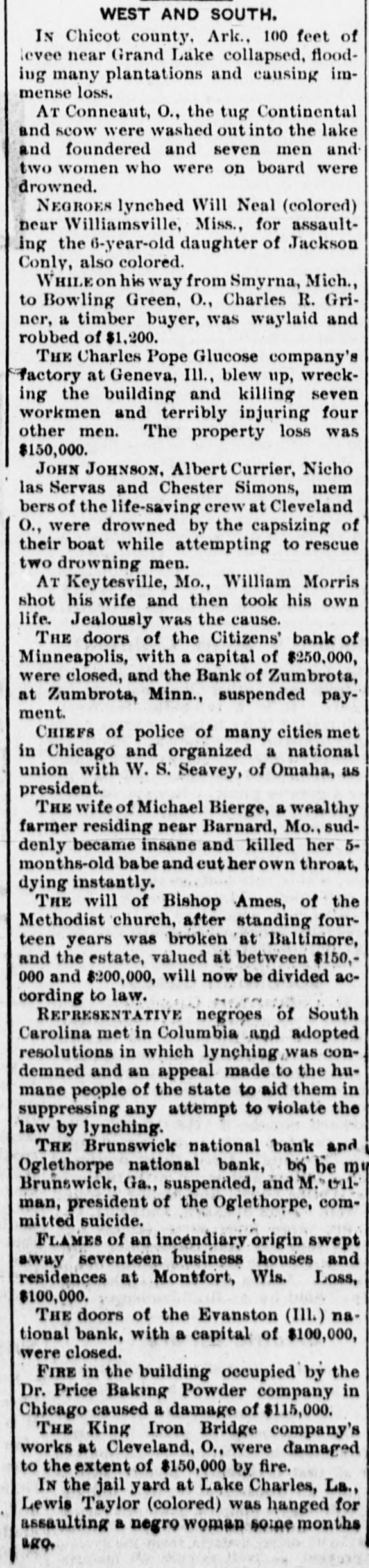 WEST AND SOUTH. IN Chicot county, Ark., 100 feet of levee near Grand Lake collapsed, flooding many plantations and causing immense loss. AT Conneaut, O., the tug Continental and scow were washed out into the lake and foundered and seven men and two women who were on board were drowned. NEGROES lynched Will Neal (colored) near Williamsville, Miss., for assaulting the 6-year-old daughter of Jackson Conly, also colored. WHILEON his way from Smyrna, Mich., to Bowling Green, O., Charles R. Griner, a timber buyer, was waylaid and robbed of $1,200. THE Charles Pope Glucose company's factory at Geneva, Ill., blew up, wrecking the building and killing seven workmen and terribly injuring four other men. The property loss was $150,000. JOHN JOHNSON. Albert Currier, Nicho las Servas and Chester Simons, mem bers of the life-saving crew at Cleveland O., were drowned by the capsizing of their boat while attempting to rescue two drowning men. AT Keytesville, Mo., William Morris shot his wife and then took his own life. Jealously was the cause. THE doors of the Citizens' bank of Minneapolis, with a capital of $250,000, were closed, and the Bank of Zumbrota, at Zumbrota, Minn., suspended payment. CHIEFS of police of many cities met in Chicago and organized a national union with W. S. Seavey, of Omaha, as president. THE wife of Michael Bierge, a wealthy farmer residing near Barnard, Mo., suddenly became insane and killed her 5months-old bab and cut her own throat, dying instantly. THE will of Bishop Ames, of the Methodist church, after standing fourteen years was broken at Baltimore, and the estate, valued at between $150,000 and $200,000, will now be divided according to law. REPRESENTATIVE negroes of South Carolina met in Columbia and adopted resolutions in which lynching was condemned and an appeal made to the humane people of the state to aid them in suppressing any attempt to violate the law by lynching. THE Brunswick national bank and Oglethorpe national bank, by be my Brunswick, Ga., suspended, and Mounman, president of the Oglethorpe, committed suicide. FLAMES of an incendiary origin swept away seventeen business houses and residences at Montfort, Wis. Loss, $100,000. THE doors of the Evanston (III.) na tional bank, with a capital of $100,000, were closed. FIRE in the building occupied by the Dr. Price Baking Powder company in Chicago caused a damage of $115,000. THE King Iron Bridge company's works at Cleveland, O., were damaged to the extent of $150,000 by fire. IN the jail yard at Lake Charles, La., Lewis Taylor (colored) was hanged for assaulting a negro woman some months ago.