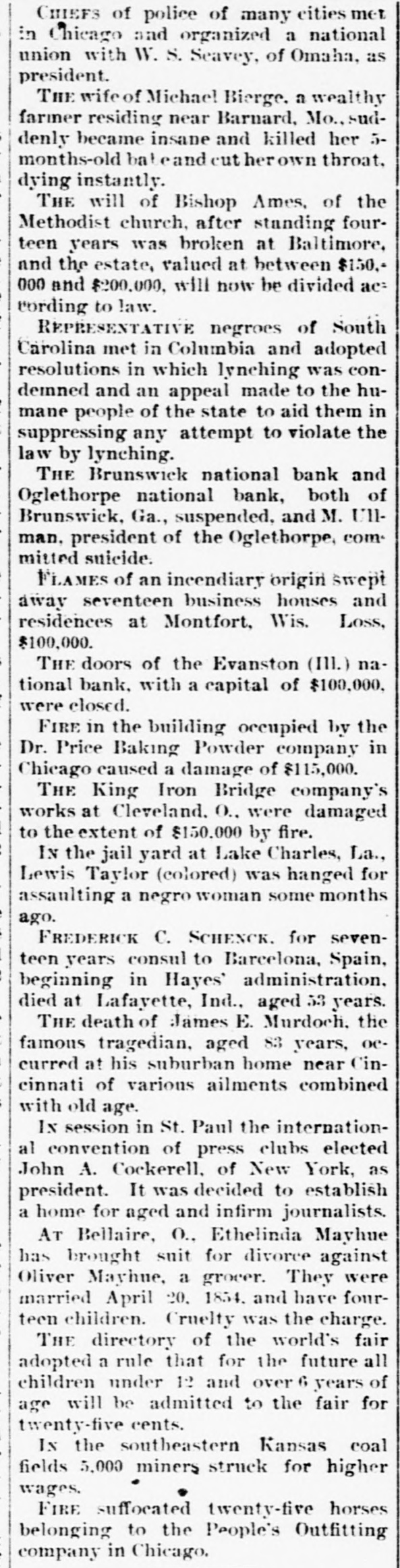 CHIEFS of police of many cities met in Chicago and organized a national union with W. S. Seavey, of Omaha, as president. THE wife of Michael Bierge. a wealthy farmer residing near Barnard, Mo., suddenly became insane and killed her 5months-old bat eand herown throat. dying instantly. THE will of Bishop Ames, of the Methodist church, after standing fourteen years was broken at Baltimore, and the estate, valued at between $150, 000 and $200,000, will now be divided ac: cording to law. REPRESENTATIVE negroes of South Carolina met in Columbia and adopted resolutions in which lynching was condemned and an appeal made to the humane people of the state to aid them in suppressing any attempt to violate the law by lynching. THE Brunswick national bank and Oglethorpe national bank, both of Brunswick, Ga., suspended, and M. UIIman. president of the Oglethorpe, committed suicide. FLAMES of an incendiary origin swept away seventeen business houses and residences at Montfort, Wis. Loss, $100,000. THE doors of the Evanston (III.) national bank. with a capital of $100,000. were closed. FIRE in the building occupied by the Dr. Price Baking Powder company in Chicago caused a damage of $115,000. THE King Iron Bridge company's works at Cleveland. O., were damaged to the extent of $150.000 by fire. IN the jail yard at Lake Charles, La., Lewis Taylor (colored) was hanged for assaulting a negro woman some months ago. FREDERICK C. SCHENCK. for seventeen years consul to Barcelona, Spain, beginning in Hayes' administration. died at Lafayette, Ind., aged 53 years. THE death of James E. Murdoch. the famous tragedian. aged 83 years, occurred at his suburban home near Cincinnati of various ailments combined with old age. Ix session in St. Paul the international convention of press clubs elected John A. Cockerell, of New York, as president. It was decided to establish a home for aged and infirm journalists. AT Bellaire, O., Ethelinda Mayhue has brought suit for divorce against Oliver Mayhue, a grocer. They were married April 20. 1854. and have fourteen children. Cruelty was the charge. THE directory of the world's fair adopted a rule that for the future all children under 12 and over 6 years of age will be admitted to the fair for twenty-five cents. Ix the southeastern Kansas coal fields 5,000 miners struck for higher wages. FIRE suffocated twenty-five horses belonging to the People's Outfitting company in Chicago.