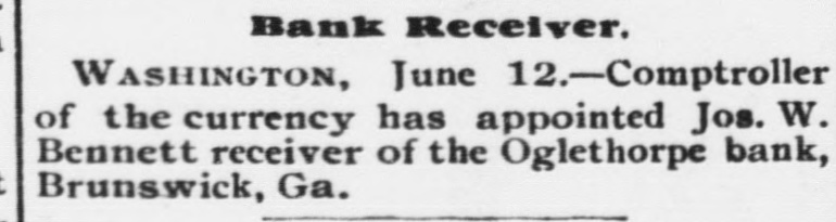 Washington, June 12.-Comptroller of the currency has appointed Jos. W. Bennett receiver of the Oglethorpe bank, : Brunswick, Ga.