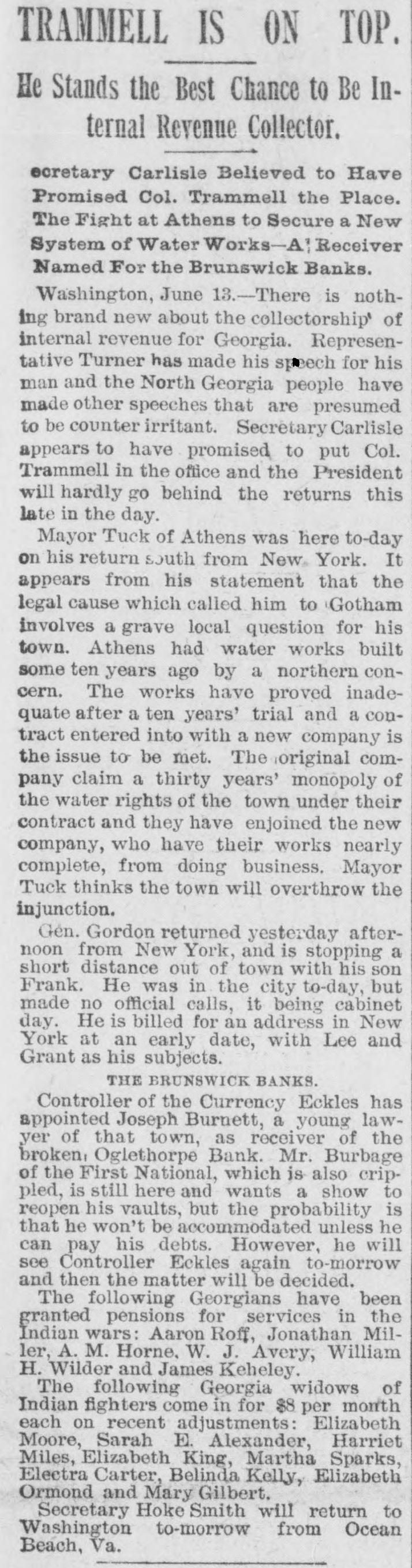 TRAMMELL IS ON TOP. He Stands the Best Chance to Be Internal Revenue Collector. ecretary Carlisle Believed to Have Promised Col. Trammell the Place. The Fight at Athens to Secure a New System of Water Works-A' Receiver Named For the Brunswick Banks. Washington, June 13. -There is nothing brand new about the collectorship of internal revenue for Georgia. Representative Turner has made his speech for his man and the North Georgia people have made other speeches that are presumed to be counter irritant. Secretary Carlisle appears to have promised to put Col. Trammell in the office and the President will hardly go behind the returns this late in the day. Mayor Tuck of Athens was here to-day on his return south from New York. It appears from his statement that the legal cause which called him to Gotham involves a grave local question for his town. Athens had water works built some ten years ago by a northern concern. The works have proved inadequate after a ten years' trial and a contract entered into with a new company is the issue to be met. The original company claim a thirty years' monopoly of the water rights of the town under their contract and they have enjoined the new company, who have their works nearly complete, from doing business. Mayor Tuck thinks the town will overthrow the injunction. Gen. Gordon returned yesterday afternoon from New York, and is stopping a short distance out of town with his son Frank. He was in the city to-day, but made no official calls, it being cabinet day. He is billed for an address in New York at an early date, with Lee and Grant as his subjects. THE BRUNSWICK BANKS. Controller of the Currency Eckles has appointed Joseph Burnett, a young lawyer of that town, as receiver of the broken, Oglethorpe Bank. Mr. Burbage of the First National, which is also crippled, is still here and wants a show to reopen his vaults, but the probability is that he won't be accommodated unless he can pay his debts. However, he will see Controller Eckles again to-morrow and then the matter will be decided. The following Georgians have been granted pensions for services in the Indian wars: Aaron Roff, Jonathan Miller, A. M. Horne, W. J. Avery, William H. Wilder and James Keheley. The following Georgia widows of Indian fighters come in for $8 per month each on recent adjustments: Elizabeth Moore, Sarah E. Alexander, Harriet Miles, Elizabeth King, Martha Sparks, Electra Carter, Belinda Kelly, Elizabeth Ormond and Mary Gilbert. Secretary Hoke Smith will return to Washington to-morrow from Ocean Beach, Va.