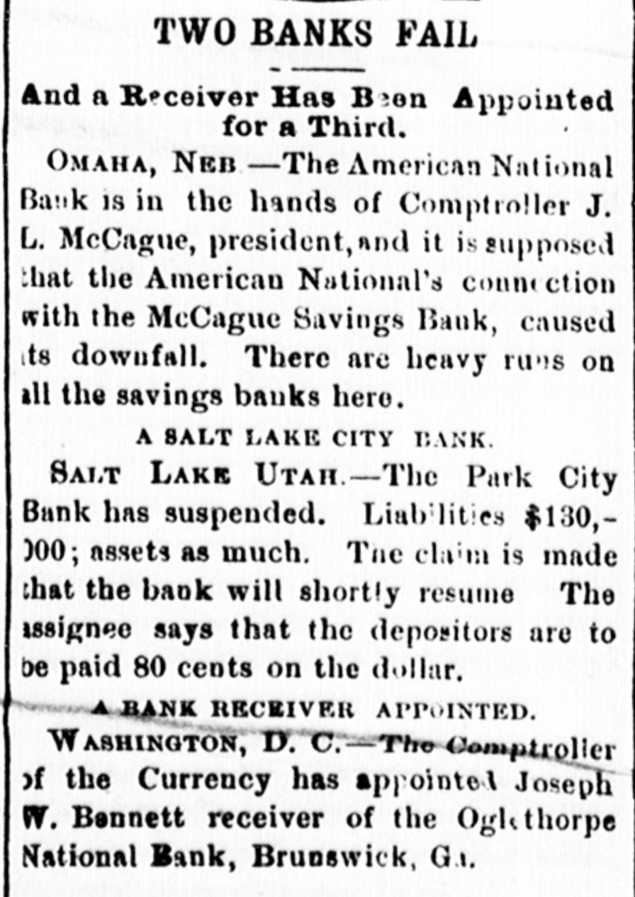 TWO BANKS FAIL And a Receiver Has Been Appointed for a Third. OMAHA, NEB - -The American National Bank is in the hands of Comptroller J. L. McCague, president, and it is supposed that the American National's connection with the McCague Savings Bank, caused its downfall. There are heavy runs on all the savings banks here. A SALT LAKE CITY BANK. SALT LAKE UTAH.-The Park City Bank has suspended. Liabilities $130,000; assets as much. The claim is made that the bank will shortly resume The assignee says that the depositors are to be paid 80 cents on the dollar. BANK RECEIVER APPOINTED. WASHINGTON, D. C.-The Comptroller of the Currency has appointed Joseph W. Bennett receiver of the Oglethorpe National Bank, Brunswick, G.I.