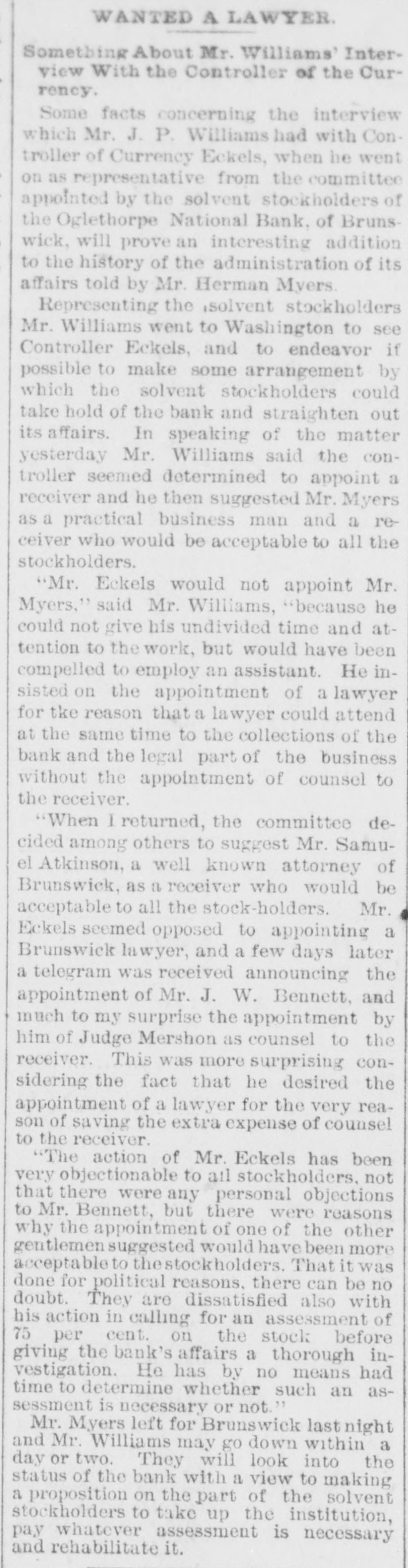 WANTED A LAWYER Something About Mr. Williams' Interview With the Controller of the Currency. Some facts concerning the interview which Mr. J. P. Williams had with Controller of Currency Eckels, when he went on as representative from the committee appointed by the solvent stockholders of the Oglethorpe National Bank. of Brunswick, will prove an interesting addition to the history of the administration of its affairs told by Mr. Herman Myers. Representing the solvent stockholders Mr. Williams went to Washington to see Controller Eckels, and to endeavor if possible to make some arrangement by which the solvent stockholders could take hold of the bank and straighten out its affairs. In speaking of the matter yesterday Mr. Williams said the controller seemed determined to appoint a receiver and he then suggested Mr. Myers as a practical business man and a receiver who would be acceptable to all the stockholders. "Mr. Eckels would not appoint Mr. Myers," said Mr. Williams, "because he could not give his undivided time and attention to the work, but would have been compelled to employ an assistant. He insisted on the appointment of a lawyer for tke reason that a lawyer could attend at the same time to the collections of the bank and the legal part of the business without the appointment of counsel to the receiver. "When I returned, the committee decided among others to suggest Mr. Samuel Atkinson, a well known attorney of Brunswick, as a receiver who would be acceptable to all the stock-holders. Mr. Eckels seemed opposed to appointing a Brunswick lawyer, and a few days later a telegram was received announcing the appointment of Mr. J. W. Bennett, and much to my surprise the appointment by him of Judge Mershon as counsel to the receiver. This was more surprising considering the fact that he desired the appointment of a lawyer for the very reason of saving the extra expense of counsel to the receiver. "The action of Mr. Eckels has been very objectionable to all stockholders, not that there were any personal objections to Mr. Bennett, but there were reasons why the appointment of one of the other gentlemen suggested would have been more acceptable to thestockholders. That it was done for political reasons, there can be no doubt. They are dissatisfied also with his action in calling for an assessment of 75 per cent. on the stock before giving the bank's affairs a thorough investigation. He has by no means had time to determine whether such an assessment is necessary or not. Mr. Myers left for Brunswick last night and Mr. Williams may go down within a day or two. They will look into the status of the bank with a view to making a proposition on the part of the solvent stockholders to take up the institution, pay whatever assessment is necessary and rehabilitate it.