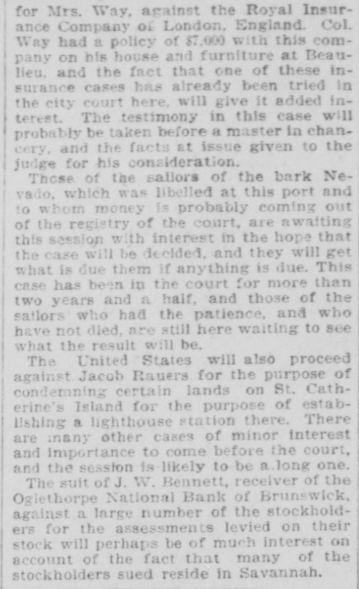 for Mrs. Way, against the Royal Insurance Company of London, England. Col. Way had a policy of $7,000 with this company on his house and furniture at Beaulieu, and the fact that one of these insurance cases has already been tried in the city court here, will give it added interest. The testimony in this case will probably be taken before a master in chancery, and the facts at issue given to the judge for his consideration. Those of the sailors of the bark Nevada, which was libelled at this port and to whom money is probably coming out of the registry of the court, are awaiting this session with interest in the hope that the case will be decided, and they will get what is due them if anything is due. This case has been in the court for more than two years and a half, and those of the sailors who had the patience, and who have not died, are still here waiting to see what the result will be. The United States will also proceed against Jacob Rauers for the purpose of condemning certain lands on St. Catherine's Island for the purpose of establishing a lighthouse station there. There are many other cases of minor interest and importance to come before the court, and the session is likely to be a long one. The suit of J. W. Bennett, receiver of the Oglethorpe National Bank of Brunswick, against a large number of the stockholders for the assessments levied on their stock will perhaps be of much interest on account of the fact that many of the stockholders sued reside in Savannah.