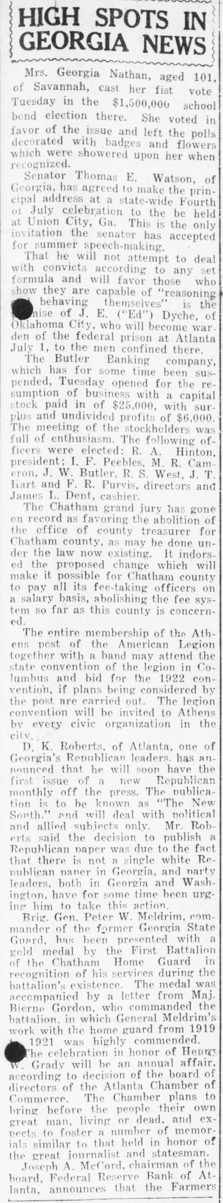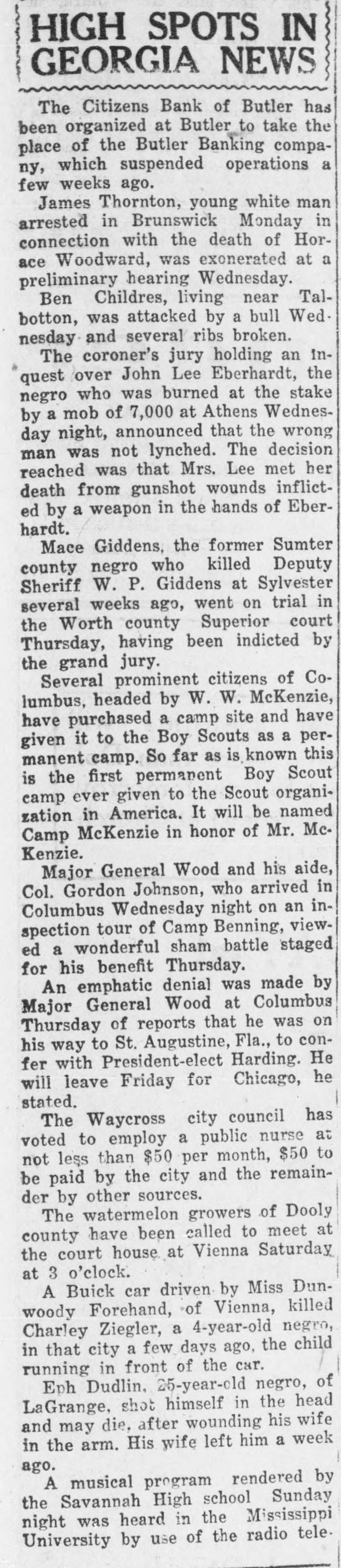 HIGH SPOTS IN GEORGIA NEWS The Citizens Bank of Butler has been organized at Butler to take the place of the Butler Banking company, which suspended operations a few weeks ago. James Thornton, young white man arrested in Brunswick Monday in connection with the death of Horace Woodward, was exonerated at a preliminary hearing Wednesday. Ben Childres, living near Talbotton, was attacked by a bull Wednesday and several ribs broken. The coroner's jury holding an in& quest over John Lee Eberhardt, the negro who was burned at the stake by a mob of 7,000 at Athens Wednesday night, announced that the wrong man was not lynched. The decision reached was that Mrs. Lee met her death from gunshot wounds inflicted by a weapon in the hands of Eberhardt. Mace Giddens, the former Sumter county negro who killed Deputy Sheriff W. P. Giddens at Sylvester several weeks ago, went on trial in the Worth county Superior court Thursday, having been indicted by the grand jury. Several prominent citizens of Columbus, headed by W. W. McKenzie, have purchased a camp site and have given it to the Boy Scouts as a permanent camp. So far as is known this is the first permanent Boy Scout camp ever given to the Scout organization in America. It will be named Camp McKenzie in honor of Mr. McKenzie. Major General Wood and his aide, Col. Gordon Johnson, who arrived in Columbus Wednesday night on an inspection tour of Camp Benning, viewed a wonderful sham battle staged for his benefit Thursday. An emphatic denial was made by Major General Wood at Columbus Thursday of reports that he was on his way to St. Augustine, Fla., to confer with President-elect Harding. He will leave Friday for Chicago, he stated. The Waycross city council has voted to employ a public nurse at not less than $50 per month, $50 to be paid by the city and the remainder by other sources. The watermelon growers of Dooly county have been called to meet at the court house at Vienna Saturday at 3 o'clock. A Buick car driven by Miss Dunwoody Forehand, of Vienna, killed Charley Ziegler, a 4-year-old negro, in that city a few days ago, the child running in front of the car. Eph Dudlin, 25-year-old negro, of LaGrange, shot himself in the head and may die, after wounding his wife in the arm. His wife left him a week ago. A musical program rendered by the Savannah High school Sunday night was heard in the Mississippi University by use of the radio tele-