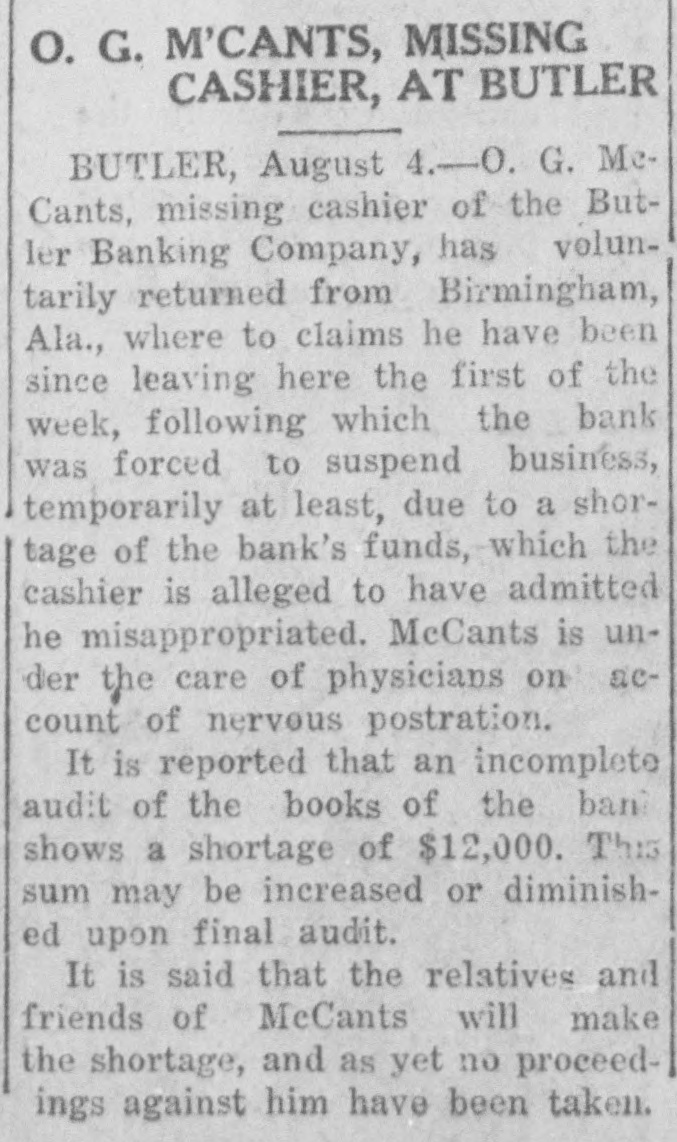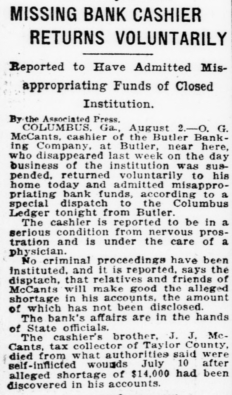 CASHIER RETURNS; ADMITS SHORTAGE Butler, Ga., Banker Said To Be Near Prostration COLUMBUS, Ga., Aug. 2.-0. G. McCants, cashier of the Butler Banking company, at Butler, near here, who disappeared last week on the day business of the institution was suspended, returned voluntarily to "his I home today and admitted misappropriation bank funds, according to a special dispatch to the Columbus Ledger tonight from Butler. The cashier is reported to be in a serious condition from nervous prostration and is under the care of a physician. No criminal proceedings have been instituted, and it is reported, says the dispatch, that relatives and friends of McCants will make good the alleged shortage in his accounts, the amount of which has not been disclosed. The bank's affairs are in the hands of the state officials. The, cashier's brother, J. J. McCants, tax collector of Taylor county, died from what authorities said were self-inflicted wounds July 10, after an alleged shortage of $14,000 had been discovered in his accounts.