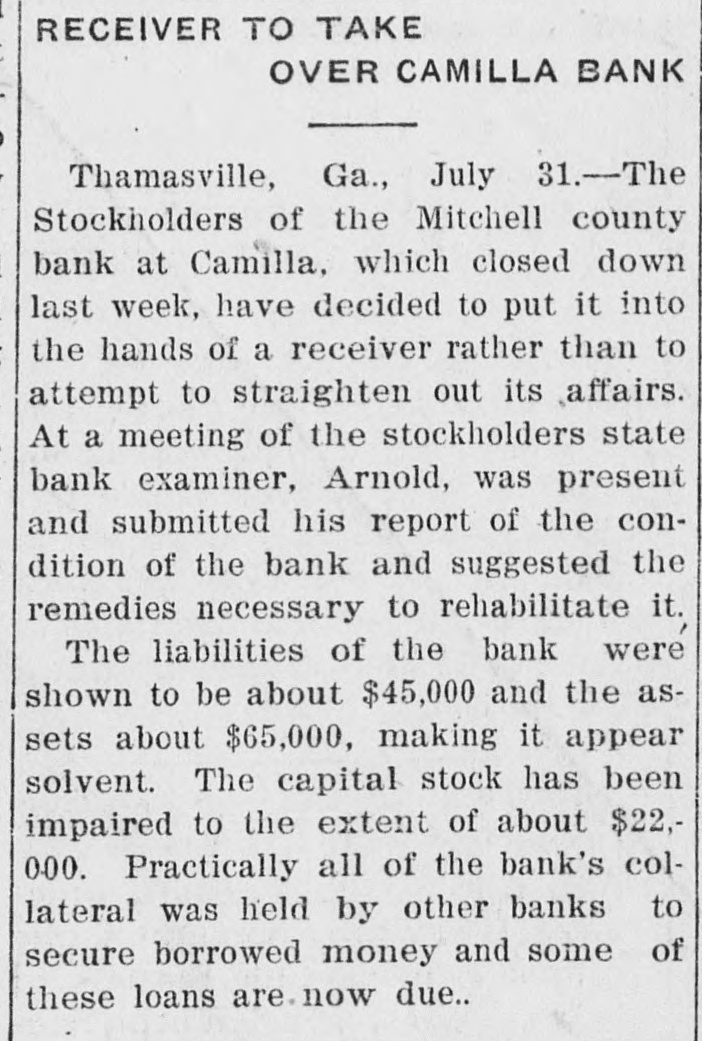 RECEIVER TO TAKE OVER CAMILLA BANK Thamasville, Ga., July 31.-The Stockholders of the Mitchell county bank at Camilla, which closed down last week, have decided to put it into the hands of a receiver rather than to attempt to straighten out its affairs. At a meeting of the stockholders state bank examiner, Arnold, was present and submitted his report of the condition of the bank and suggested the remedies necessary to rehabilitate it. The liabilities of the bank were shown to be about $45,000 and the assets about $65,000, making it appear solvent. The capital stock has been impaired to the extent of about $22,000. Practically all of the bank's collateral was held by other banks to secure borrowed money and some of these loans are now due..