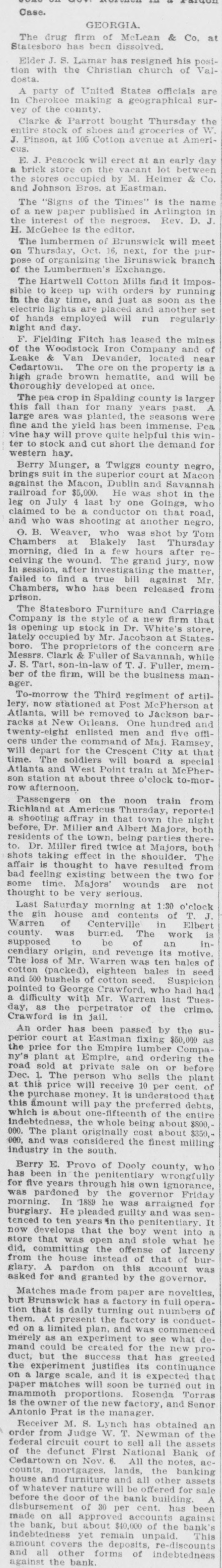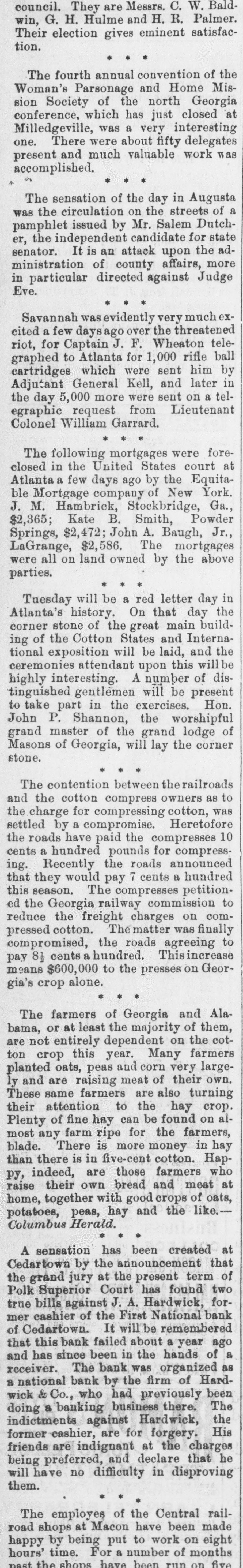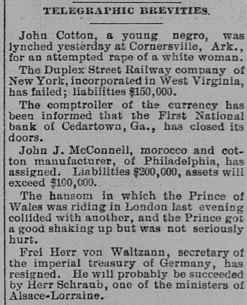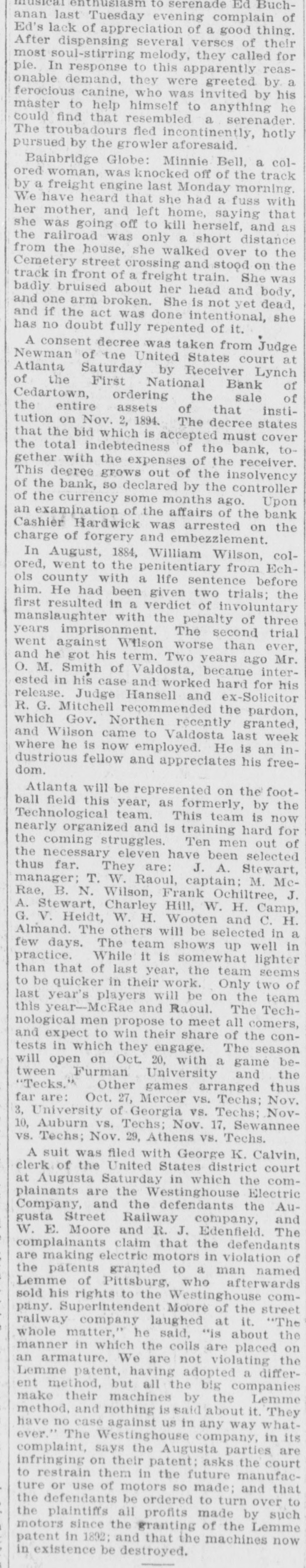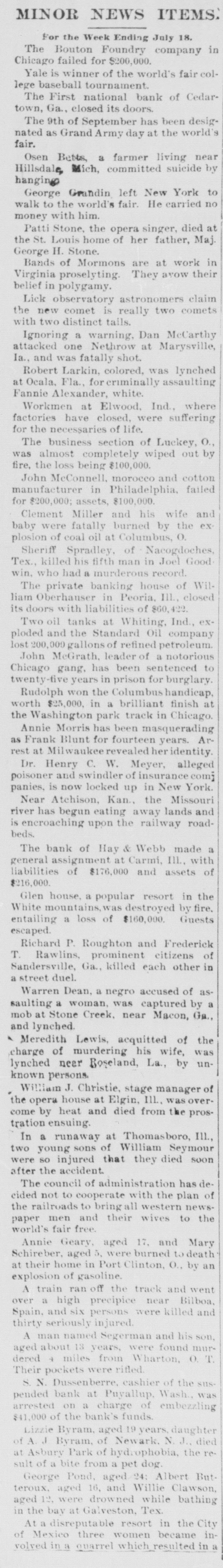 MINOR NEWS ITEMS. For the Week Ending July 18. The Bouton Foundry company in Chicago failed for $200,000. Yale is winner of the world's fair college baseball tournament. The First national bank of Cedartown, Ga., closed its doors. The 9th of September has been designated as Grand Army day at the world's fair. Osen Betts, a farmer living near ich, committed suicide by Hillsdale, hanging George Grandin left New York to walk to the world's fair. He carried no money with him. Patti Stone, the opera singer, died at the St. Louis home of her father, Maj George H. Stone. Bands of Mormons are at work in Virginia proselyting. They avow their belief in polygamy. Lick observatory astronomers claim the new comet is really two comets with two distinct tails. Ignoring a warning, Dan McCarthy attacked one Nethrow at Marysville, Ia., and was fatally shot. Robert Larkin, colored, was lynched at Ocala, Fla., for criminally assaulting Fannie Alexander, white. Workmen at Elwood, Ind., where factories have closed. were suffering for the necessaries of life. The business section of Luckey, O., was almost completely wiped out by fire, the loss being $100,000. John McConnell, morocco and cotton manufacturer in Philadelphia, failed for $200,000; assets, $100,000. Clement Miller and his wife and baby were fatally burned by the ex plosion of coal oil at Columbus, O. Sheriff Spradley, of Nacogdoches, Tex., killed his fifth man in Joel Good win. who had a murderous record. The private banking house of William Oberhauser in Peoria. Ill., closed its doors with liabilities of $60,422. Two oil tanks at Whiting, Ind., exploded and the Standard Oil company lost gallons of refined petroleum. John McGrath. leader of a notorious Chicago gang, has been sentenced to twenty-five years in prison for burglary. Rudolph won the Columbus handicap, worth $25,000, in a brilliant finish at the Washington park track in Chicago. Annie Morris has been masquerading as Frank Blunt for fourteen years. Arrest at Milwaukee revealed her identity. Dr. Henry C. W. Meyer, alleged poisoner and swindler of insurance com; panies, is now locked up in New York. Near Atchison, Kan., the Missouri river has begun eating away lands and is encroaching upon the railway roadbeds. The bank of Hay & Webb made a general assignment at Carmi, III., with liabilities of $176,000 and assets of $216,000. Glen house, a popular resort in the White mountains was destroyed by fire. entailing a loss of $160,000. Guests escaped. Richard P. Roughton and Frederick T. Rawlins, prominent eitizens of Sandersville, Ga., killed each other in a street duel. Warren Dean, a negro accused of assaulting a woman, was captured by a mob at Stone Creek, near Macon, Ga., and lynched. . Meredith Lewis, acquitted of the charge of murdering his wife, was lynched near Roseland, La., by unknown persons. William J. Christie, stage manager of the opera house at Elgin, Ill., was overcome by heat and died from the prostration ensuing. In a runaway at Thomasboro, III., two young sons of William Seymour were so injured that they died soon after the accident. The council of administration has decided not to cooperate with the plan of the railroads to bring all western newspaper men and their wives to the world's fair free. Annie Geary, aged 17. and Mary Schireber, aged 5, were burned to death at their home in Port Clinton, O., by an explosion of gasoline. A train ran off the track and went over a high precipice near Bilboa, Spain, and six persons were killed and thirty seriously injured. A man named Segerman and his son, aged about 13 years, were found murdered 4 miles from Wharton, O T. Their pockets were rifled. S N. Dussenberre, cashier of the suspended bank at Puyallup, Wash., was arrested on a charge of embezzling $41,000 of the bank's funds. Lizzie Byram, aged 19 years, daughter of A J Byram, of Newark. N. J., died at Asbury Park of hydrophobia, the result of a bite from a pet dog. George Pond, aged 24: Albert But teroux. aged 16, and Willie Clawson, aged 12. were drowned while bathing in the bay at Galveston, Tex. At a disreputable resort in the City