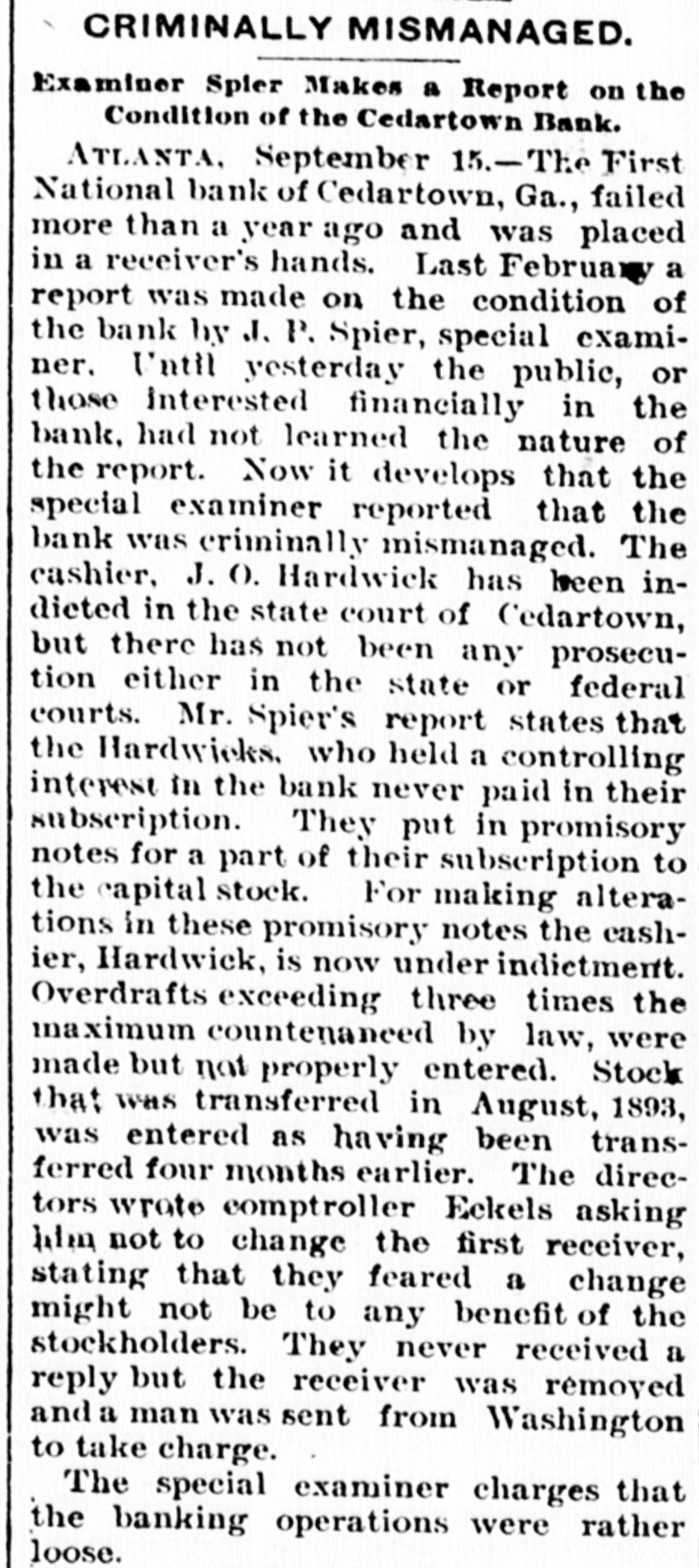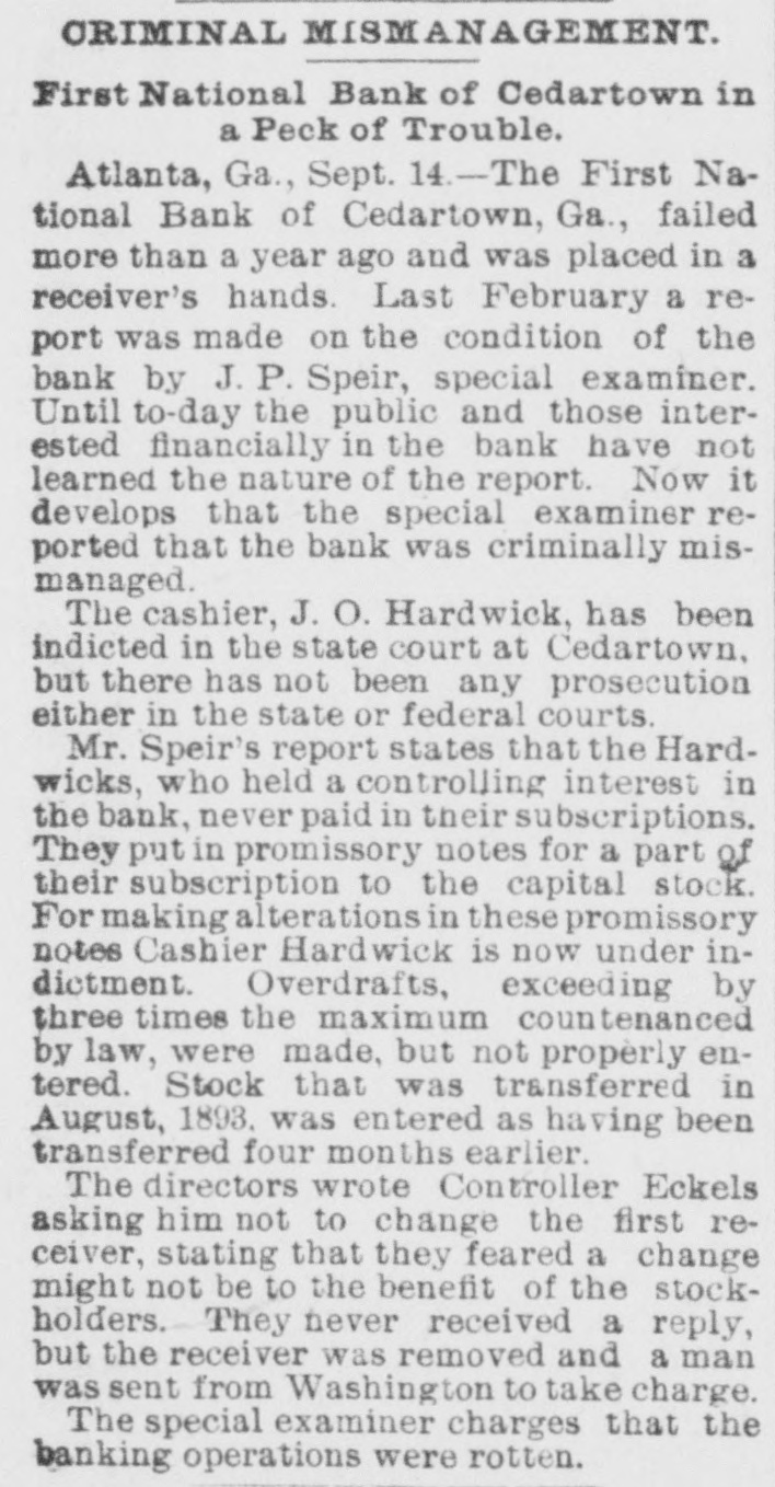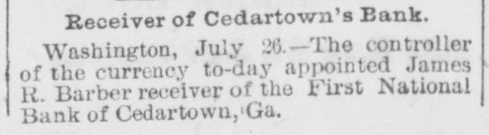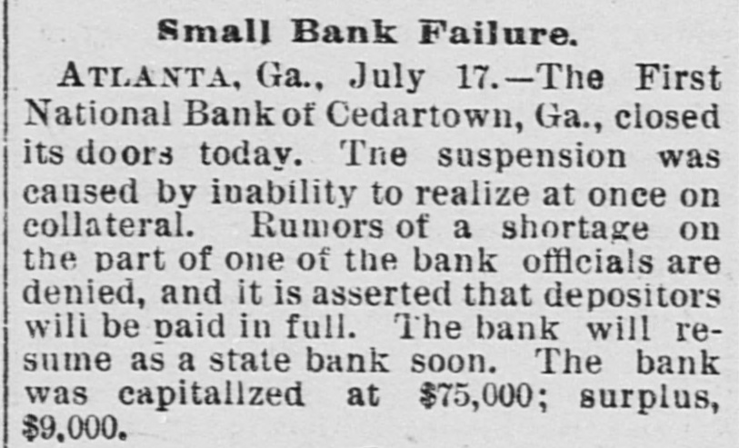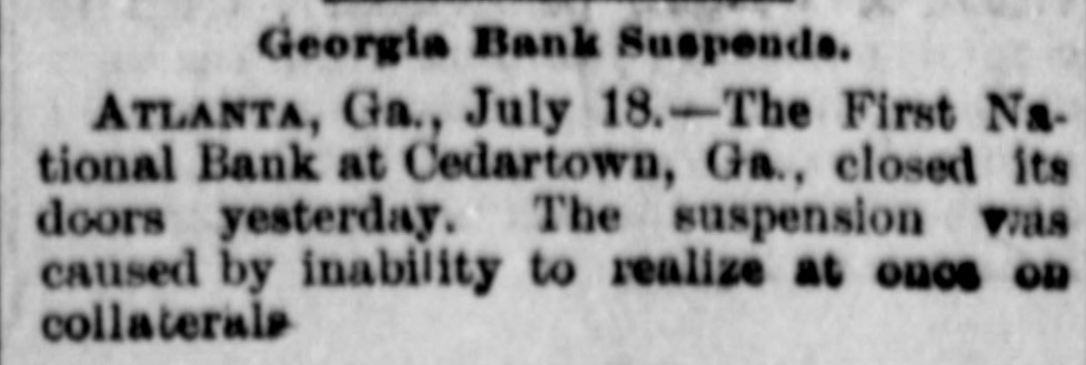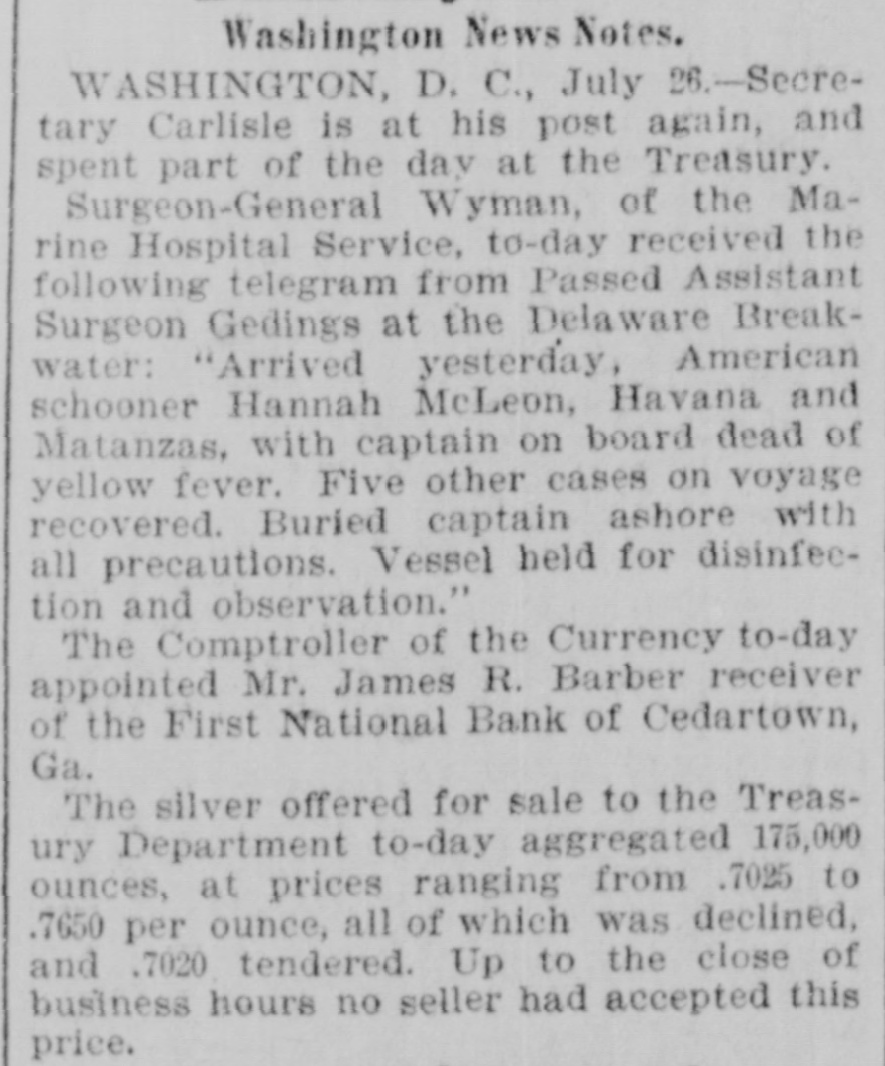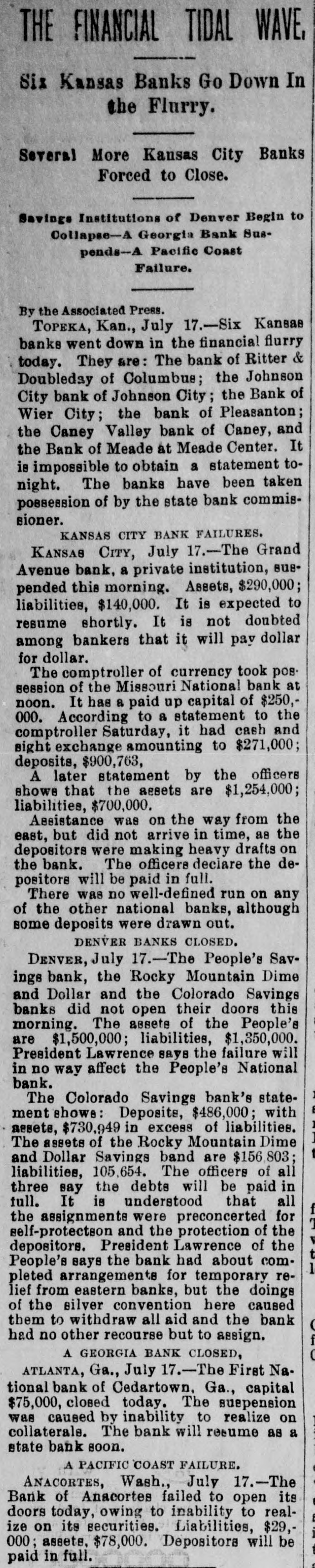 MINOR NEWS ITEMS. For the Week Ending July 18. The Bouton Foundry company in Chicago failed for $200,000. Yale is winner of the world's fair college baseball tournament. The First national bank of Cedartown, Ga., closed its doors. The 9th of September has been designated as Grand Army day at the world's fair. Osen Betts, a farmer living near ich, committed suicide by Hillsdale, hanging George Grandin left New York to walk to the world's fair. He carried no money with him. Patti Stone, the opera singer, died at the St. Louis home of her father, Maj George H. Stone. Bands of Mormons are at work in Virginia proselyting. They avow their belief in polygamy. Lick observatory astronomers claim the new comet is really two comets with two distinct tails. Ignoring a warning, Dan McCarthy attacked one Nethrow at Marysville, Ia., and was fatally shot. Robert Larkin, colored, was lynched at Ocala, Fla., for criminally assaulting Fannie Alexander, white. Workmen at Elwood, Ind., where factories have closed. were suffering for the necessaries of life. The business section of Luckey, O., was almost completely wiped out by fire, the loss being $100,000. John McConnell, morocco and cotton manufacturer in Philadelphia, failed for $200,000; assets, $100,000. Clement Miller and his wife and baby were fatally burned by the ex plosion of coal oil at Columbus, O. Sheriff Spradley, of Nacogdoches, Tex., killed his fifth man in Joel Good win. who had a murderous record. The private banking house of William Oberhauser in Peoria. Ill., closed its doors with liabilities of $60,422. Two oil tanks at Whiting, Ind., exploded and the Standard Oil company lost gallons of refined petroleum. John McGrath. leader of a notorious Chicago gang, has been sentenced to twenty-five years in prison for burglary. Rudolph won the Columbus handicap, worth $25,000, in a brilliant finish at the Washington park track in Chicago. Annie Morris has been masquerading as Frank Blunt for fourteen years. Arrest at Milwaukee revealed her identity. Dr. Henry C. W. Meyer, alleged poisoner and swindler of insurance com; panies, is now locked up in New York. Near Atchison, Kan., the Missouri river has begun eating away lands and is encroaching upon the railway roadbeds. The bank of Hay & Webb made a general assignment at Carmi, III., with liabilities of $176,000 and assets of $216,000. Glen house, a popular resort in the White mountains was destroyed by fire. entailing a loss of $160,000. Guests escaped. Richard P. Roughton and Frederick T. Rawlins, prominent eitizens of Sandersville, Ga., killed each other in a street duel. Warren Dean, a negro accused of assaulting a woman, was captured by a mob at Stone Creek, near Macon, Ga., and lynched. . Meredith Lewis, acquitted of the charge of murdering his wife, was lynched near Roseland, La., by unknown persons. William J. Christie, stage manager of the opera house at Elgin, Ill., was overcome by heat and died from the prostration ensuing. In a runaway at Thomasboro, III., two young sons of William Seymour were so injured that they died soon after the accident. The council of administration has decided not to cooperate with the plan of the railroads to bring all western newspaper men and their wives to the world's fair free. Annie Geary, aged 17. and Mary Schireber, aged 5, were burned to death at their home in Port Clinton, O., by an explosion of gasoline. A train ran off the track and went over a high precipice near Bilboa, Spain, and six persons were killed and thirty seriously injured. A man named Segerman and his son, aged about 13 years, were found murdered 4 miles from Wharton, O T. Their pockets were rifled. S N. Dussenberre, cashier of the suspended bank at Puyallup, Wash., was arrested on a charge of embezzling $41,000 of the bank's funds. Lizzie Byram, aged 19 years, daughter of A J Byram, of Newark. N. J., died at Asbury Park of hydrophobia, the result of a bite from a pet dog. George Pond, aged 24: Albert But teroux. aged 16, and Willie Clawson, aged 12. were drowned while bathing in the bay at Galveston, Tex. At a disreputable resort in the City