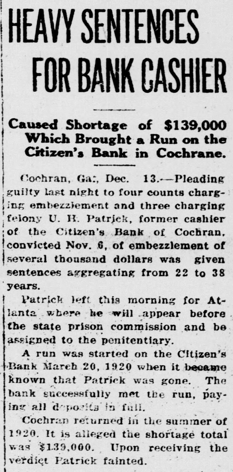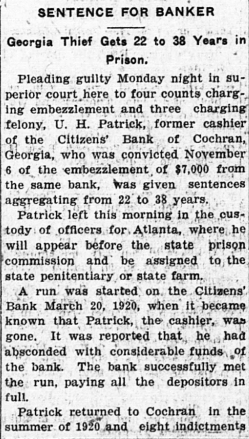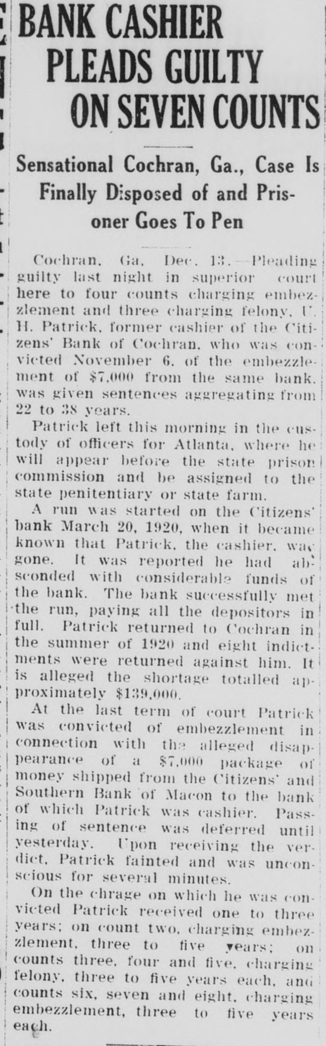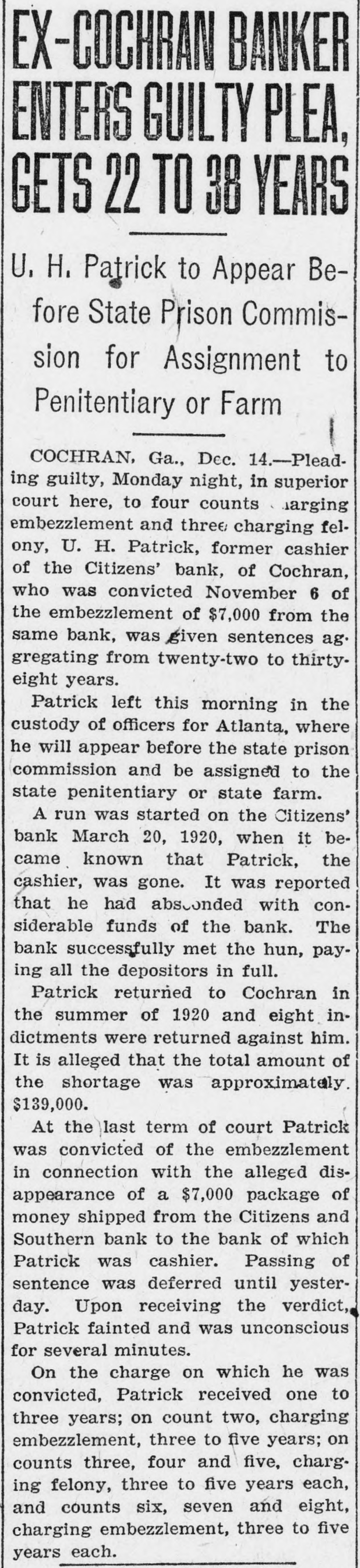 EX-COCHRAN BANKER ENTERS GUILTY PLEA, GETS 22 TO 38 YEARS U.H. Patrick to Appear Before State Prison Commission for Assignment to Penitentiary or Farm COCHRAN, Ga., Dec. 14.-Pleading guilty, Monday night, in superior court here, to four counts marging embezzlement and three charging felony, U. H. Patrick, former cashier of the Citizens' bank, of Cochran, who was convicted November 6 of the embezzlement of $7,000 from the same bank, was given sentences ag. gregating from twenty-two to thirtyeight years. Patrick left this morning in the custody of officers for Atlanta, where he will appear before the state prison commission and be assigned to the state penitentiary or state farm. A run was started on the Citizens' bank March 20, 1920, when it became known that Patrick, the cashier, was gone. It was reported that he had absconded with considerable funds of the bank. The bank successfully met the hun, paying all the depositors in full. Patrick returned to Cochran in the summer of 1920 and eight indictments were returned against him. It is alleged that the total amount of the shortage was approximately $139,000. At the last term of court Patrick was convicted of the embezzlement in connection with the alleged disappearance of a $7,000 package of money shipped from the Citizens and Southern bank to the bank of which Patrick was cashier. Passing of sentence was deferred until yesterday. Upon receiving the verdict, Patrick fainted and was unconscious for several minutes. On the charge on which he was convicted, Patrick received one to three years; on count two, charging embezzlement, three to five years; on counts three, four and five, charging felony, three to five years each, and counts six, seven and eight, charging embezzlement, three to five years each.