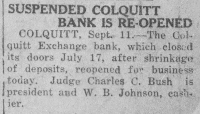 SUSPENDED COLQUITT BANK IS RE-OPENED COLQUITT, Sept. 11.-The Col. quitt Exchange bank, which closed its doors July 17, after shrinkage of deposits, reopened for business today. Judge Charles C. Bush is president and W. B. Johnson, cash. ier.