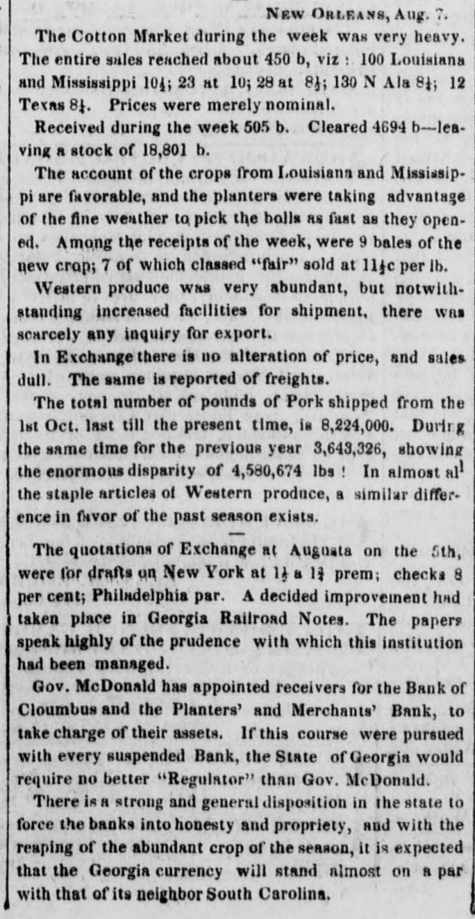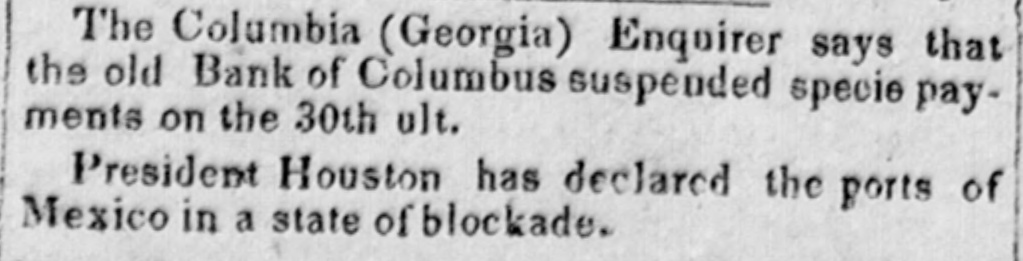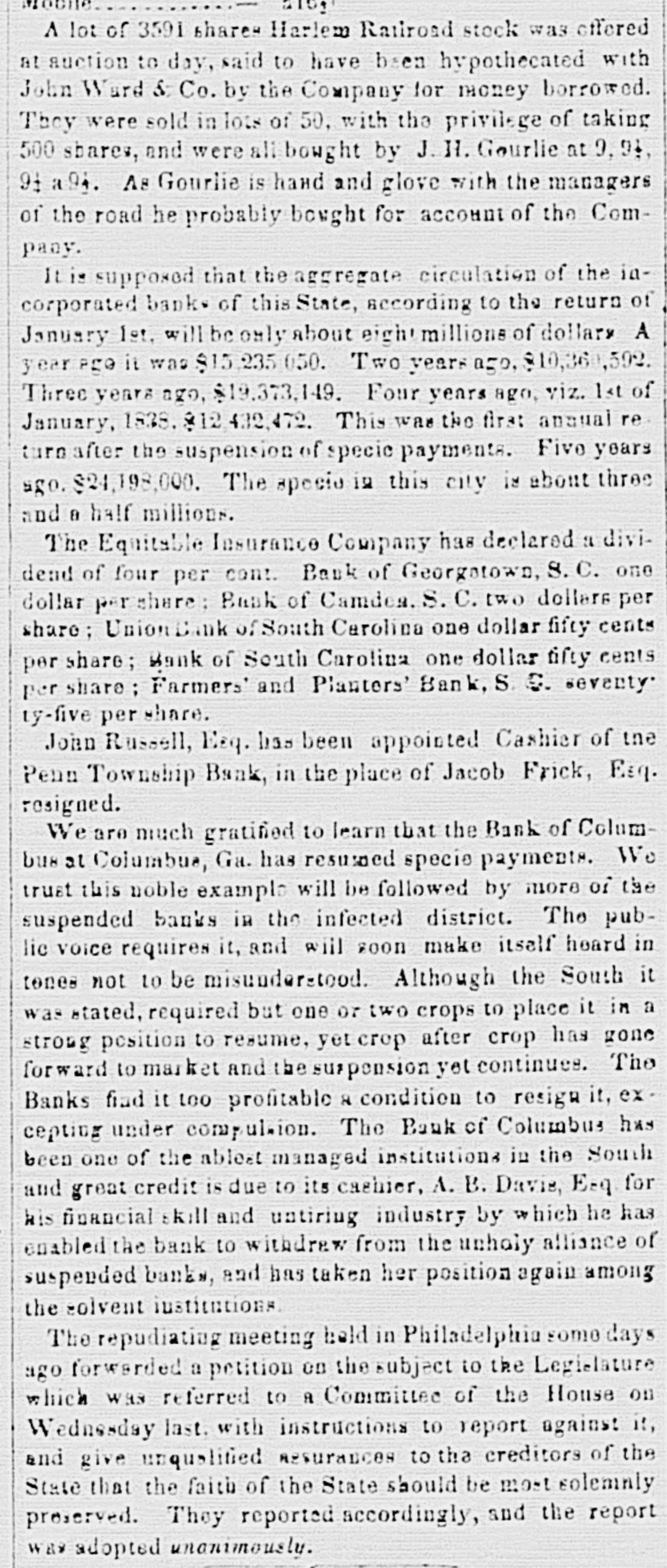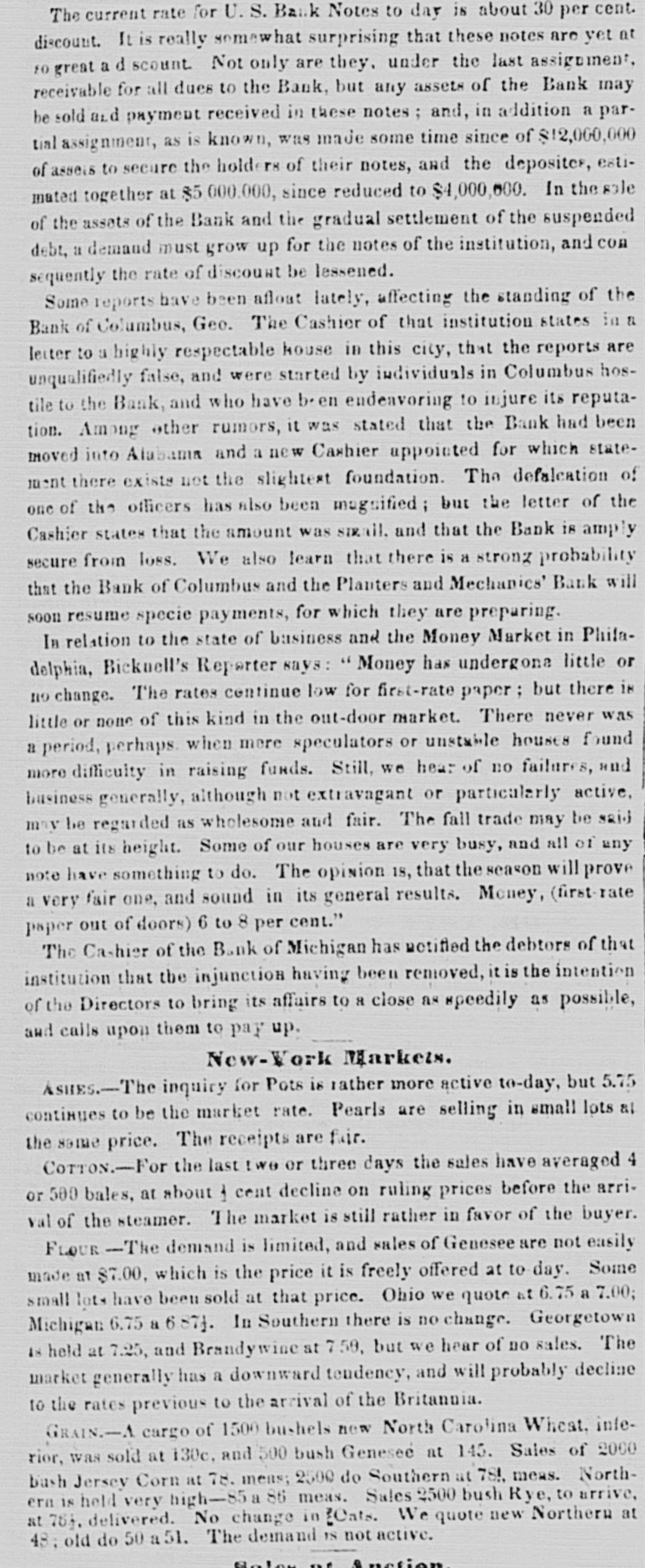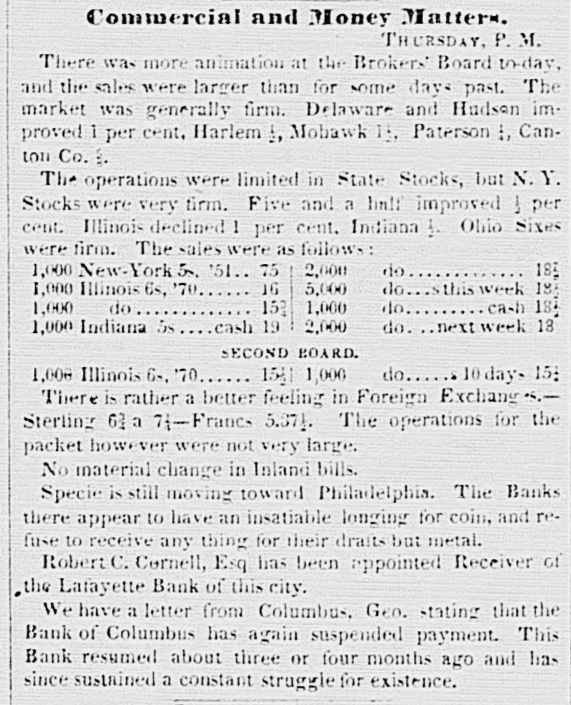 This bond is endorsed as follows :" For value received, the BANK OF THE UNITED STATES guarantees the paymant of the principal and interest of the within bond in the manner specified there. in. J. COWPERTHWAITE, Cashier. BANK OF THE U.S. Oct. 1st, 1838." The bond is further endorsed, " Richard Alsop."These bonds, to the number of 312, fell due as specified, on the 1st inst. and on application to Jas. Iddings, As sistant Cashier of the Bank of the United States in New York, payment was refused, and at the request of J.E. Thayer, protest was made, and notices served on the following persons :-" Richard Alsop.Esq. Philadelphia; " Bank of the United States, Philadelphia, Pennsylvania ;" Jas. Robertson, Esq., President, and Thos. E. Tay. lor, Cashier of the U. S. Bank, Pa.; " The Planters Bank of the State of Mississippi, Natchez, Miss." These bonds are mostly held in Boston, and when negotiated in this market, it was understood Mr. Alsop was to receive the proceeds-he now, however, resists payment as endorser, because the bond purports to be sealed, although a close observer could discover no seal upon the instrument : suits were immediately commenced against him in the United States Court; and as we before stated, the rents of the U. S. Bank building in New York, were at tached. Since then the farm and other property of Mr. Alsop, in Connecticut, have been attached. The eastern creditors have long enough been harrassed by the practical repudiation, insolvency and dishonor of Pennsylvania, and seem now determined to have justice if the protection of the federal government can give it. In the Stock market affairs are very gloomy and prices again fellte-day-Delaware and Hudson 1 & per cent; Illinois 6 per cent, 1; Bank of Commerce Scrip 2 per cent; Harlemt; Mohawk R. R. 2 per cent; Canton 1; sales of bills on Philadelphia 41 a5; Baltimore 4; Mobile 17; New Orleans 10. Another sacrifice of the State credit was made at auction to-day to feed that vampyre, the Erie Rail Road, in the shape of $100,000, 6 per cent stocks. The effect of these repeatedly forced sales, may be seen in the fact that New York State 6 per cents, redeemable next June, were sold at the board at 96, which is equal to 14 per cent per annum on the investment. The Delaware and Raritan Canal and Camden and Amboy Railroad Transportation Company have declared a dividend of three per cent for the last six months, pay. able on the 15th inst. The Paterson and Hudson Railroad Company have this day declared a dividend of two and a half per cent, payable on the 20th inst. The Connecticut River Banking Company has declared a dividend of three per cent for the last six months, payable on the 10th inst. The Connecticut River Company has. declared a dividend of two dollars and fl fty cents, pay able on the 10th inst. Bela Latham, William Conclin, and E. W. Hubbard, have been appointed Bank Commis sioners for the State of Ohio. The Bank of Columbus, Geo., has withdrawn from the list of suspended institutions, and has resumed specie payments. A creditable move, and one which we trust will be extensively followed. The Farmers' Bank of Orleans, a free Bank, having failed, the Comptreller has issued a notice to that effect. The affairs of the Bank are stated as follows:FARMERS' BANK OF ORLEANS. Amount of circulating notes registered and is. sued to the Bank, $85,385 $78 650 Secured by bonds and mortgages stocks-Indiana 5's 75.000 $153,650 The bills at the best are, therefore, worth but 70 cents on the dollar. John Brough, Esq., auditor of the State of Ohio, has, in a letter utterly denied any connection with that ex ploded concern, the Lebanon Miami Bank. The State Bank of Illinois has issued the following notice STATE BANK OE ILLINOIS,? Dec. 29th, 1841. At a meeting of the Directors of this Bank, held on the 21st inst. the following preamble and resolution were adopted, viz: Whereas a circular has been received from the President of the State Bank of Indiana, setting forth that the said bank will be prepared to unite with the banks of Ohio and Kentucky in the resumption of specie pay. ment, on the first day of August next :-Therefore, Resolved. That the State Bank of Illinois and its Branches will be prepared to join with the banks of Ohio, Indiana and Kentucky in the resumption of specie payment, en the said 1st of August next." By order of the Board, N.H.RIDGELY,Cashier. This amounts to nothing. The same professions have been made these three years. The banks are never all ready at the same time. The following was the condition of the Bank on the 13th November last, as compared with the previous year STATE BANK OF ILLINOIS