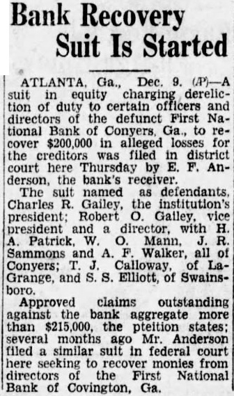 Bank Recovery Suit Is Started ATLANTA. Ga., Dec. 9. (P)-A suit in equity charging dereliction of duty to certain officers and directors of the defunct First National Bank of Conyers Ga., to recover $200,000 in alleged losses for the creditors was filed in district court here Thursday by E. F. Anderson, the bank's receiver. The suit named as defendants. Charles Gailey, the institution's president; Robert O. Gailey. vice president and a director. with H. A. Patrick. W. O. Mann. J. R. Sammons and A. F. Walker, all of Conyers; T. Calloway, of LaGrange, and S. S. Elliott, of Swainsboro. Approved claims outstanding against the bank aggregate more than $215,000. the pteition states: several months ago Mr. Anderson filed similar suit in federal court here seeking to recover monies from directors of the First National Bank of Covington, Ga.