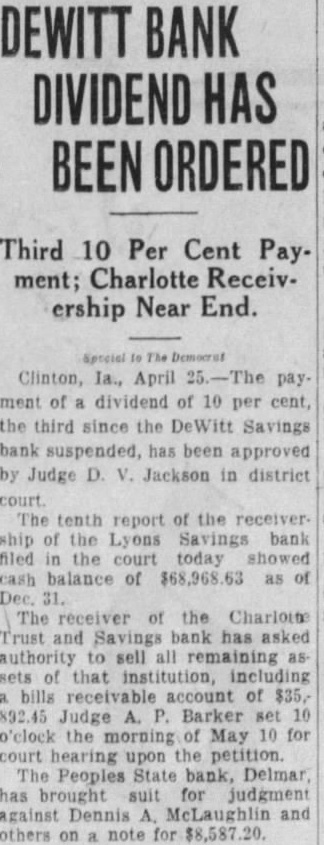DEWITT BANK DIVIDEND HAS BEEN ORDERED Third 10 Per Cent Payment; Charlotte Receivership Near End. Clinton, la., April 25.-The pay. ment of dividend of 10 per cent, the third since the DeWitt Savings bank suspended, has been approved by Judge D. V. Jackson in district court. The tenth report of the receiver ship of the Lyons Savings bank filed the court today showed cash balance of $68,968.63 as of Dec. The receiver of the Charlotte Trust and Savings bank has asked authority to sell all remaining as sets of that institution, including bills receivable account of $35,892.45 Judge A. P. Barker set 10 o'clock the morning of May 10 for court hearing upon the petition. The Peoples State bank, Delmar, has brought suit judgment against Dennis A. McLaughlin and others on a note for $8,587.20.