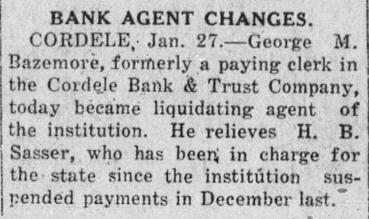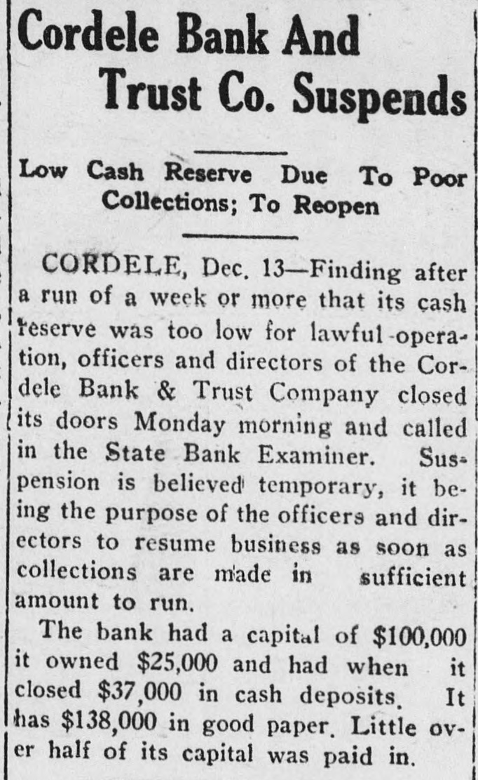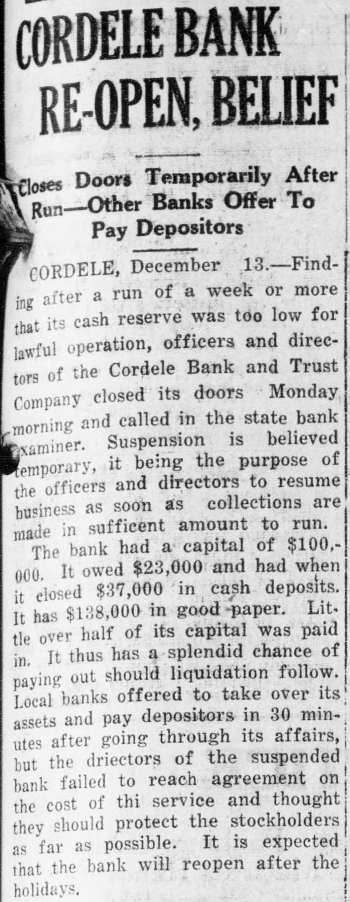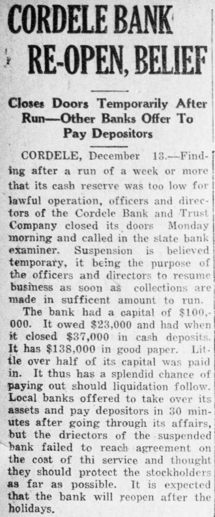 CORDELE BANK RE-OPEN, BELIEF Closes Doors Temporarily After Run-Other Banks Offer To Pay Depositors CORDELE, December 13.-Finding after a run of a week or more that its cash reserve was too low for lawful operation, officers and directors of the Cordele Bank and Trust Company closed its doors Monday morning and called in the state bank examiner. Suspension is believed temporary, it being the purpose of the officers and directors to resume business as soon as collections are made in sufficent amount to run. The bank had a capital of $100, 000. It owed $23,000 and had when it closed $37,000 in cash deposits. It has $138,000 in good paper. Lit. tle over half of its capital was paid in. It thus has a splendid chance of paying out should liquidation follow. Local banks offered to take over its assets and pay depositors in 30 minutes after going through its affairs, but the driectors of the suspended bank failed to reach agreement on the cost of thi service and thought they should protect the stockholders as far as possible. It is expected that the bank will reopen after the holidays.