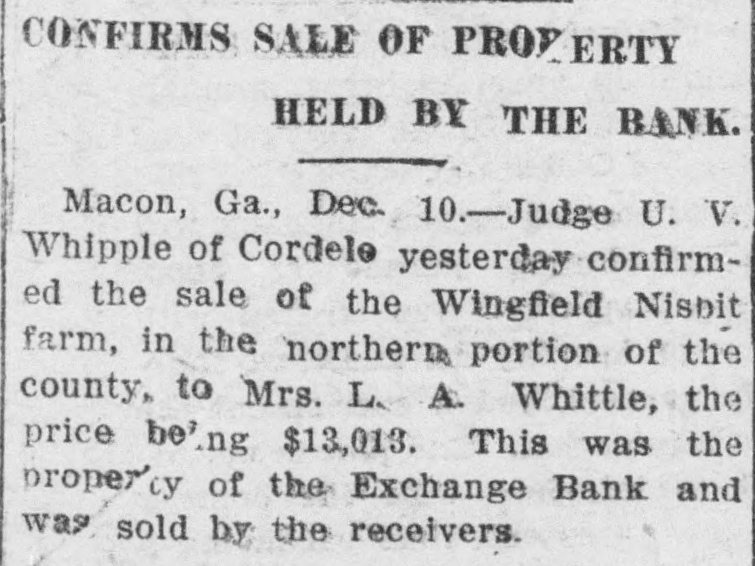 CONFIRMS SALE OF PROP ERTY HELD BY THE BANK. Macon, Ga., Dec. 10.-Judge U. V. Whipple of Cordelo yesterday confirmed the sale of the Wingfield Nisbit farm, in the northerm portion of the county, to Mrs. L. A. Whittle, the price be'.ng $13,013. This was the proper' cy of the Exchange Bank and was sold by the receivers.