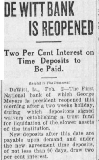 REOPENED Two Per Cent Interest on Time Deposits to Be Paid. DeWitt, Feb. First National bank which George Meyers president reopened after weeks holiday, morning which depositors signed during establishing trust fund waivers slower assets for liquidation the institution. New deposits after this date are demand and under payable agreement time deposits, less than 90 days, cent interest.