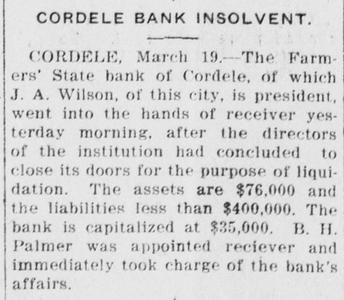 CORDELE BANK INSOLVENT. CORDELE, March 19.-The Farmers' State bank of Cordele, of which J. A. Wilson, of this city, is president, went into the hands of receiver yesterday morning, after the directors of the institution had concluded to close its doors for the purpose of liquidation. The assets are $76,000 and the liabilities less than $400,000. The bank is capitalized at $35,000. B. H. Palmer was appointed reciever and immediately took charge of the bank's affairs.