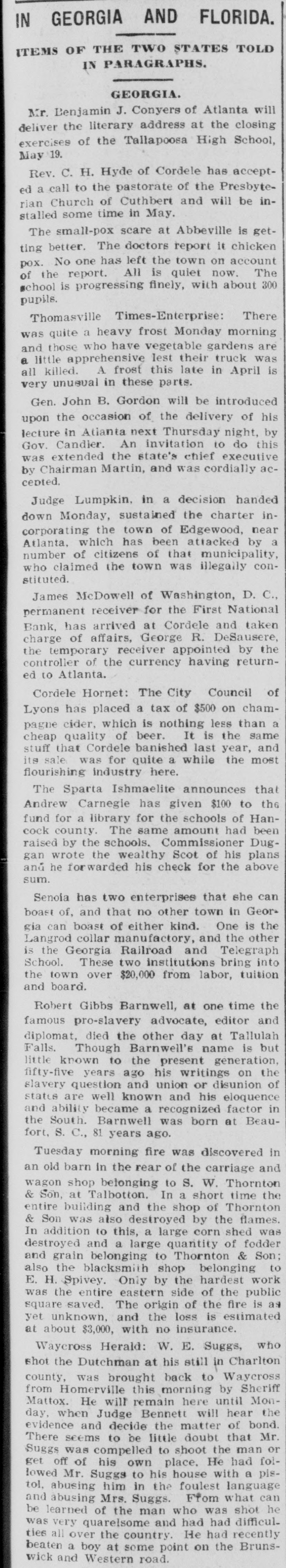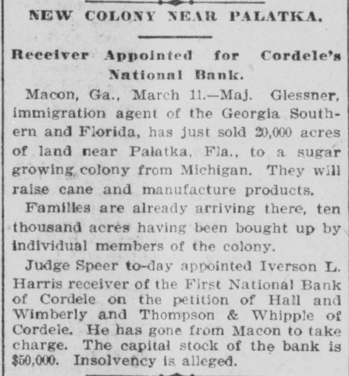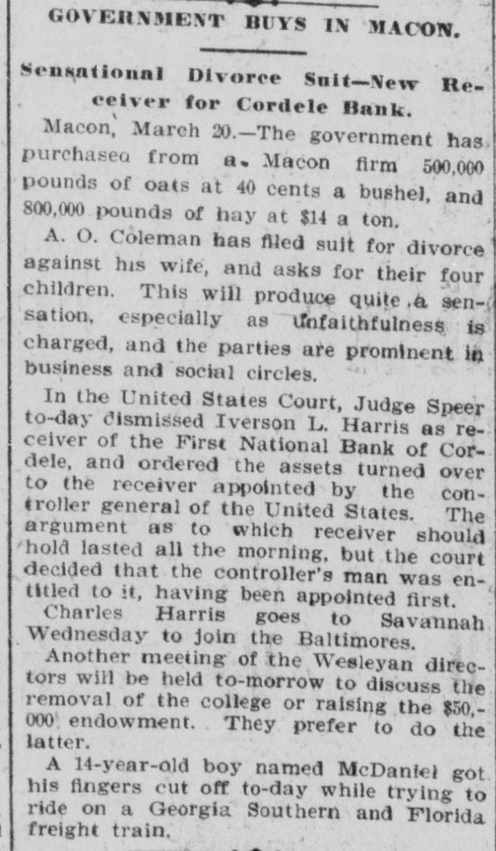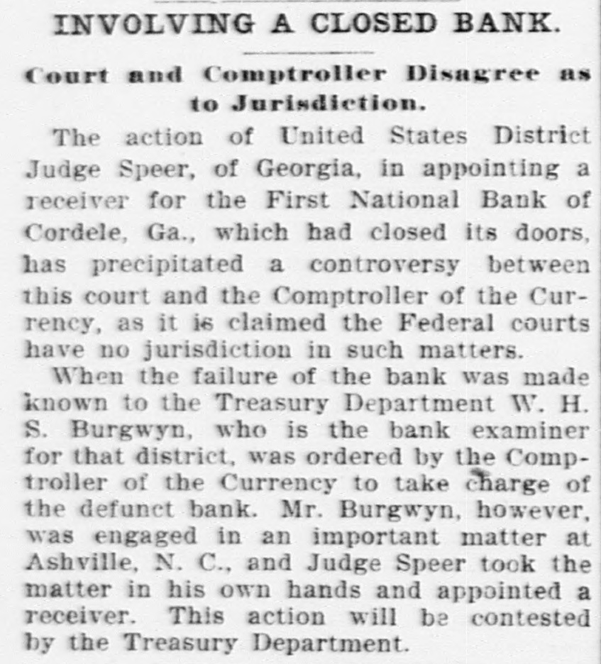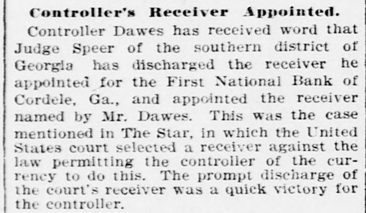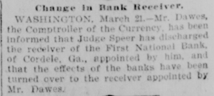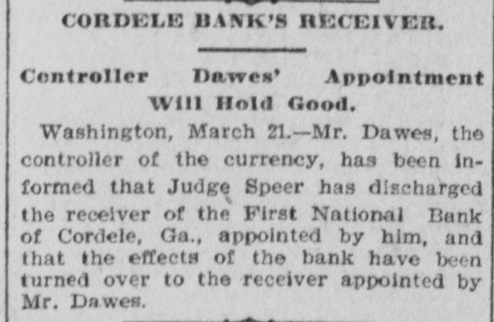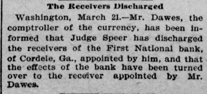 Mr. 'Dawes, the controller of the currency, has been informed that Judge Speer has discharged the receiver of the First National Bank of Cordele, Ga., appointed by him, and that the effects of the bank have been turned over to the receiver appointed by Mr. Dawes.