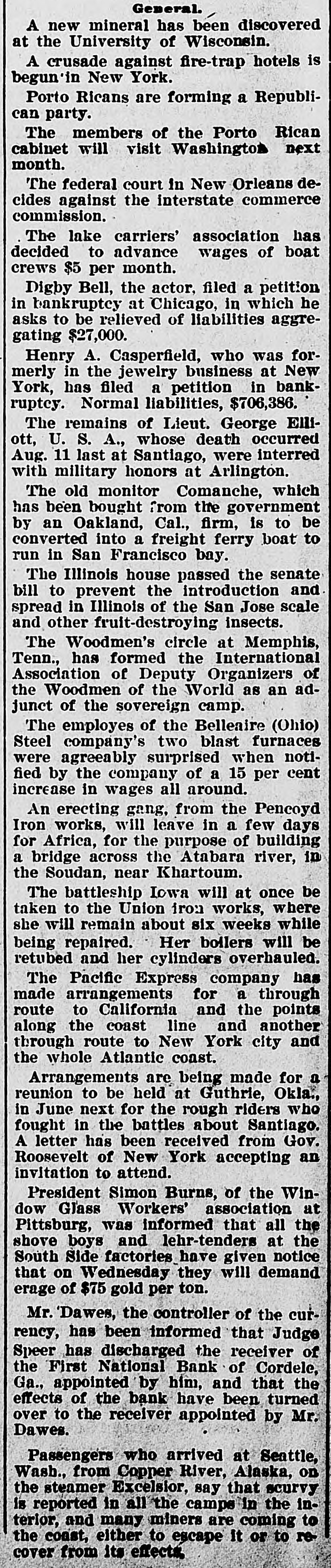 Passengers who arrived at Seattle, Wash., from Copper River, Alaska, on the steamer Excelsior, say that scurvy is reported in all the camps in the interior, and many miners are coming to the coast, either to escape it or to recover from its effects.