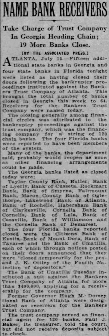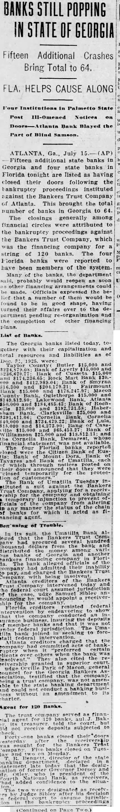 BANKS STILL POPPING IN STATE OF GEORGIA Fifteen Additional Crashes Bring Total to 64. FLA, HELPS CAUSE ALONG Four Institutions in Palmetto State Post III-Omened Notices on Bank Blayed the Part of Blind Samson. ATLANTA, Ga., July (AP) Fifteen additional state banks in Georgia and four state banks in Florida tonight are Tisted as having closed their doors following the bankruptcy proceedings instituted against Bankers Trust Company of Atlanta. This brought the total number of banks in Georgia to 64. The closings generally among financial circles were attributed to the bankruptcy proceedings against the Bankers Trust Company, which was the financing company for a string of 120 banks. The four Florida banks were reported to have been members of the system. Many of the banks, the department probably would reopen as soon other financing arrangements could made. Officials the belief that number of them would be found be good shape, having turned their affairs over to the department pending re-organization and the completion of other financing plans. List Banks. The Georgia banks listed today. tocapitalization and total resources and liabilities as County Butler $15,000 and Bank Cusseta Mart and of $16,300 Bank Macon Atlanta Bank of Roch$25,000 and HaberCornelia Bank. and of Lula, Bang and Cornelia Bank, Demarest, statement was four Floriad reported The the Citizen Bank EusBank Mount Dora, Bank Bank through notices posted they their temporarily protecUmatilla Tuesday inThe Bank against the Bankers suit Trust for obtaining injunction ficials of the company any which it acted as financing agent. oning of Trouble. In its suit. the Umatilla Bank leged the hundred from the bank distributed the money among Georgia another FloriThe alleged company had their Bankers Trust being Atlanta creditors of the the federal Siblev Samuel nouncing would udge appoint receiverresisted federal creditors show that the the deposits that federal The Uma- foretilla joined that the Atlanta company committed when the bank was They also cited the in superior court. the that company. trust amenwithout an amendment its Agent for 120 Banks. for 120 told banks. court. but not receive deposits subjected to banks closed Trust closed on TuesBennett of the state that former added confidence to the situaJudge his decision (Continued on Page Two.)