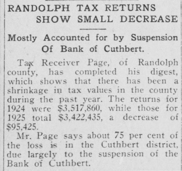 # RANDOLPH TAX RETURNS # SHOW SMALL DECREASE Mostly Accounted for by Suspension Of Bank of Cuthbert. Tax Receiver Page, of Randolph county, has completed his digest, which shows that there has been a shrinkage in tax values in the county during the past year. The returns for 1924 were $3,517,860, while those for 1925 total $3,422,435, a decrease of $95,425. Mr. Page says about 75 per cent of the loss is in the Cuthbert district, due largely to the suspension of the Bank of Cuthbert.