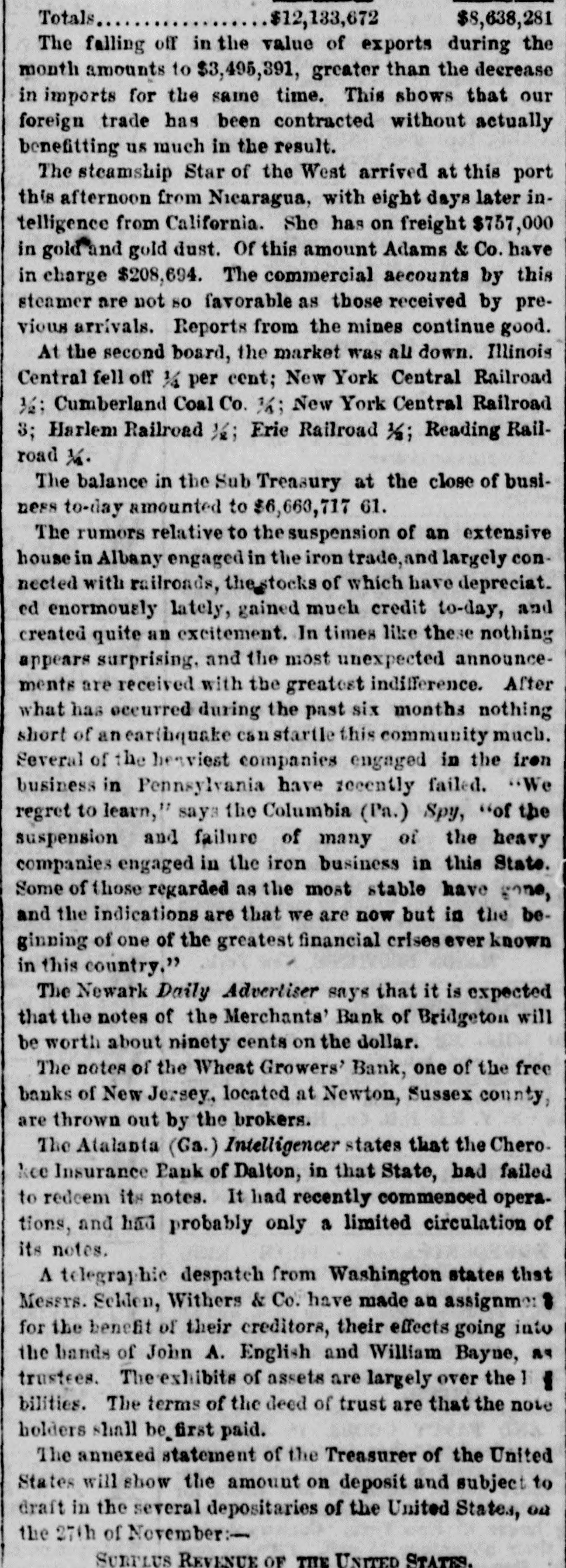Totals $8,638,281 $12,133,672 The falling off in the value of exports during the month amounts to $3,495,391, greater than the decrease in imports for the same time. This shows that our foreign trade has been contracted without actually benefitting us much in the result. The steamship Star of the West arrived at this port this afternoon from Nicaragua, with eight days later intelligence from California. She has on freight $757,000 in gold and gold dust. Of this amount Adams & Co. have in charge $208,694. The commercial accounts by this steamer are not so favorable as those received by previous arrívals. Reports from the mines continue good. At the second board, the market was all down. Illinois Central fell off 1/4 per cent; New York Central Railroad 36; Cumberland Coal Co. %; New York Central Railroad 3; Harlem Railroad 1/2; Erie Railroad 1/2; Reading Railroad 1/2. The balance in the Sub Treasury at the close of business to-day amounted to $6,660,717 61. The rumors relative to the suspension of an extensive house in Albany engaged in the iron trade, and largely connected with railroads, the stocks of which have depreciat. ed enormously lately, gained much credit to-day, and created quite an excitement. In times like these nothing appears surprising, and the most unexpected announcements are received with the greatest indifference. After what has occurred during the past six months nothing short of an earihquake can startle this community much. Several of the beaviest companies engaged in the iron business in Pennsylvania have recently failed. "We regret to learn," says the Columbia (Pa.) Spy, "of the suspension and failure of many of the heavy companies engaged in the iron business in this State. Some of those regarded as the most stable have gone, and the indications are that we are now but in the beginning of one of the greatest financial crises ever known in this country." The Newark Daily Advertiser says that it is expected that the notes of the Merchants' Bank of Bridgeton will be worth about ninety cents on the dollar. The notes of the Wheat Growers' Bank, one of the free banks of New Jersey, located at Newton, Sussex county, are thrown out by the brokers. The Atalanta (Ga.) Intelligencer states that the Cherokee Insurance Pank of Dalton, in that State, had failed to redeem its notes. It had recently commenced operations, and had probably only a limited circulation of its notes. A telegraphic despatch from Washington states that Messrs. Selden, Withers & Co. have made an assignme: 8 for the benefit of their creditors, their effects going into the bands of John A. English and William Bayne, as trustees. The exhibits of assets are largely over the 1 1 bilities. The terms of the deed of trust are that the note holders shall be. first paid. The annexed statement of the Treasurer of the United States will show the amount on deposit and subject to draft in the several depositaries of the United States, on the 27th of November:SURPLUS REVENUE OF THE UNITED STATES.
