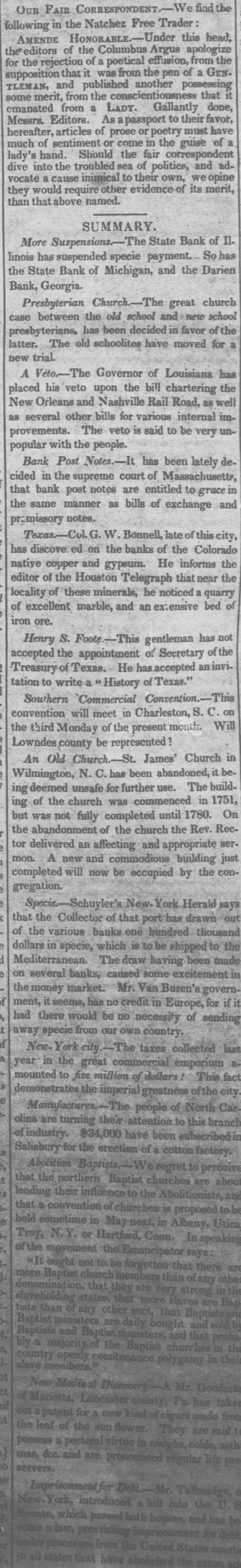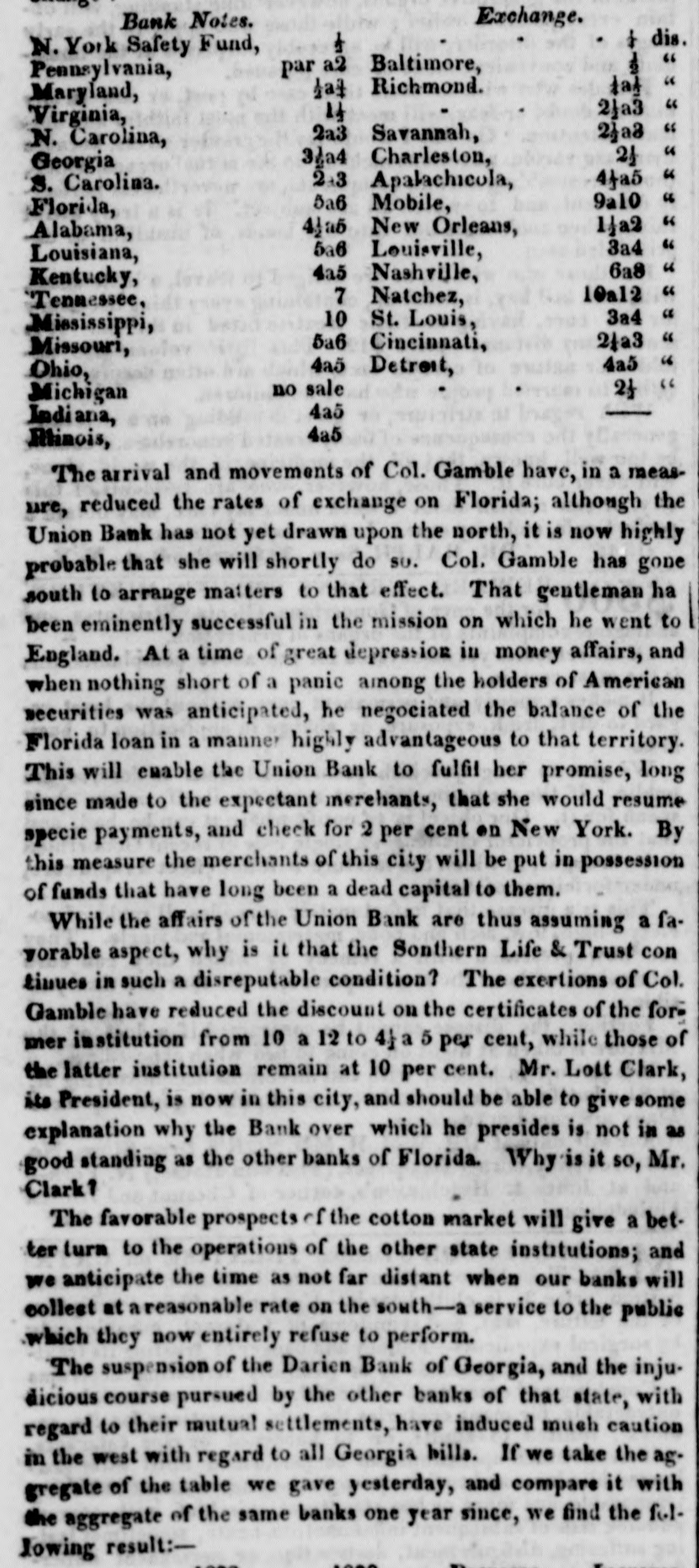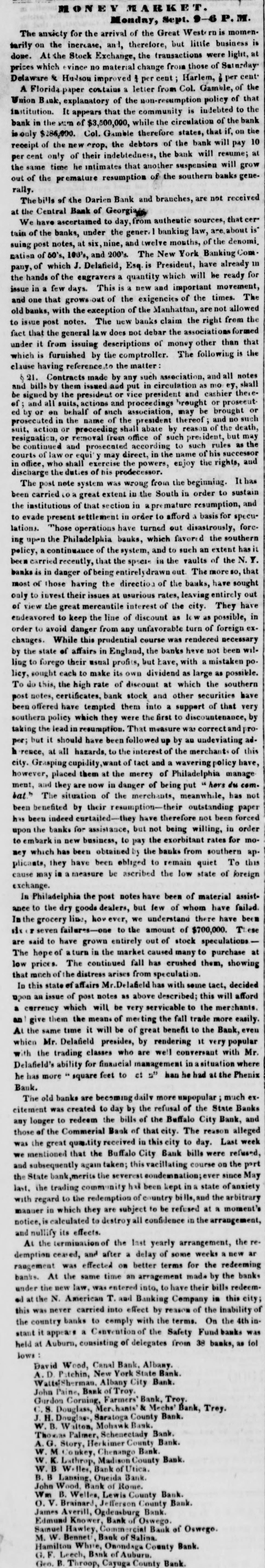N E V VE A R K Monday, Sept. 9-6 P.M. The anxicty for the arrival of the Great West rn is momentarily on the increase, and, therefore, but little business is done. At the Stock Exchange, the transactions were light, at prices which evince no material change from those of Saturday Delaware & Hudson improved 1 per cent Harlem, 1 per cent A Florida paper contains a letter from Col. Gamble, of the Union Bank, explanatory of the non-resumption policy of that institution. It appears that the community is indebted to the bank in the sum of $3,500,000, while the circulation of the bank is only $286,000. Col. Gamble therefore states, that if, on the receipt of the new crop, the debtors of the bank will pay 10 per cent only of their indebtedness, the bank will resume; at the same time he intimates that another suspension will grow out of the premature resumption of the southern banks generally. The bills of the Darien Bank and branches, are not received at the Central Bank of Georgia We have ascertained to day, from authentic sources, that cer tain of the banks, under the gener.l banking law, about is suing post notes, at six, nine, and twelve months, of the denomi, nation of 50's, 100's, and 200's. The New York Banking Com pany, of which J. Delafield, Esq. is President, have already in the hands of the engravers a quantity which will be ready for issue in few days. This is a new and important movement, and one that grows out of the exigencies of the times. The banks, with the exception of the Manhattan, are not allowed to issue post notes. The new banks claim the right from the fact that the general law does not debar the associations formed under it from issuing descriptions of money other than that which is furnished by the comptroller. The following is the clause having reference. to the matter 621. Contracts made by any such association, and all notes and bills by them issued and put in circulation as mo ey, shall be signed by the president or vice president and cashier the of and all suits, actions and proceedings brought or prosecut. ed by or on behalf of such association, may be brought or prosecuted in the name of the president thereof and no such suit, action or proceeding shall abate by reason of the death, resignation, or removal from office of such president, but may be continued and prosecated according to such rules as the courts of law or equit y may direct, in the name of his successor in office, who shall exercise the powers, enjoy the rights, and discharge the duties of his prodecessor. The post note system was wrong from the beginning. It has been carried to great extent in the South in order to sustain the institutions of that section in apremature resumption, and to evade present settlement in order to afford a basis for speculations. "hose operations have turned out disastrously, forc. ing upen the Philadelphia banks, which favored the southern policy, a continuance of the system, and to such an extent has it been carried recently, that the specie in the vaults of the N.Y. banks is in danger of being entirely drawn out. The more so, that most of those having the direction of the banks, have sought only to invest their issues at usurious rates, leaving entirely out of view the great mercantile interest of the city. They have endeavored to keep the line of discount as la w as possible, in order to avoid danger from any unfavorable turn of foreign exchanges. While this prudential course was rendered necessary by the state of affairs in England, the banks have not been willing to forego their usual profits, but have, with a mistaken po. licy, sought each to make its own dividend as large as possible. To do this, the high rate of discount at which the southern post notes, certificates, bank stock and other securities have been offered have tempted them into a support of that very southern policy which they were the first to discountenance, by taking the lead in resumption. That measure was correct and proper; but it should have been followed up by au undeviating ad. h rence, at all hazards, to the interest of the merchant of this city. Grasping cupidity, want of tact and a wavering policy have, however, placed them at the merey of Philadelphia manage ment, and they are now in danger of being put " hers du com. bat." The situation of the merchants, meanwhile, has not been benefited by their resumption-their outstanding paper has been indeed curtailed-they have therefore not been forced upon the banks for assistance, but not being willing, in order to embark in new business, to pay the exorbitant rates for momey which has been obtained by the banks from southern ap. plicants, they have been obliged to remain quiet To this cause may is a measure be ascribed the low state of foreign exchange. la Philadelphia the post notes have been of material assistance to the dry goods dealers, but few of whom have failed. In the grocery line, how ever, we understand there have been r seven failures. one to the amount of $700,000. These are said to have grown entirely out of stock speculations The hope of aturn in the market caused many to purchase at low prices. The continued fall has crushed them, showing that much of the distress arises from speculation. In this state of affairs Mr. Delaheld has with some tact, decided upon an issue of post notes as above described; this will afford a currency which will be very servicable to the merchants. an give them the mean. of meeting the fall trade more easily. At the same time it will be of great benefit to the Bank, even which Mr. Delafield presides, by rendering it very popular with the trading classes who are well conversant with Mr. Delafield's ability for financial management in asituation where he has more square feet to ct 2" han he had at the Phenix Bank. The old banks are becoming daily more unpopular much excitement was created to day by the refusal of the State Banks any longer to redeem the bills of the Buffalo City Bank, and those of the Co