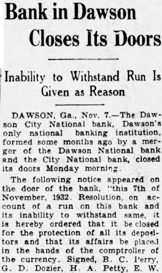 Bank in Dawson Closes Its Doors Inability to Withstand Run Is Given as Reason DAWSON Ga., Nov. 7.-The Dawson City National bank, Dawson's only national banking institution, formed some months ago by merger of the Dawson National bank the City National bank, closed its doors Monday morning The following notice appeared on the door the bank, "this 7th of November, 1932 Resolution on account of run bank and its inability to withstand same is hereby ordered that it be closed for the protection of all its depositors and that its affairs be placed in the hands of the comptroller of the currency. Signed, B. Perry, G. D. Dozier, H. A. Petty. E. W.