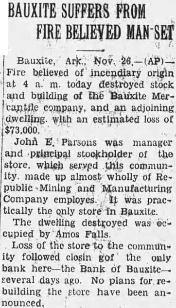 BAUXITE SUFFERS FROM FIRE BELIEVED Bauxite, Ark., Nov. Fire believed of incendiary origin at 4 a. m. today destroyed stock and building of the Bauxite Mercantile company, and an adjoining dwelling with an estimated loss of $73,000. John E. Parsons was manager and principal stockholder of the store, which served this community made up almost wholly of Republic Mining and Manufacturing Company employes. It was practically the only store in Bauxite. The dwelling destroyed was OCcupied by Amos Falls. Loss of the store to the community followed closin gof the only bank here-the Bank of Bauxiteseveral days ago. No plans for rebuilding the store have been announced,