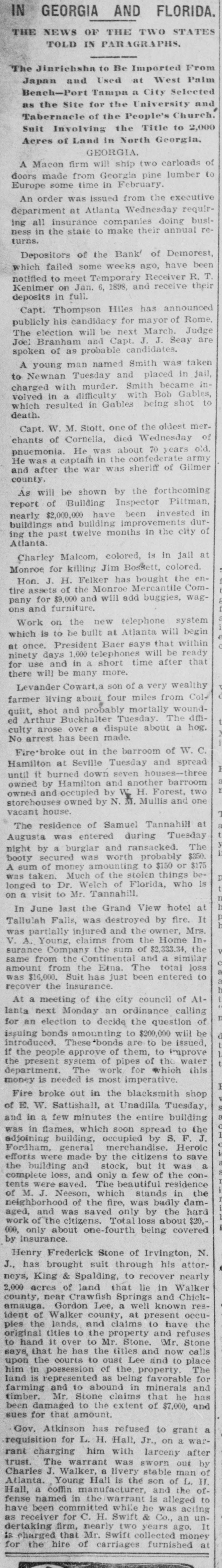 IN GEORGIA AND FLORIDA. THE NEWS OF THE TWO STATES TOLD IN PARAGRAPHS. The Jinrichsha to Be Imported From Japan and Used at West Palm Beach-Port Tampa a City Selected as the Site for the University and Tabernacle of the People's Church. Suit Involving the Title to 2,000 Acres of Land in North Georgia. GEORGIA. A Macon firm will ship two carloads of doors made from Georgia pine lumber to Europe some time in February. An order was issued from the executive department at Atlanta Wednesday requiring all insurance companies doing business in the state to make their annual returns. Depositors of the Bank' of Demorest, which failed some weeks ago, have been notified to meet Temporary Receiver R. T. Kenimer on Jan. 6, 1898, and receive their deposits in full. Capt. Thompson Hiles has announced publicly his candidacy for mayor of Rome. The election will be next March. Judge Joel Branham and Capt. J. J. Seay are spoken of as probable candidates. A young man named Smith was taken to Newnan Tuesday and placed in jail, charged with murder. Smith became involved in a difficulty with Bob Gables, which resulted in Gables being shot to death. Capt. W. M. Stott, one of the oldest merchants of Cornelia, died Wednesday of pnuemonia. He was about 70 years old. He was a captain in the confederate army and after the war was sheriff of Gilmer county. As will be shown by the forthcoming report of Building Inspector Pittman, nearly $2,000,000 have been invested in buildings and building improvements during the past twelve months in the city of Atlanta. Charley Malcom, colored, is in jail at Monroe for killing Jim Bossett, colored. Hon. J. H. Felker has bought the entire assets of the Monroe Mercantile Company for $9,000 and will add buggies, wagons and furniture. Work on the new telephone system which is to be built at Atlanta will begin at once. President Baer says that within ninety days 1,000 telephones will be ready for use and in a short time after that there will be many more. Levander Cowart,a son of a very wealthy farmer living about four miles from Colquitt, shot and probably mortally wounded Arthur Buckhalter Tuesday. The dfficulty arose over a dispute about a hog. No arrest has been made. Fire*broke out in the barroom of W. C. Hamilton at Seville Tuesday and spread until it burned down seven houses-three owned by Hamilton and another barroom owned and occupied by W. H. Forest, two storehouses owned by N. M. Mullis and one vacant house. The residence of Samuel Tannahill at Augusta was entered during Tuesday night by a burglar and ransacked. The booty secured was worth probably $350. A sum of money amounting to $150 or $175 was taken. Much of the stolen things belonged to Dr. Welch of Florida, who is on a visit to Mr. Tannahill. In June last the Grand View hotel at Tallulah Falls, was destroyed by fire. It was partially injured and the owner, Mrs. V. A. Young, claims from the Home Insurance Company the sum of $2,333.34, the same from the Continental and a similar amount from the Etna. The total loss was $16,000. Suit has just been entered to recover the insurance. At a meeting of the city council of Atlanta next Monday an ordinance calling for an election to decide the question of issuing bonds amounting to $200,000 will be introduced. These 'bonds are to be issued, if the people approve of them, to improve the present system of pipes of the water department. The work for which this money is needed is most imperative. Fire broke out in the blacksmith shop of E. W. Sattishall, at Unadilla Tuesday, and in a few minutes the entire building was in flames, which soon spread to the adjoining building, occupied by S. F. J. Fordham, general merchandise. Heroic efforts were made by the citizens to save the building and stock, but it was a complete loss, and only a few of the contents were saved. The beautiful residence of M. J. Neeson, which stands in the neighborhood of the fire, was badly damaged, and was saved only by the hard work of the citizens. Total loss about $20,000, only about one-fourth being covered by insurance. Henry Frederick Stone of Irvington, N. J., has brought suit through his attorneys, King & Spalding, to recover nearly 2,000 acres of land that lie in Walker county, near Crawfish Springs and Chickamauga. Gordon Lee, a well known resident of Walker county, at present occupies the lands, and claims to have the original titles to the property and refuses to hand it over to Mr. Stone. Mr. Stone says, that he has the titles and now calls upon the courts to oust Lee and to place him in possession of the property The land is represented as being favorable for farming and to abound in minerals and timber. Mr. Stone claims that he has been damaged to the extent of $7,000, and sues for that amount. Gov. Atkinson has refused to grant a requisition for L. H. Hall, Jr., on a warrant charging him with larceny after trust. The warrant was sworn out by Charles J. Walker, a livery stable man of Atlanta. Young Hall is the son of L. II. Hall, a coffin manufacturer. and the offense named in the warrant is alleged to have been committed while he was acting as receiver for C. H. Swift & Co., an undertaking firm, nearly two years ago. It is charged that Mr. Swift collected money for the hire of carriages furnished at