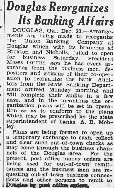 Douglas Reorganizes Its Banking Affairs being made to reorganize Union Banking Company at Douglas which with its branches at Broxton Nicholls, failed to open for business Saturday President Moses Griffin he has every surance the men, depositors citizens co-operation to reorganize the Auditors from the State Depart ment arrived Monday and will complete their audits in few days, in meantime the organization be set operaso as to conform to the plans which may be prescribed by the state superintendent of banks, A. B. Mobley Plans are being formed to open up temporary exchange collect and clear such checks as may come through the business channels of the Douglas the present. office money orders are being used remittances and the business men are requesting tions other persons to remit to Douglas by post